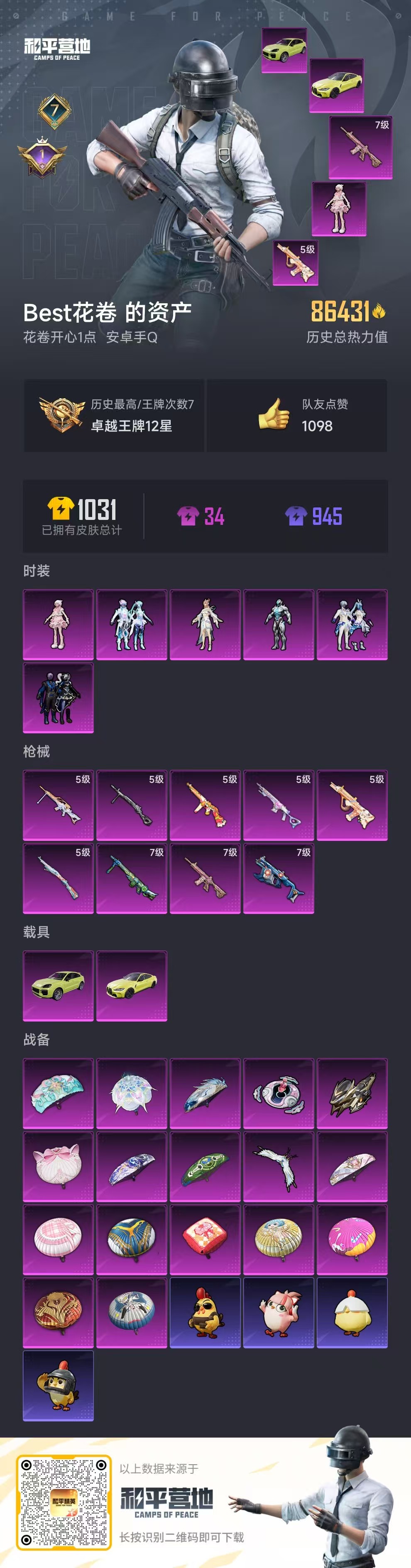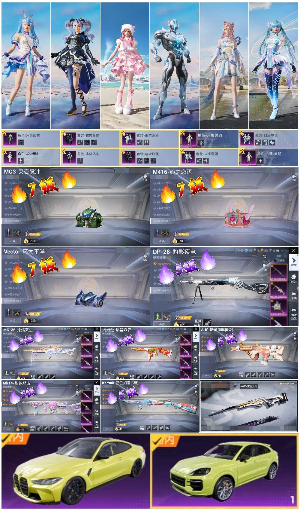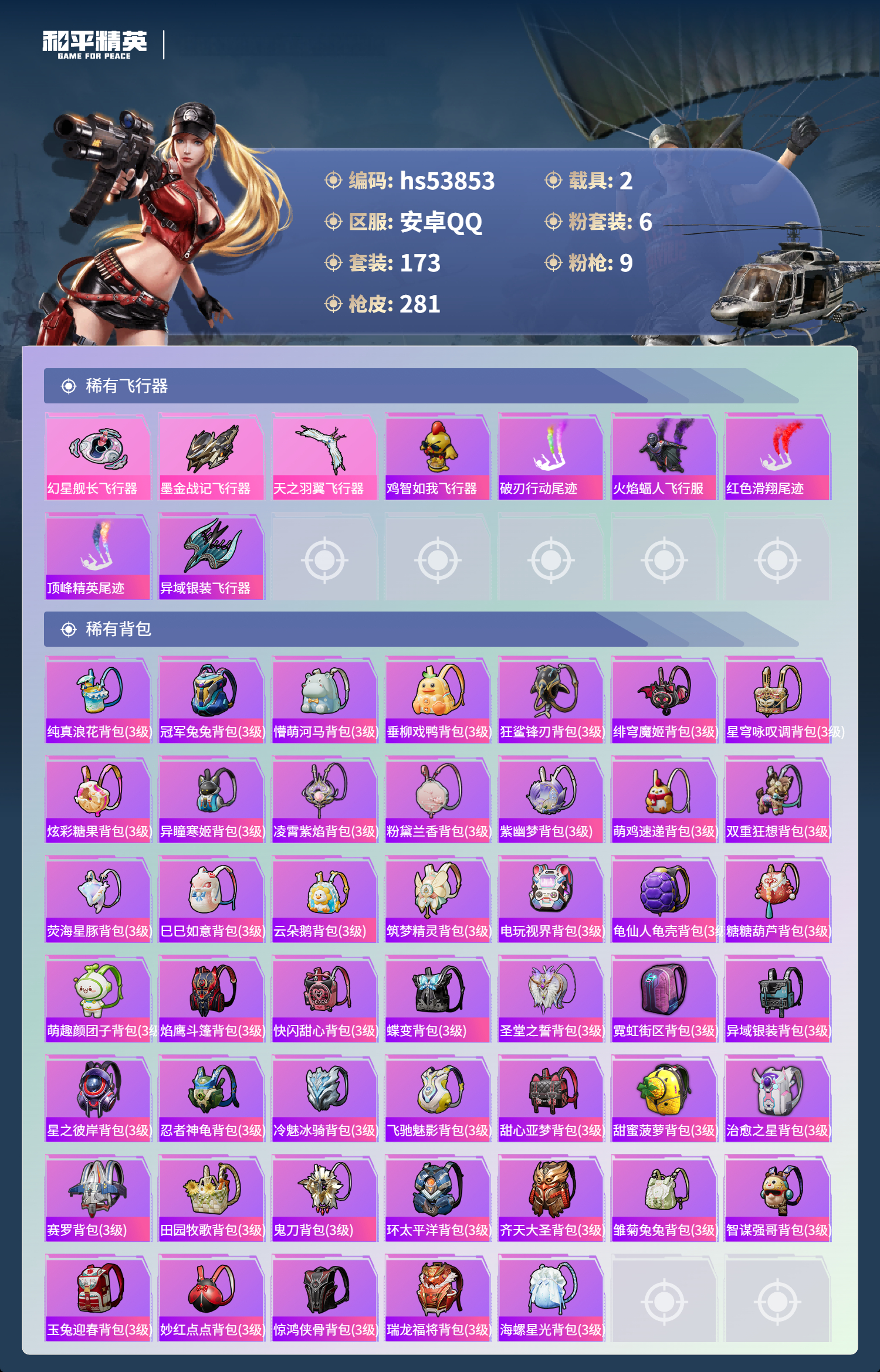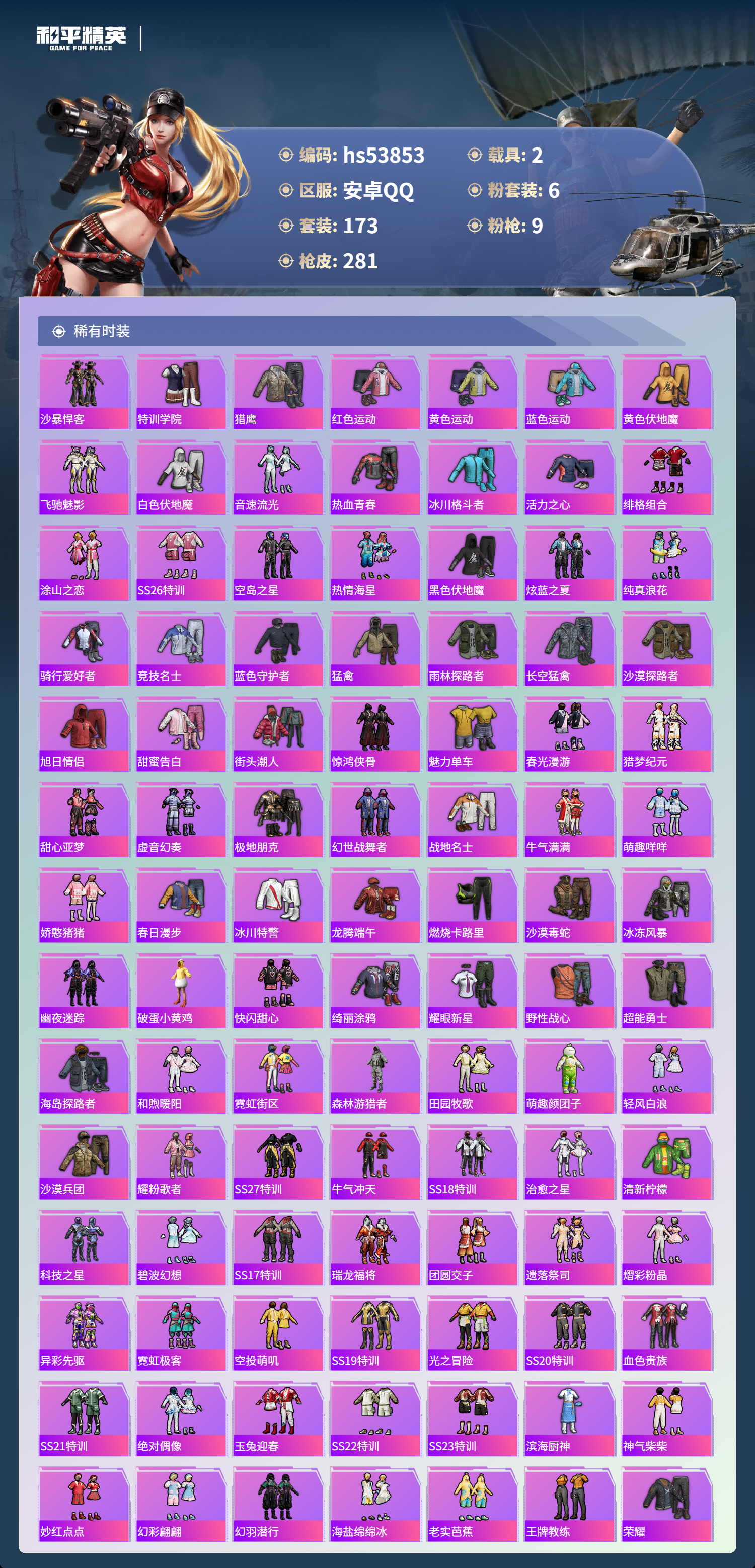hs53853 安卓手q-7王牌印记-6粉装-9特效呛-2载具-86431热力值-173套装-281呛皮-1卓越印记【6粉装】角色-羊梦糖心套装-幻彩电音套装-暗夜玫瑰角色-月影灵韵套装-未来歌姬角色-冰炎战车【9特效呛】vect-环太平洋/7级汤姆逊-热量炸弹/5级dp-28-豹影疾电/5级kar98k-巳巳如意/5级mg3-突变脉冲/7级m416-心之恋语/7级m