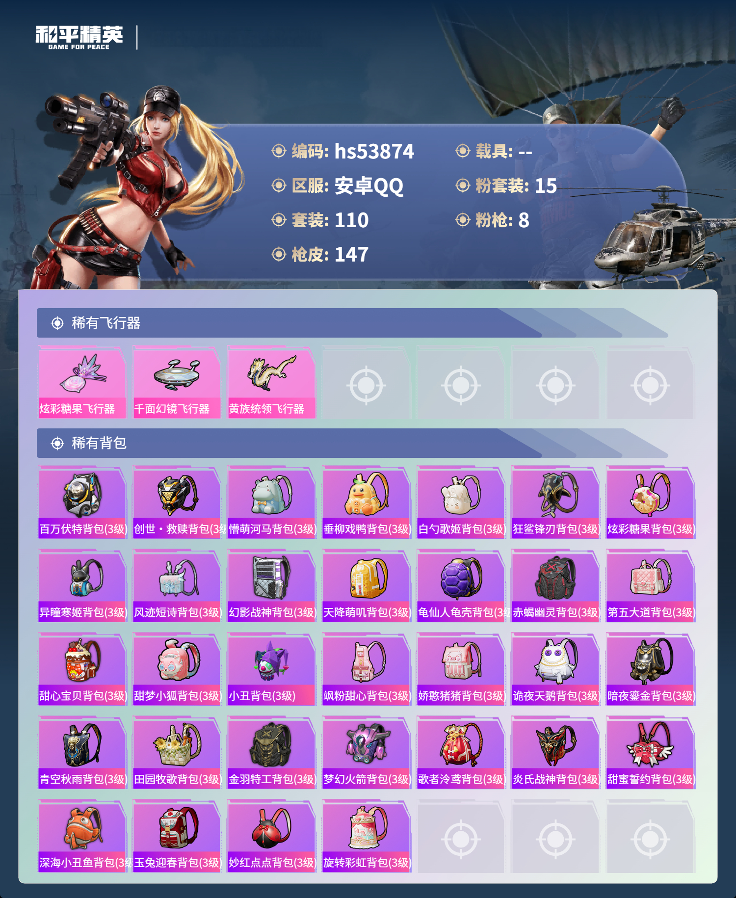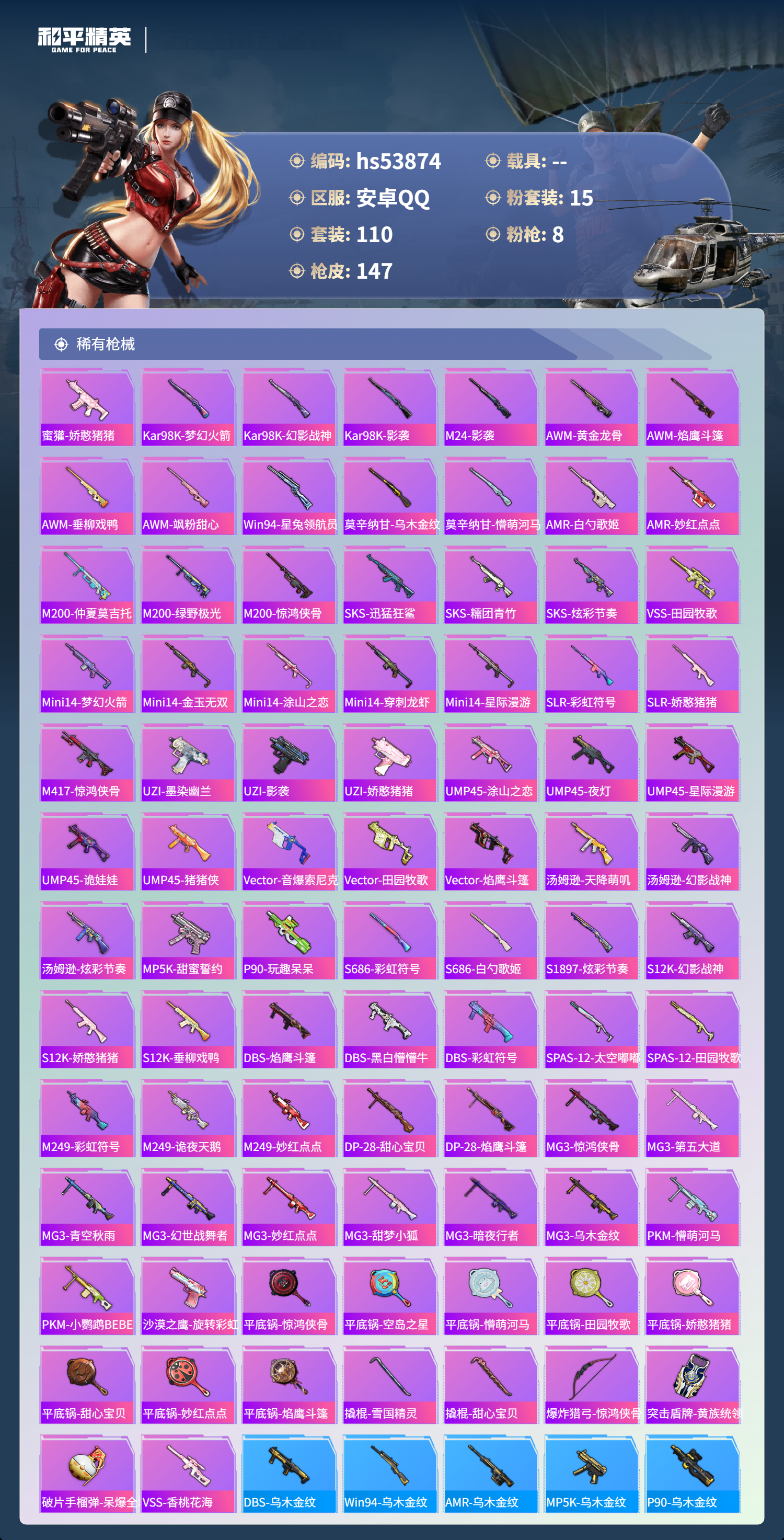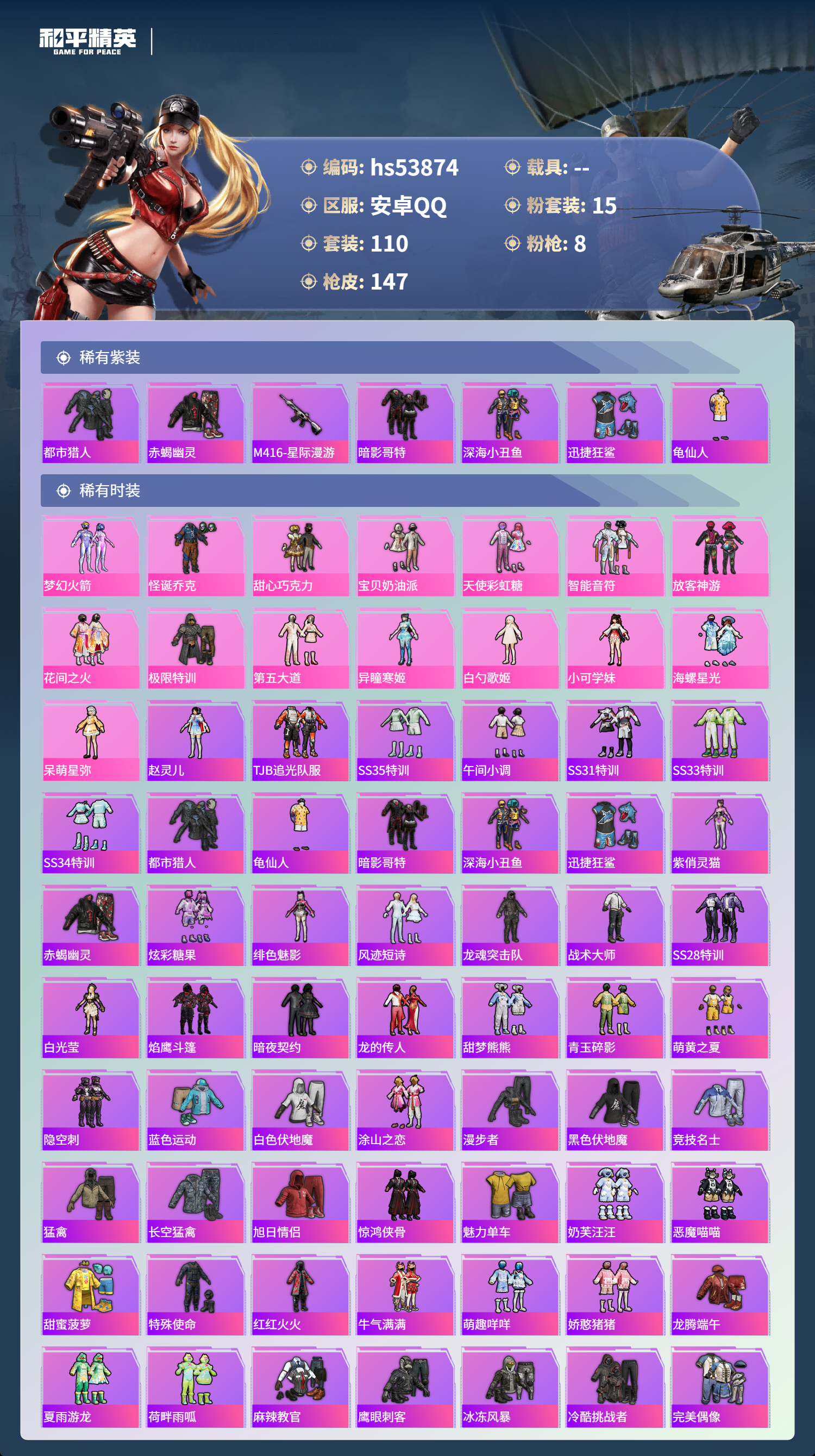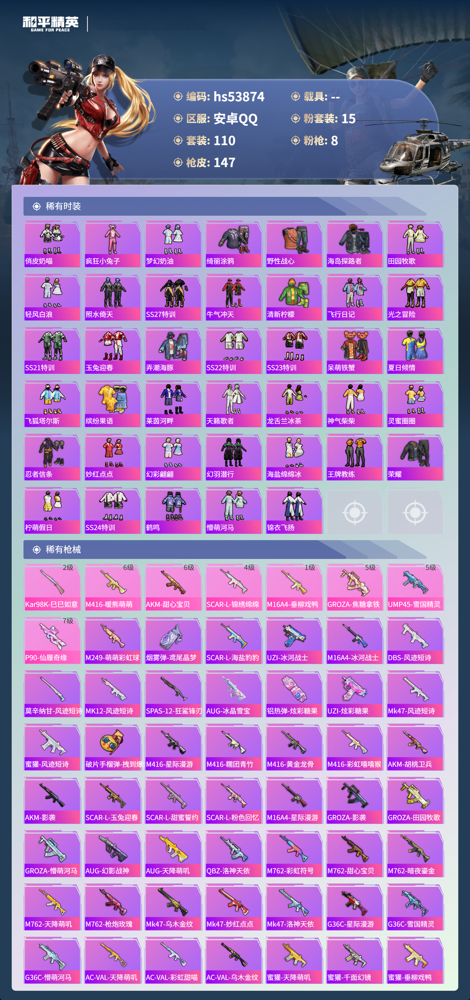 hs53874 安卓手q-4王牌印记-15粉装-8特效呛-52780热力值-110套装-147呛皮-1卓越印记【15粉装】套装-极限特训套装-宝贝奶油派套装-放客神游套装-第五大道角色-异瞳寒姬角色-白勺歌姬角色-呆萌星弥套装-智能音符套装-甜心巧克力套装-天使彩虹糖角色-小可学妹套装-海螺星光套装-梦幻火箭套装-怪诞乔克套装-花间之火【8特效呛】m16a4-垂柳戏