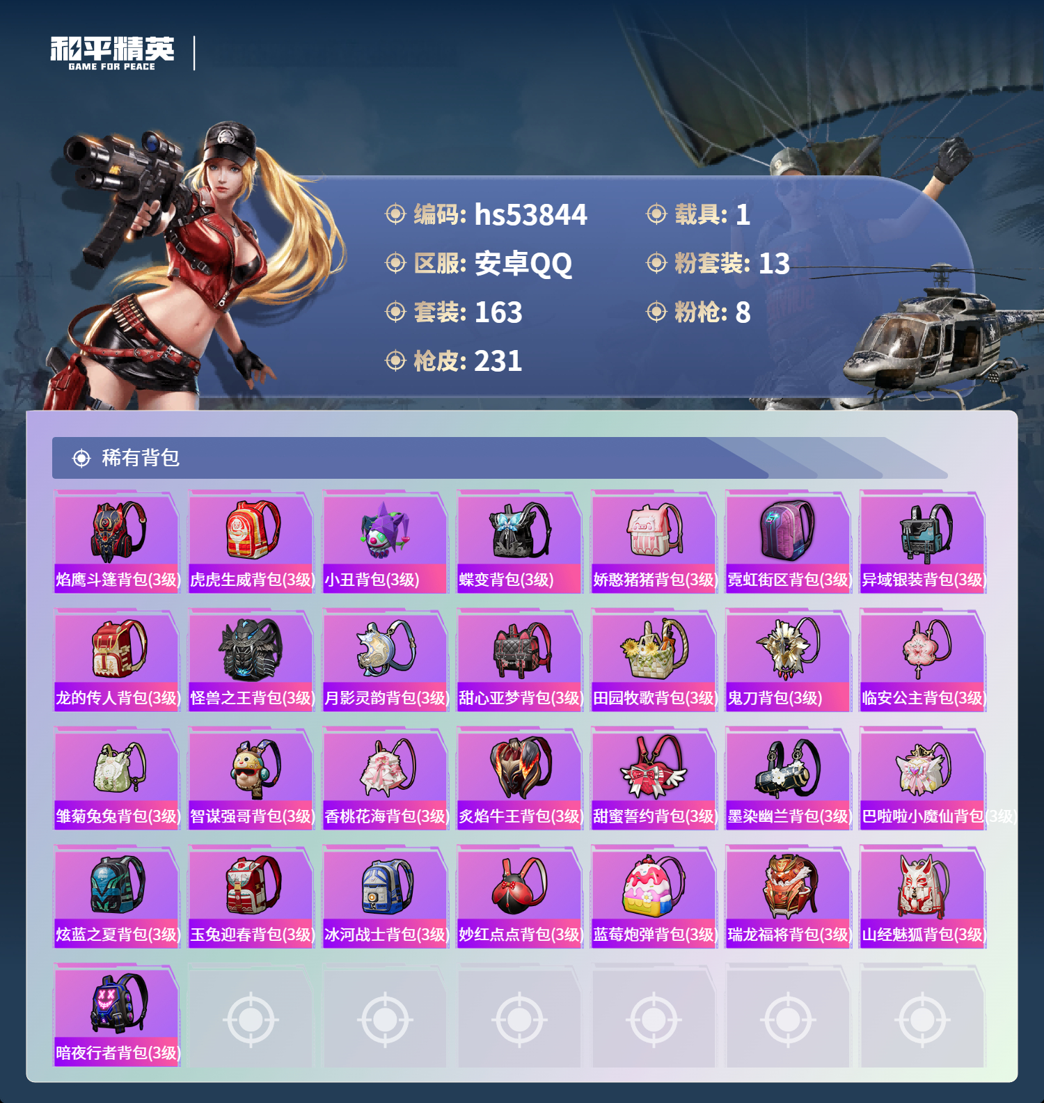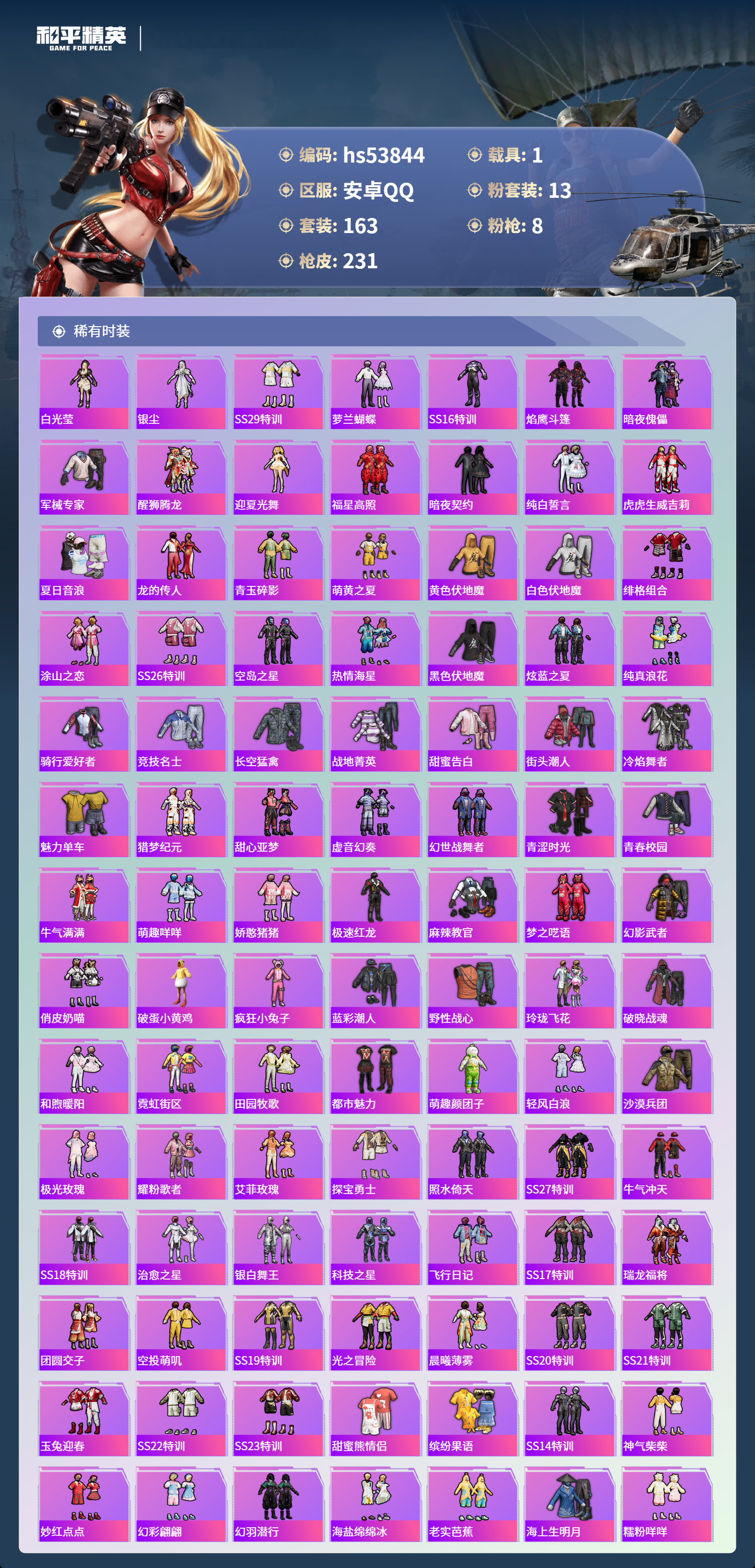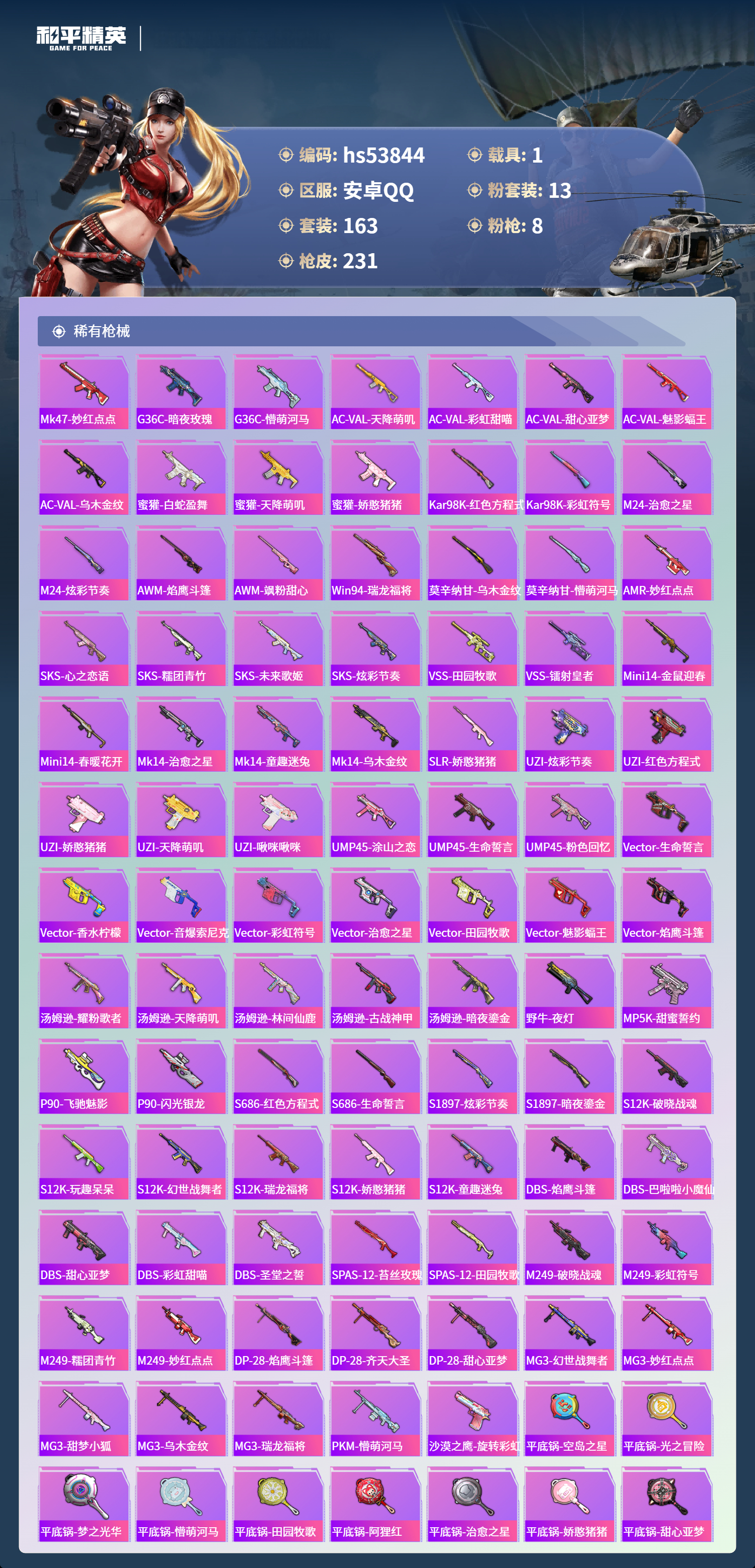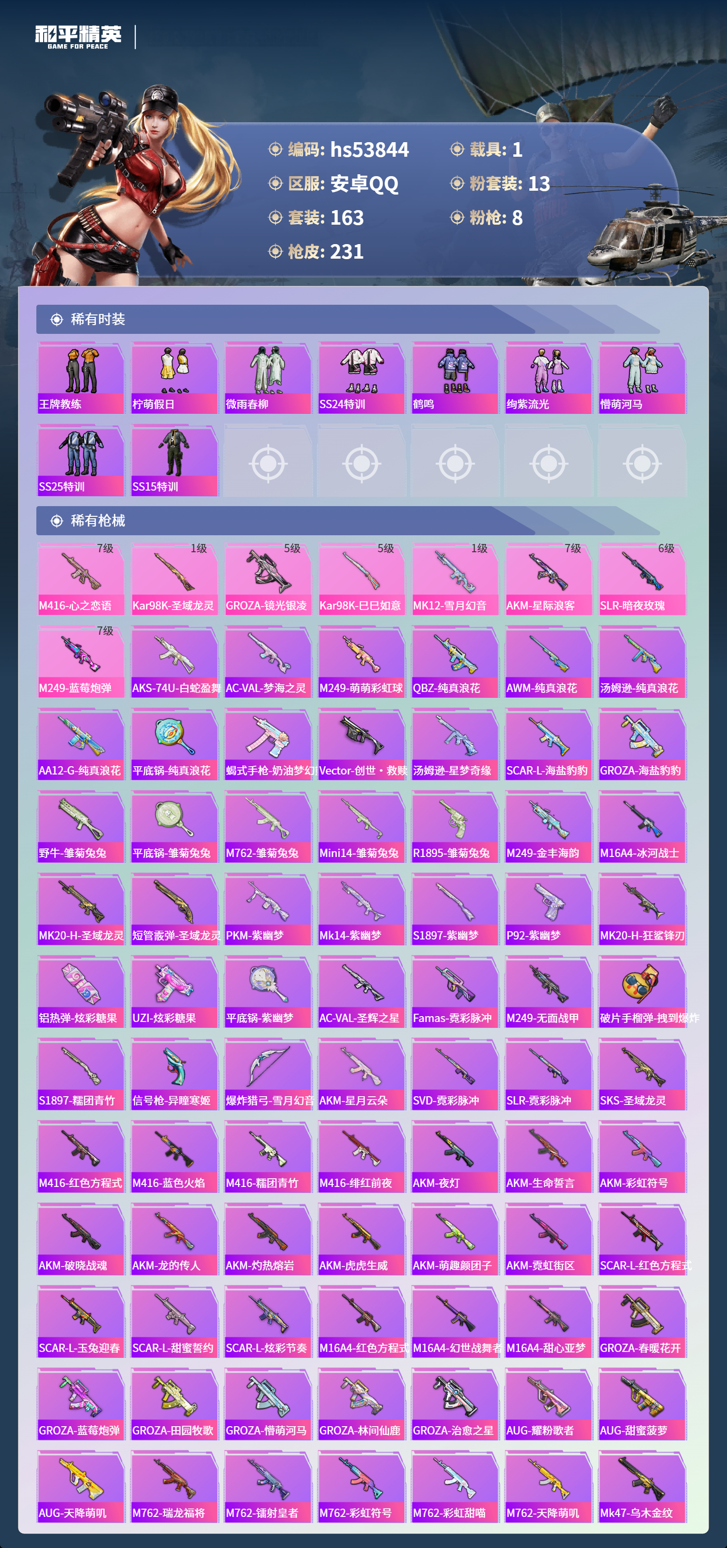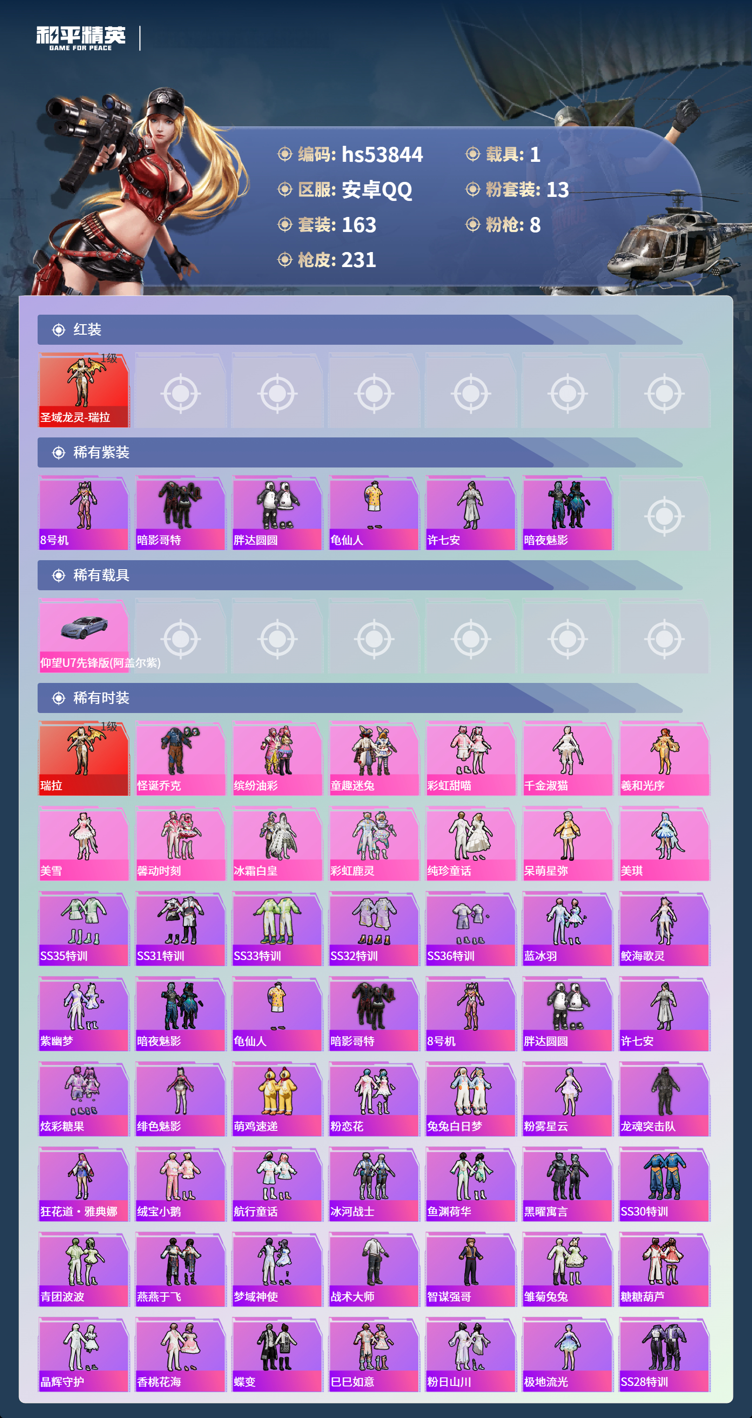 hs53844 安卓手q-13王牌印记-1红装-13粉装-8特效呛-1载具-76183热力值-163套装-231呛皮-6卓越印记-2传奇印记【1红装】圣域龙灵-瑞拉/1级【13粉装】角色-美雪角色-美琪角色-羲和光序套装-彩虹鹿灵套装-缤纷油彩角色-呆萌星弥套装-怪诞乔克套装-冰霜白皇套装-童趣迷兔套装-馨动时刻角色-千金淑猫套装-纯珍童话套装-彩虹甜喵【8特效呛】s