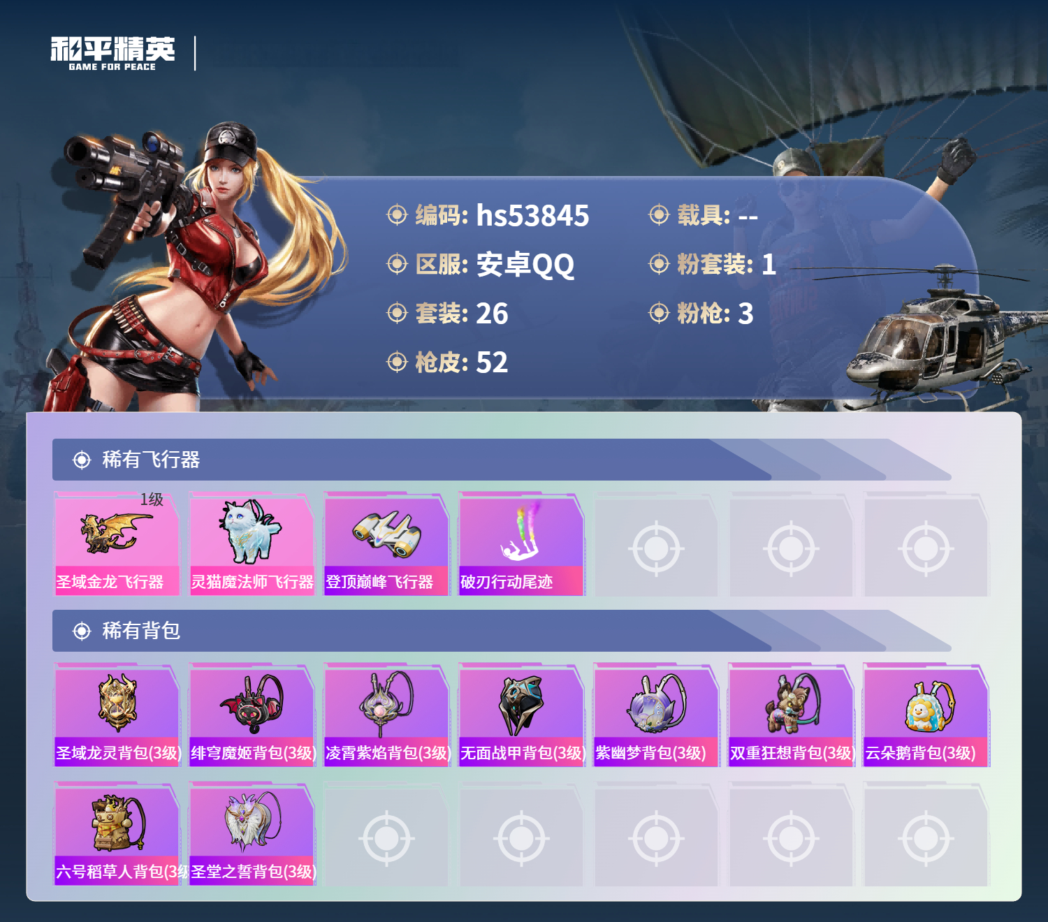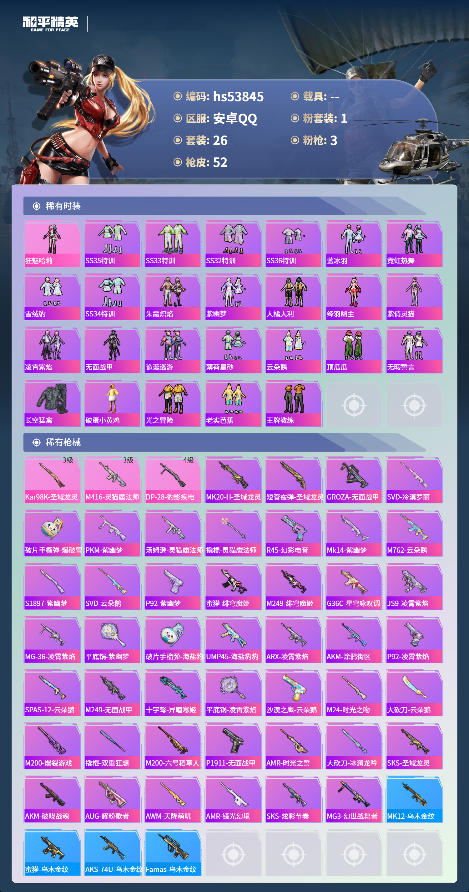 hs53845 安卓手q-1王牌印记-1粉装-3特效呛-15647热力值-26套装-52呛皮【1粉装】角色-狂魅哈莉【3特效呛】dp-28-豹影疾电/4级m416-灵猫魔法师/3级kar98k-圣域龙灵/3级【26稀有时装】狂魅哈莉ss35特训ss33特训ss32特训ss36特训蓝冰羽霓虹热舞雪绒豹ss34特训朱霞炽焰紫幽梦大橘大利绛羽幽主紫俏灵猫凌霄紫焰无