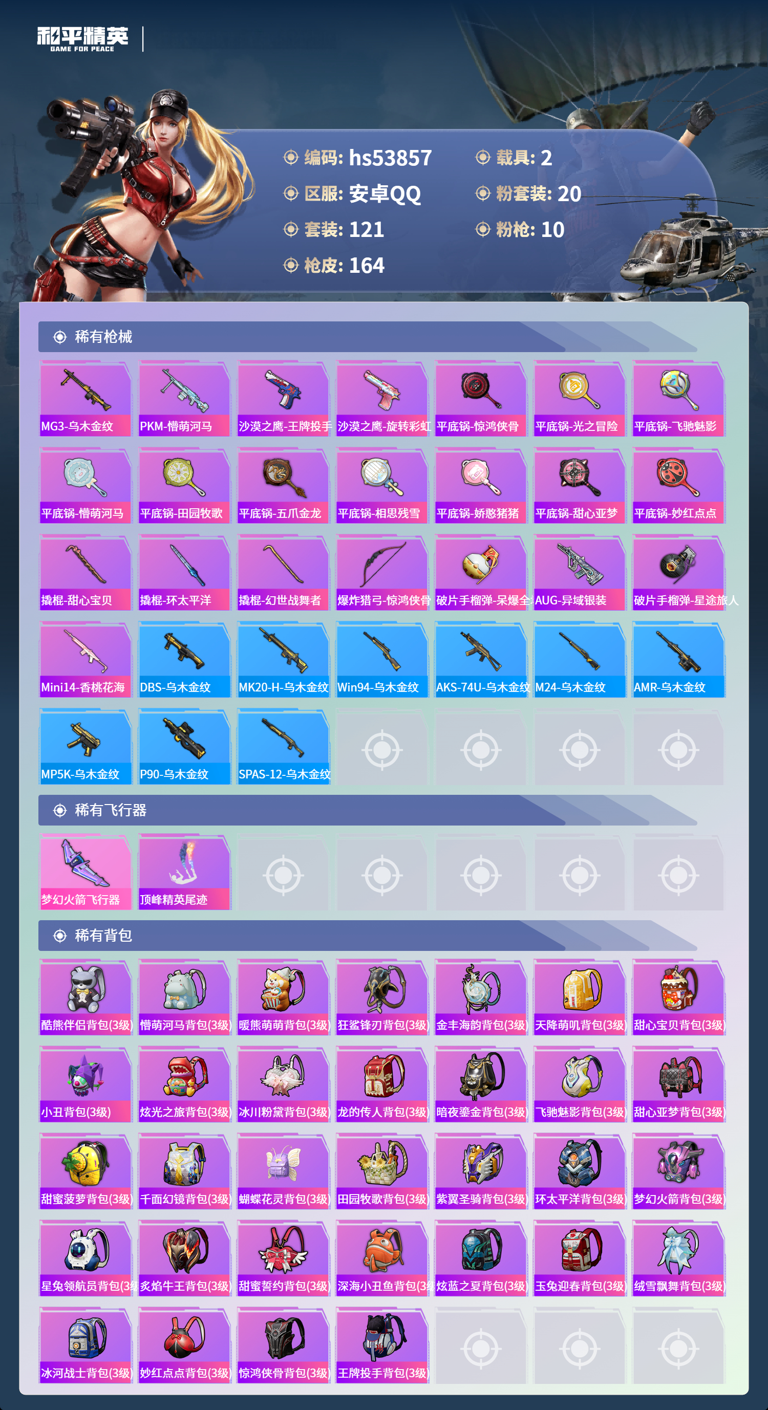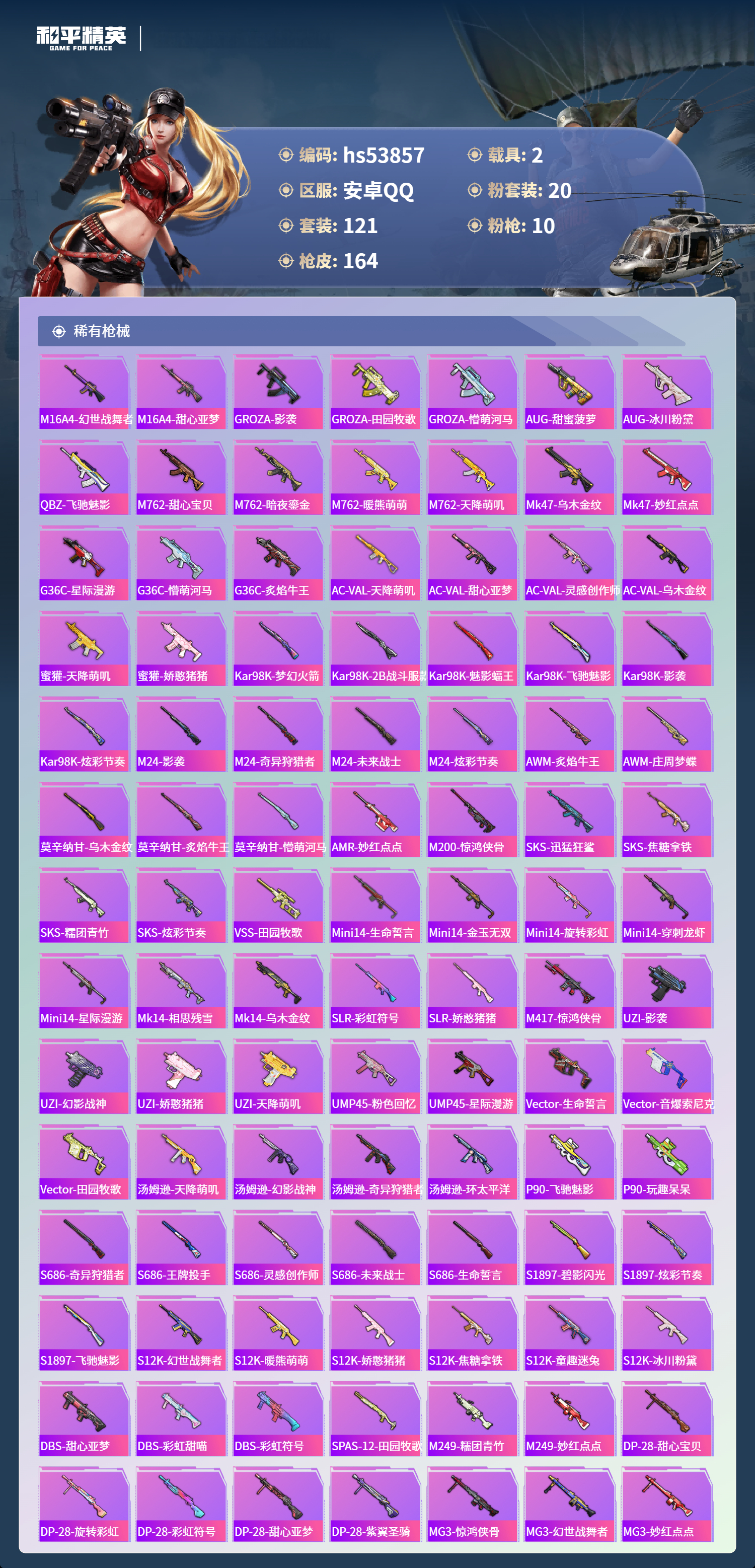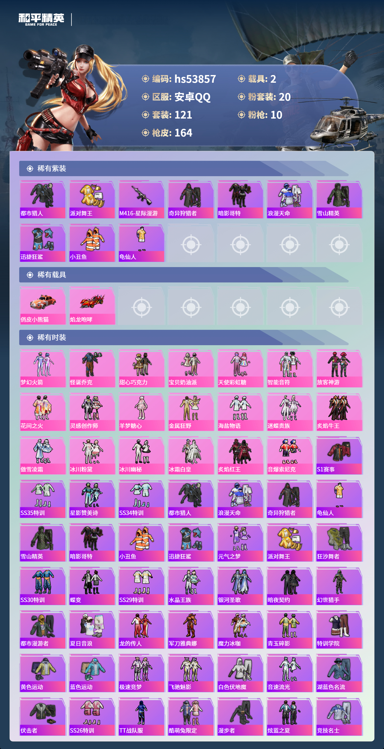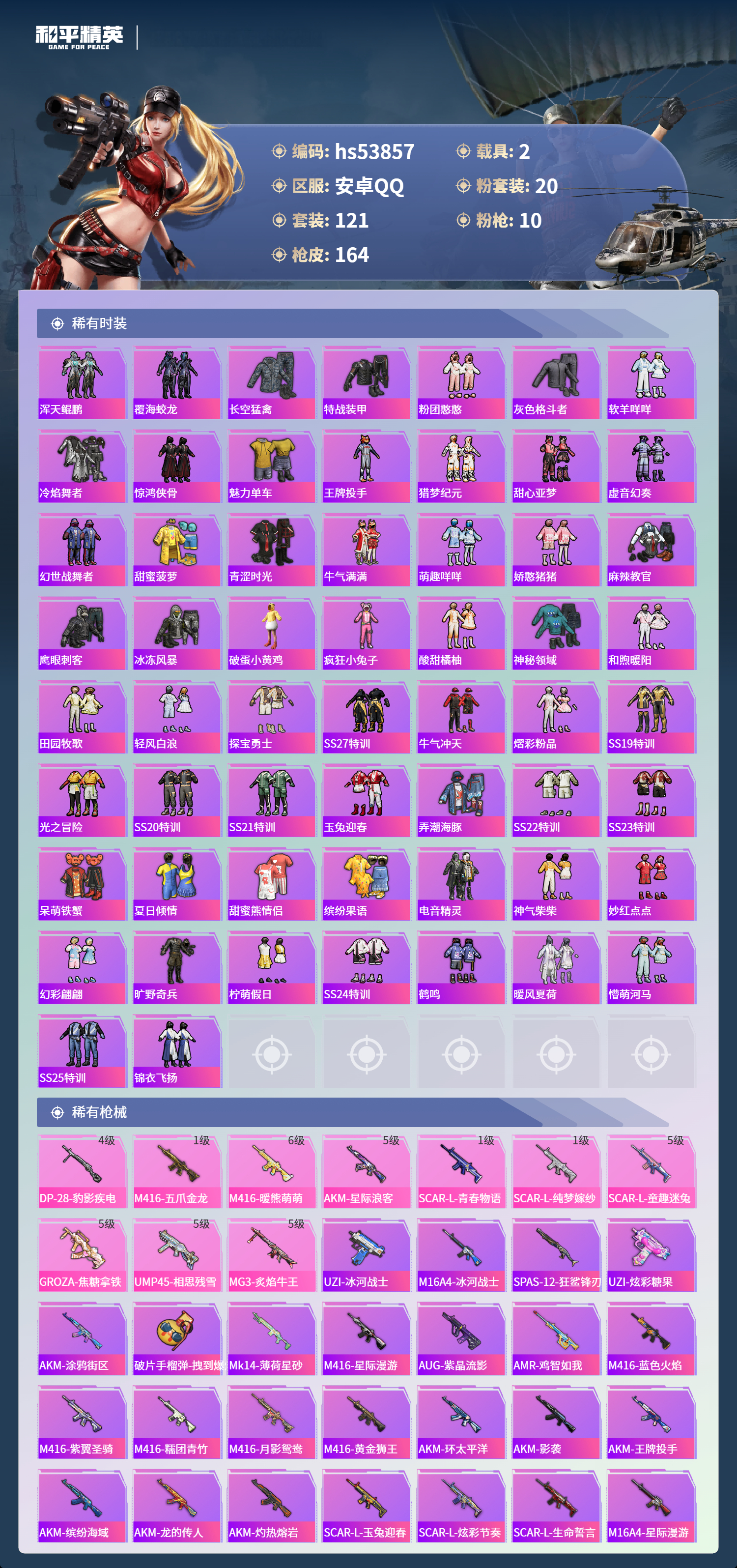 hs53857 安卓手q-6王牌印记-有战神框-20粉装-10特效呛-2载具-60771热力值-121套装-164呛皮【20粉装】套装-宝贝奶油派套装-花间之火套装-音爆索尼克套装-冰川粉黛套装-傲雪凌霜套装-炙焰牛王套装-放客神游套装-炙焰红王套装-金属狂野套装-天使彩虹糖套装-梦幻火箭套装-灵感创作师套装-智能音符套装-怪诞乔克套装-冰霜白皇套装-海盐物语角色