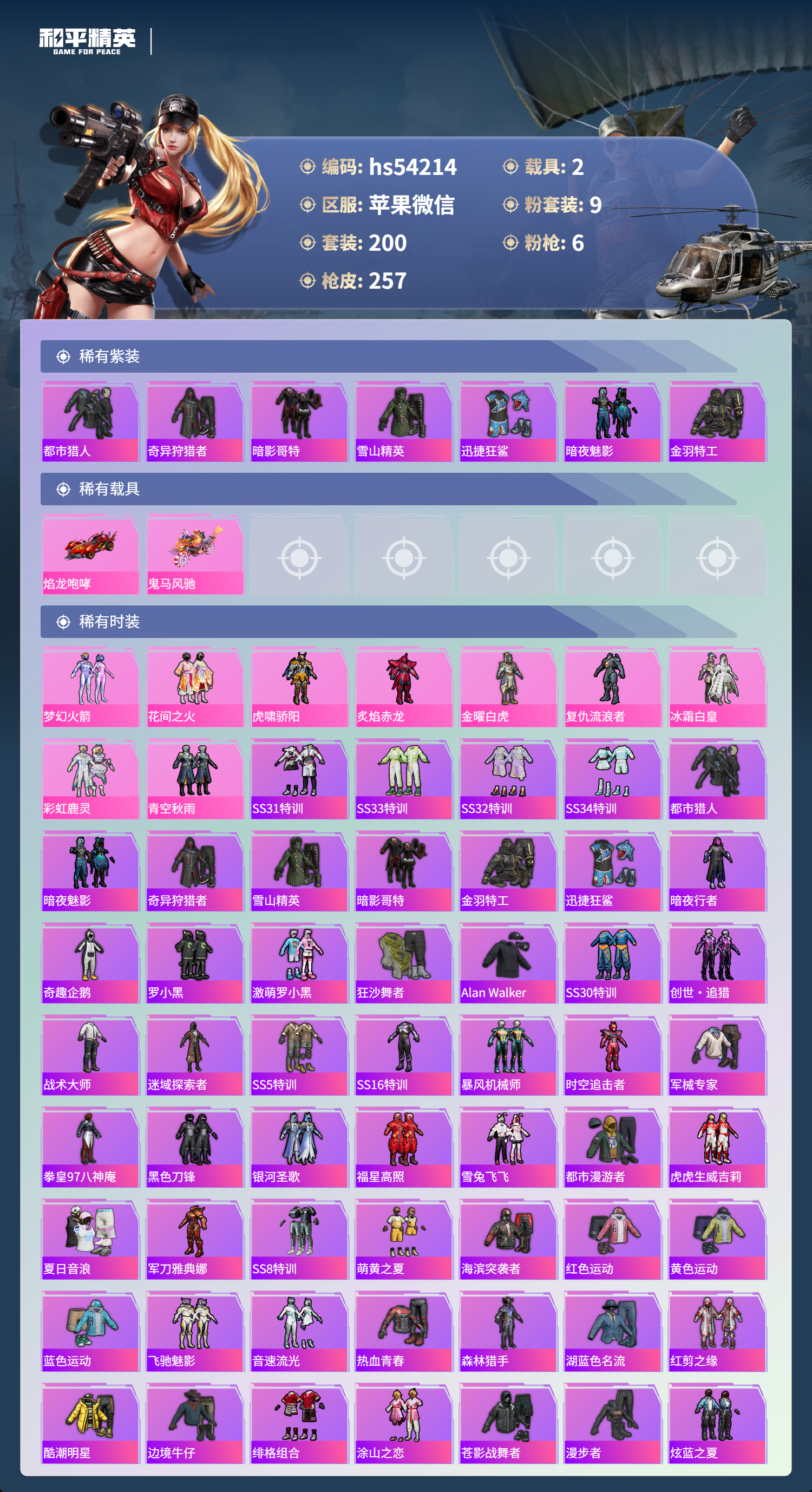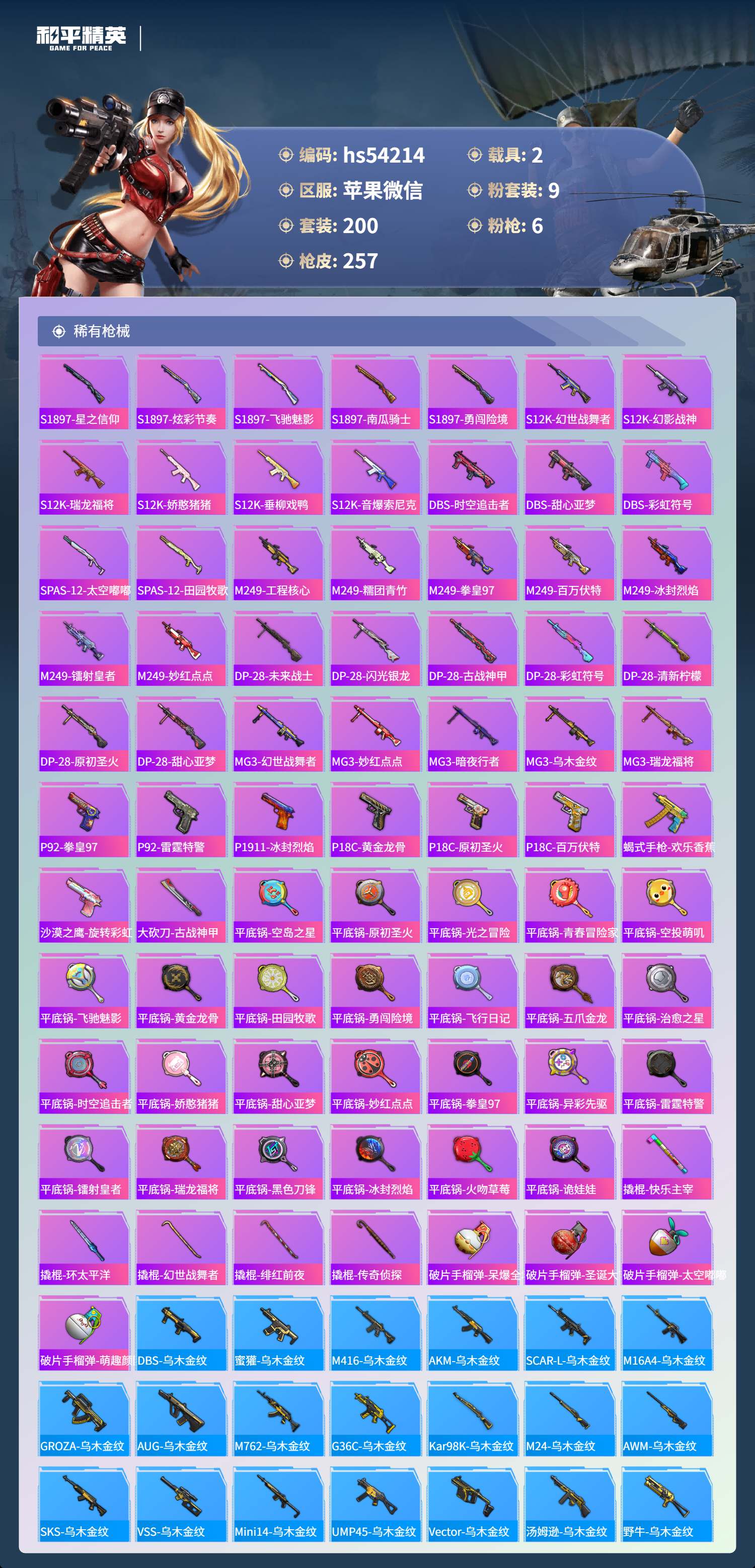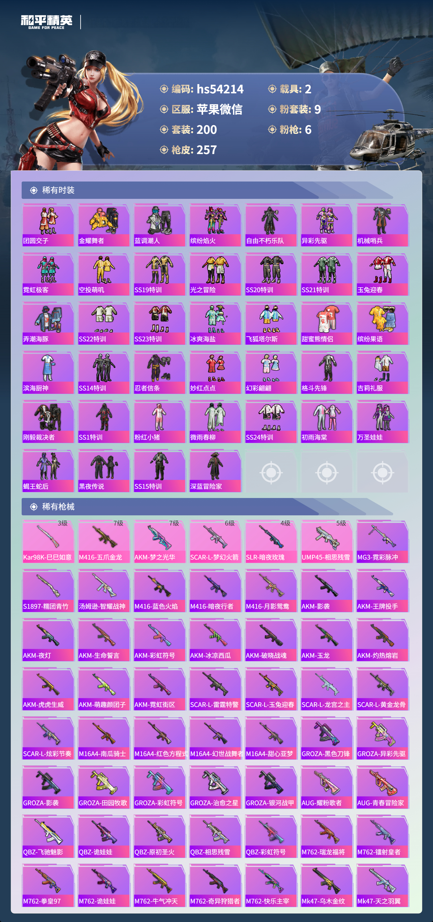 hs54214 苹果微信-7王牌印记-9粉装-6特效呛-2载具-85960热力值-200套装-257呛皮-1卓越印记【9粉装】套装-虎啸骄阳套装-梦幻火箭套装-金曜白虎套装-冰霜白皇角色-复仇流浪者套装-花间之火套装-青空秋雨套装-炙焰赤龙套装-彩虹鹿灵【6特效呛】scar-l-梦幻火箭/6级slr-暗夜玫瑰/4级kar98k-巳巳如意/3级akm-梦之光华/7级m41