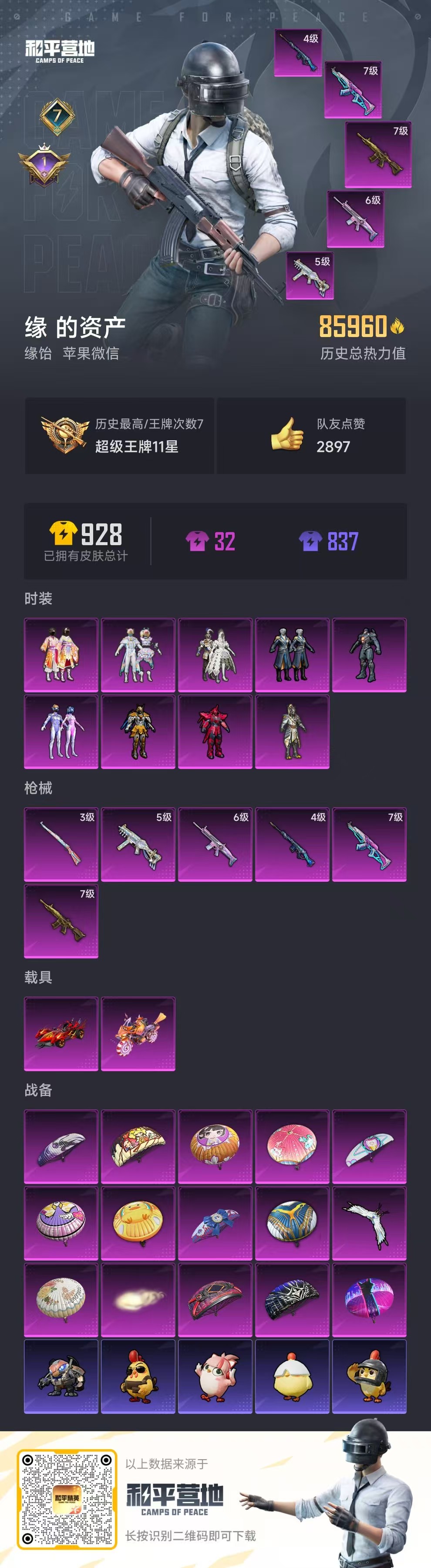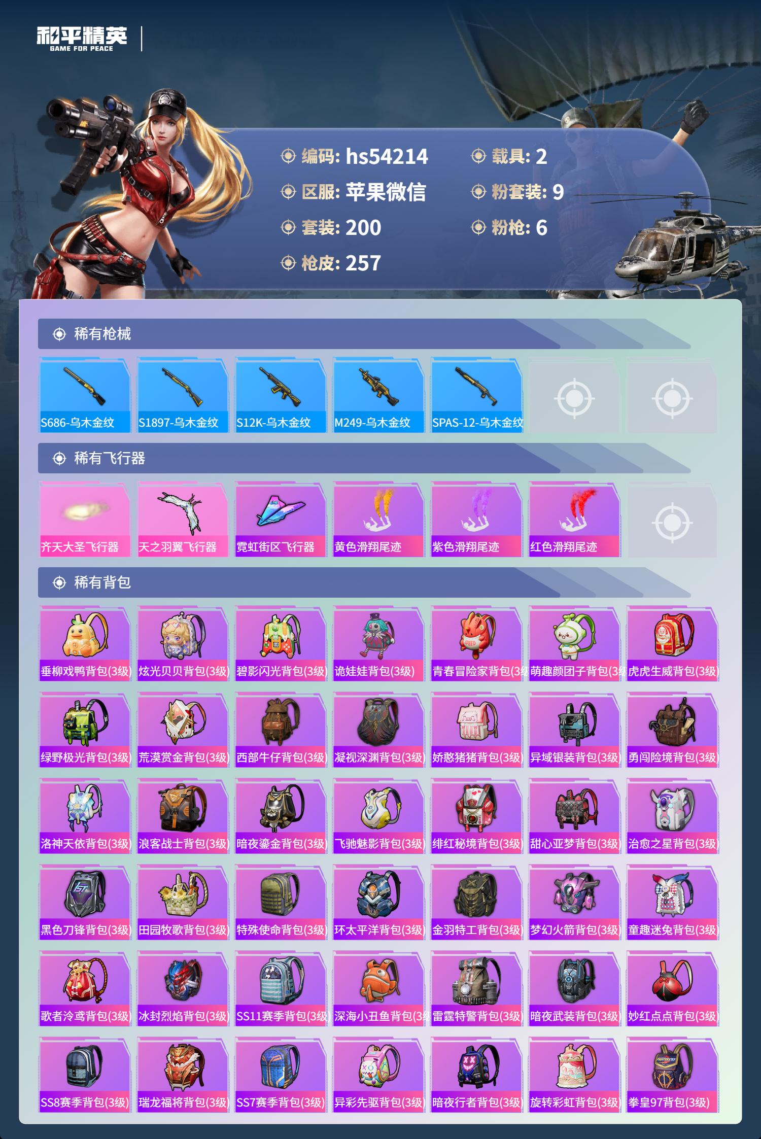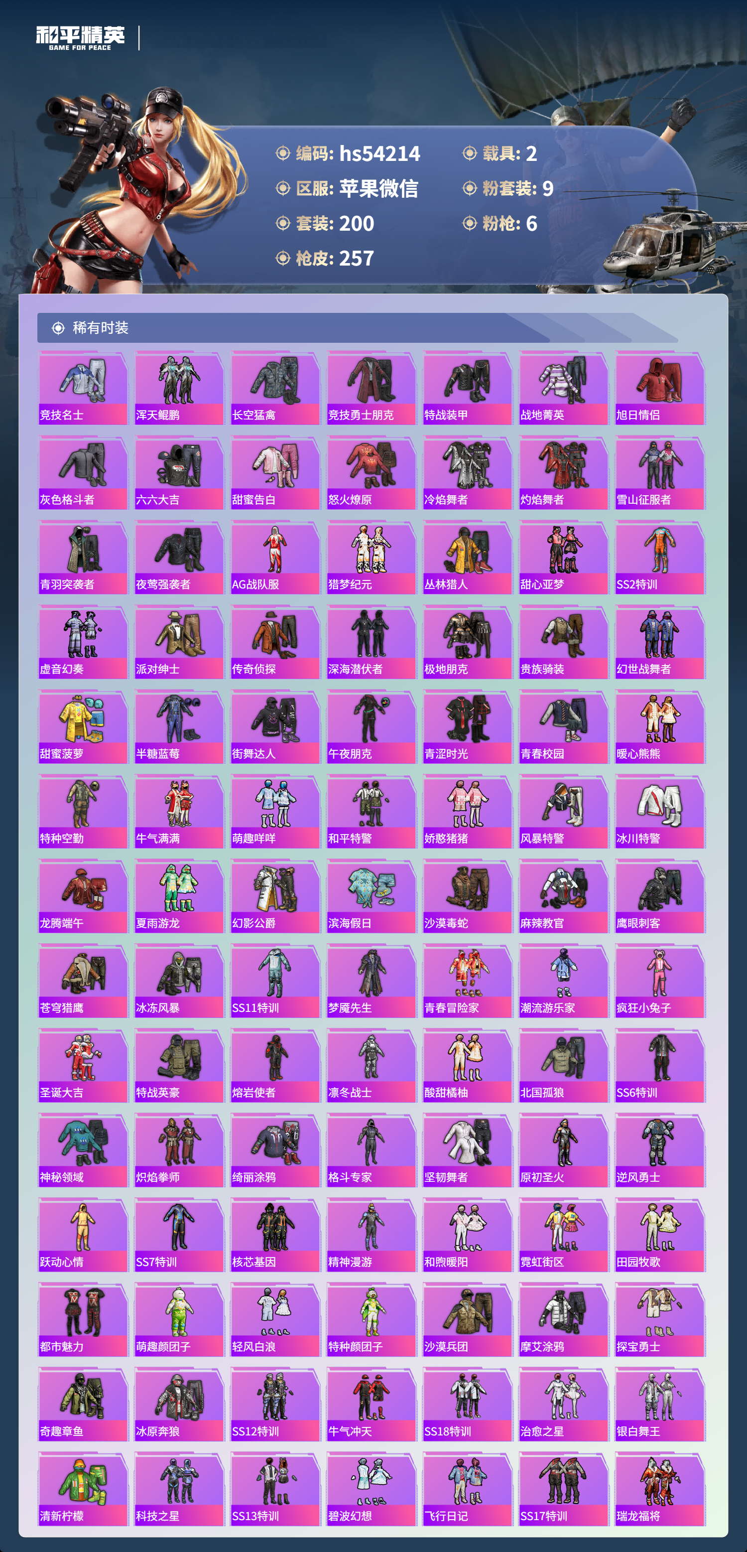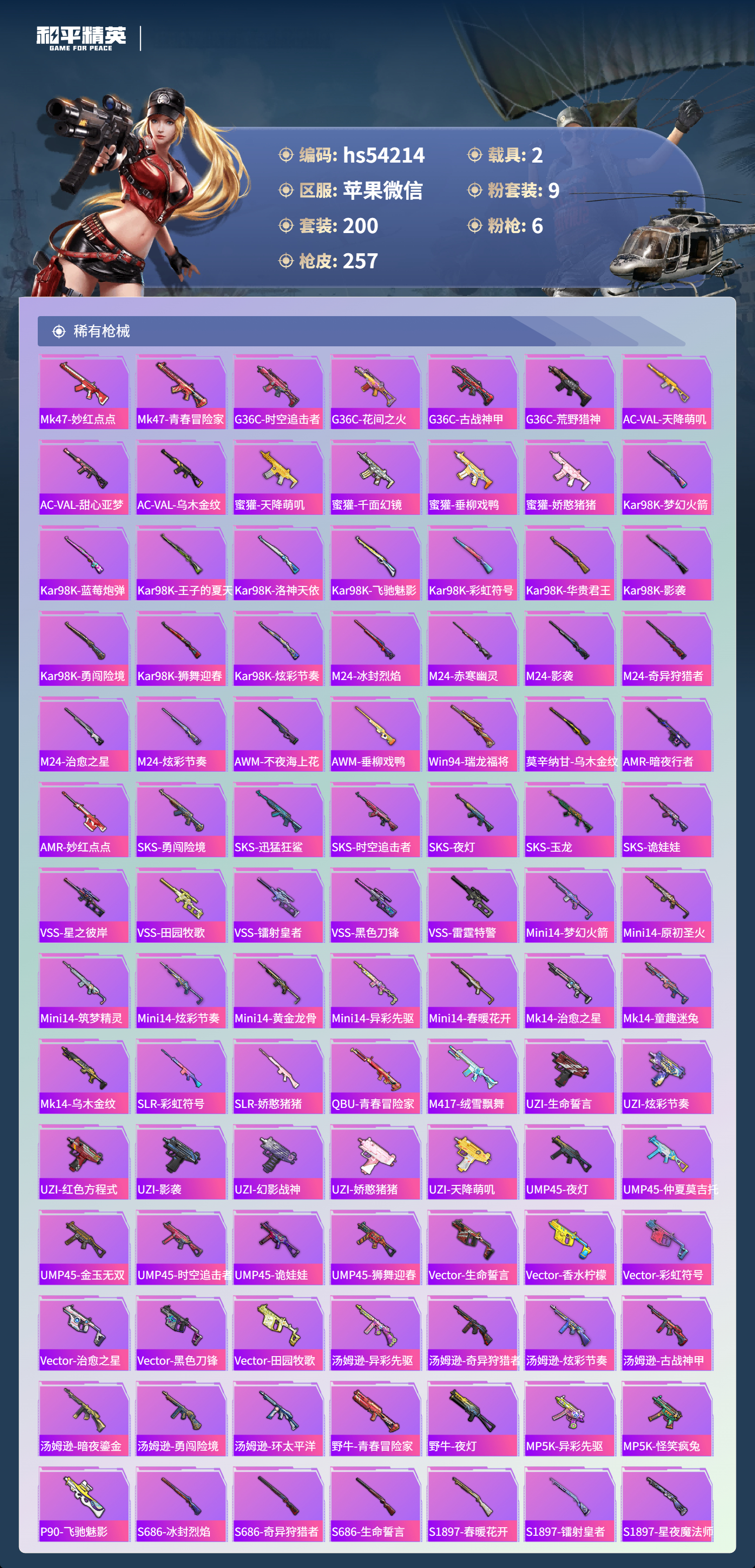hs54214 苹果微信-7王牌印记-9粉装-6特效呛-2载具-85960热力值-200套装-257呛皮-1卓越印记【9粉装】套装-虎啸骄阳套装-梦幻火箭套装-金曜白虎套装-冰霜白皇角色-复仇流浪者套装-花间之火套装-青空秋雨套装-炙焰赤龙套装-彩虹鹿灵【6特效呛】scar-l-梦幻火箭/6级slr-暗夜玫瑰/4级kar98k-巳巳如意/3级akm-梦之光华/7级m41