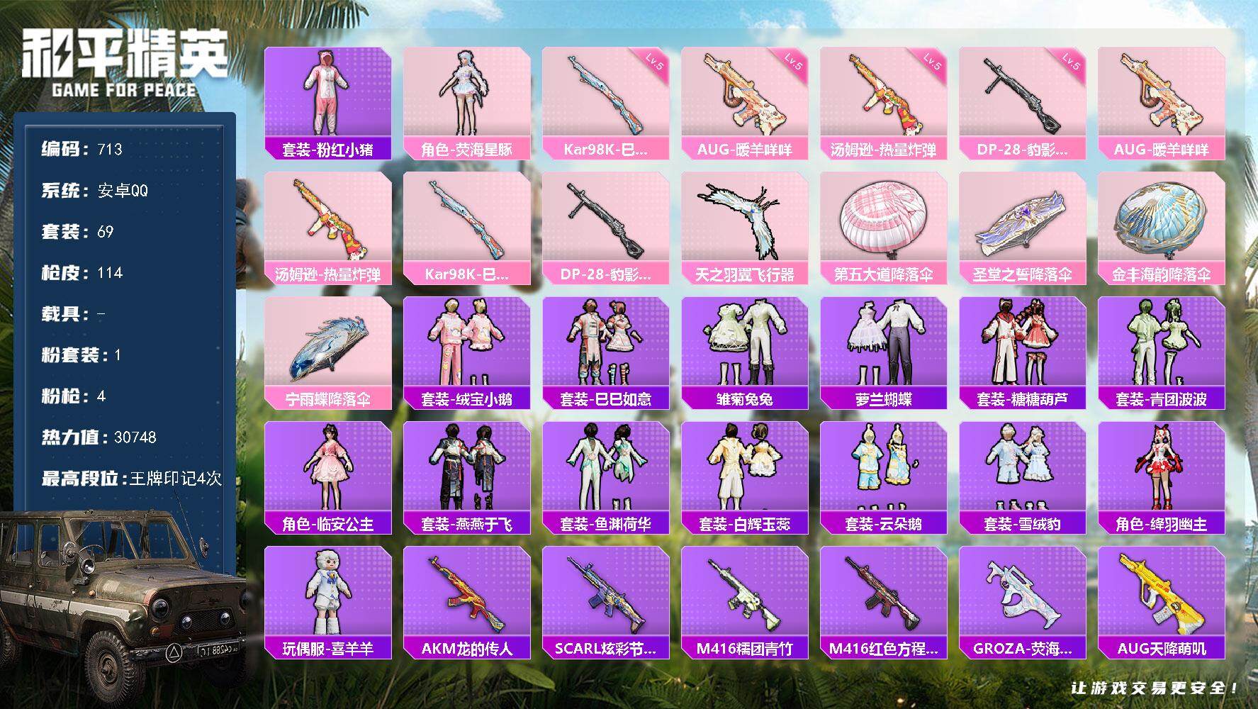 [14756970]连体王者 安卓 手q-1粉装-4特效呛-0载具-2粉色飞行器-30748热力值-4王牌印记-69套装-114呛皮 【热门品类】:套装-粉红小猪 【粉色套装】:角色-荧海星豚 【粉色呛皮等级】:aug-暖羊咩咩五级,汤姆逊-热量炸弹五级,kar98k-巳巳如意五级,dp-28-豹影疾电五级 【粉色呛皮】:aug-暖羊咩咩,汤姆逊-热量炸弹,kar98k-巳巳如意,dp-28-豹影疾电 【粉色飞行器】:天之羽翼飞行器 【粉色降落伞】:第五大道降落伞,圣堂之誓降落伞,金丰海韵降落伞,宁雨蝶降落伞 【稀有套装】:套装-绒宝小鹅,套装-巳巳如意,套装-雏菊兔兔,套装-萝兰蝴蝶,套装-糖糖葫芦,套装-青团波波,角色-临安公主,套装-燕燕于飞,套装-鱼渊荷华,套装-白辉玉蕊,套装-云朵鹅,套装-雪绒豹,角色-绛羽幽主,玩偶服-喜羊羊,套装-炫彩糖果 【稀有呛皮】:aug-冰晶雪宝,akm-龙的传人,scar-l-炫彩节奏,m416-糯团青竹,m416-红色方程式,groza-荧海星豚,aug-天降萌叽,aug-耀粉歌者,q-彩虹符号,m762-云朵鹅,mk47-洛神天依,ac-val-天降萌叽,蜜獾-天降萌叽,uzi-啾咪啾咪,uzi-天降萌叽,ump45-生命誓言,ump45-蓝色火焰,vect-生命誓言,汤姆逊-天降萌叽,p90-巳巳如意,sks-炫彩节奏,mini14-炫彩节奏,svd-云朵鹅,s686-千金淑猫,s1897-炫彩节奏,s1897-荧海星豚,s12k-玩趣呆呆,s12k-极意拳锋,dbs-创世·救赎,spas-12-云朵鹅,m249-彩虹符号,dp-28-彩虹符号,mg3-幻世战舞者,短管霰弹-星穹咏叹调,蝎式手呛-千金淑猫,沙墨之鹦-云朵鹅,大砍刀-云朵鹅,破片手留单-巳巳如意 【其他套装】:套装-ss26特训,套装-ss27特训,套装-ss28特训,套装-ss29特训,套装-冷焰舞者,套装-旭日情侣,套装-柠萌假日,套装-深蓝色名流,套装-特战装甲,套装-玉兔迎春,套装-王牌教练,套装-破蛋小黄鸡,套装-空岛之星,套装-竞技名士,套装-粉红小猪,套装-红色运动,套装-绯格组合,套装-缤纷果语,套装-耀粉歌者,套装-都市魅力,套装-长空猛禽,套装-霓虹街区,套装-青涩时光,套装-顽皮玉兔,套装-魅力单车,套装-鹤鸣,套装-黑色伏地