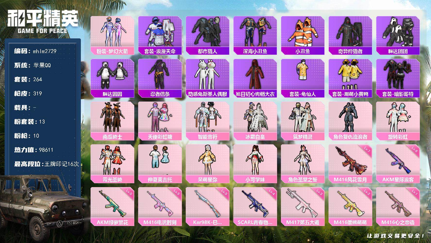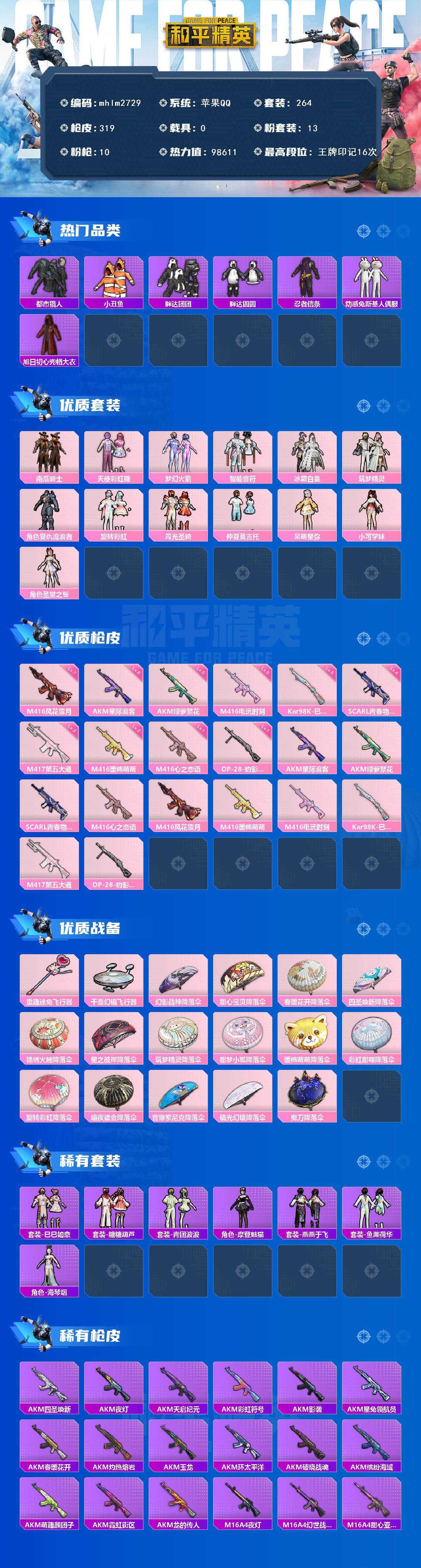 [14756984]【mhlm2729】苹果 手q-13粉装-10特效呛-0载具-2粉色飞行器-98611热力值-16王牌印记-264套装-319呛皮 【热门品类】:粉装-梦幻火箭,套装-浪漫天命,套装-都市猎人,套装-深海小丑鱼,套装-小丑鱼,套装-奇异狩猎者,套装-胖达团团,套装-胖达圆圆,套装-忍者信条,套装-动感兔斯基人偶服,旭日初心兜帽大衣,套装-龟仙人,套装-潮萌小黄鸭,套装-暗影哥特 【粉色套装】:粉装-南瓜骑士,粉装-天使彩虹糖,粉装-梦幻火箭,粉装-智能音符,粉装-冰霜白皇,粉装-筑梦精灵,角色-复仇流浪者,粉装-旋转彩虹,粉装-霞光圣骑,粉装-仲夏莫吉托,角色-呆萌星弥,角色-小可学妹,角色-圣堂之誓 【粉色呛皮等级】:akm-星际浪客六级,akm-绿萝繁花五级,scar-l-青春物语四级,m416-心之恋语一级,m416-风花雪月七级,m416-暖熊萌萌二级,m416-电玩时刻五级,kar98k-巳巳如意五级,m417-第五大道三级,dp-28-豹影疾电一级 【粉色呛皮】:akm-星际浪客,akm-绿萝繁花,scar-l-青春物语,m416-心之恋语,m416-风花雪月,m416-暖熊萌萌,m416-电玩时刻,kar98k-巳巳如意,m417-第五大道,dp-28-豹影疾电 【粉色飞行器】:童趣迷兔飞行器,千面幻镜飞行器 【粉色降落伞】:幻影战神降落伞,甜心宝贝降落伞,春暖花开降落伞,四圣焕新降落伞,锦绣火鲤降落伞,星之彼岸降落伞,筑梦精灵降落伞,甜梦小狐降落伞,暖熊萌萌降落伞,彩虹甜喵降落伞,旋转彩虹降落伞,暗夜鎏金降落伞,音爆索尼克降落伞,镜光幻境降落伞,鬼刀降落伞 【稀有套装】:套装-龟仙人,套装-巳巳如意,套装-糖糖葫芦,套装-青团波波,角色-摩登魅猫,套装-燕燕于飞,套装-鱼渊荷华,角色-海琴烟 【稀有呛皮】:akm-四圣焕新,akm-夜灯,akm-天启纪元,akm-彩虹符号,akm-影袭,akm-星兔领航员,akm-春暖花开,akm-灼热熔岩,akm-玉龙,akm-环太平洋,akm-破晓战魂,akm-缤纷海域,akm-萌趣颜团子,akm-霓虹街区,akm-龙的传人,m16a4-夜灯,m16a4-幻世战舞者,m16a4-甜心亚梦,m16a4-红色方程式,m16a4-蓝色火焰,scar-l-夜灯,scar-l-炫彩