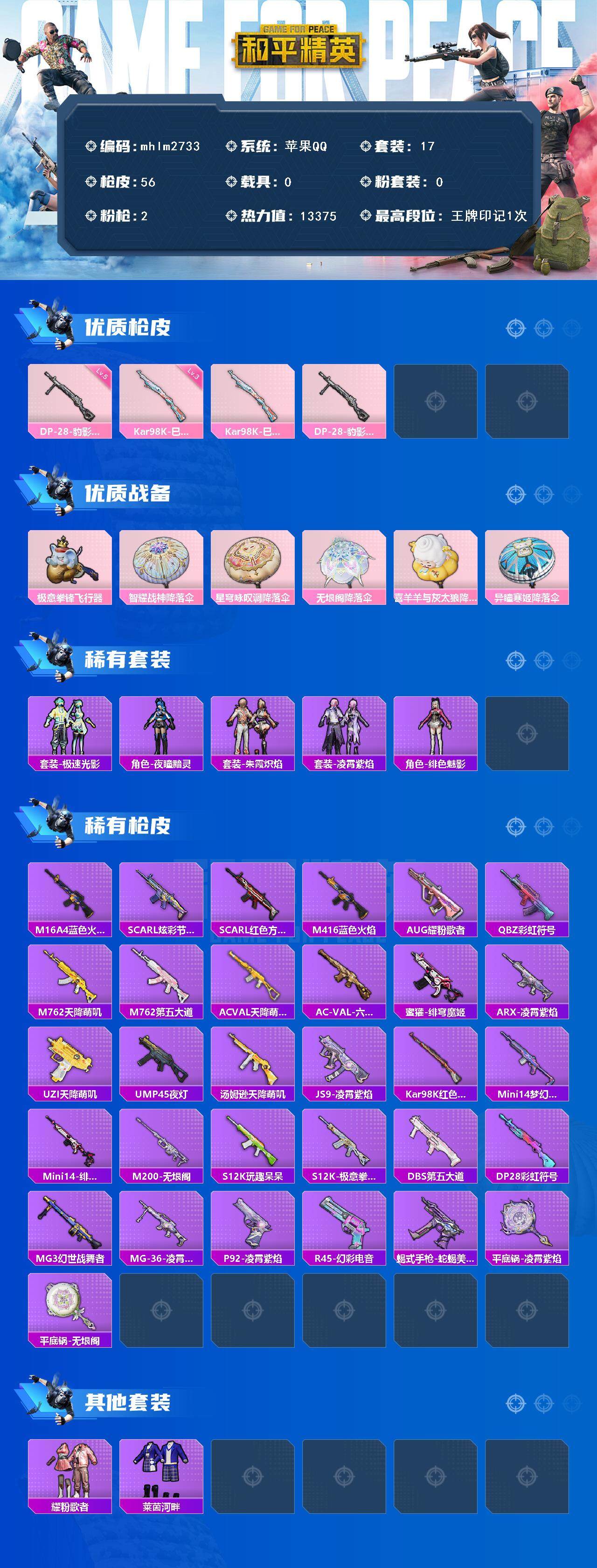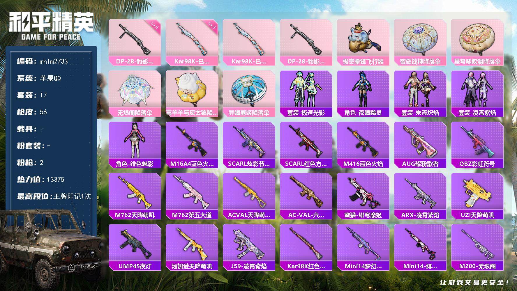 [14757046]【mhlm2733】苹果 手q-0粉装-2特效呛-0载具-2粉色飞行器-13375热力值-1王牌印记-17套装-56呛皮 【粉色呛皮等级】:kar98k-巳巳如意三级,dp-28-豹影疾电五级 【粉色呛皮】:kar98k-巳巳如意,dp-28-豹影疾电 【粉色飞行器】:极意拳锋飞行器 【粉色降落伞】:智耀战神降落伞,星穹咏叹调降落伞,无垠阁降落伞,喜羊羊与灰太狼降落伞,异瞳寒姬降落伞 【稀有套装】:套装-极速光影,角色-夜瞳黯灵,套装-朱霞炽焰,套装-凌霄紫焰,角色-绯色魅影,套装-炫彩糖果 【稀有呛皮】:aug-冰晶雪宝,m16a4-蓝色火焰,scar-l-炫彩节奏,scar-l-红色方程式,m416-蓝色火焰,aug-耀粉歌者,q-彩虹符号,m762-天降萌叽,m762-第五大道,ac-val-天降萌叽,ac-val-六号稻草人,蜜獾-绯穹魔姬,arx-凌霄紫焰,uzi-天降萌叽,ump45-夜灯,汤姆逊-天降萌叽,js9-凌霄紫焰,kar98k-红色方程式,mini14-梦幻火箭,mini14-绯穹魔姬,m200-无垠阁,s12k-玩趣呆呆,s12k-极意拳锋,dbs-第五大道,dp-28-彩虹符号,mg3-幻世战舞者,mg-36-凌霄紫焰,p92-凌霄紫焰,r45-幻彩电音,蝎式手呛-蛇蝎美人,平底锅-凌霄紫焰,平底锅-无垠阁 【其他套装】:套装-耀粉歌者,套装-莱茵河畔 【营地id】:1037921896