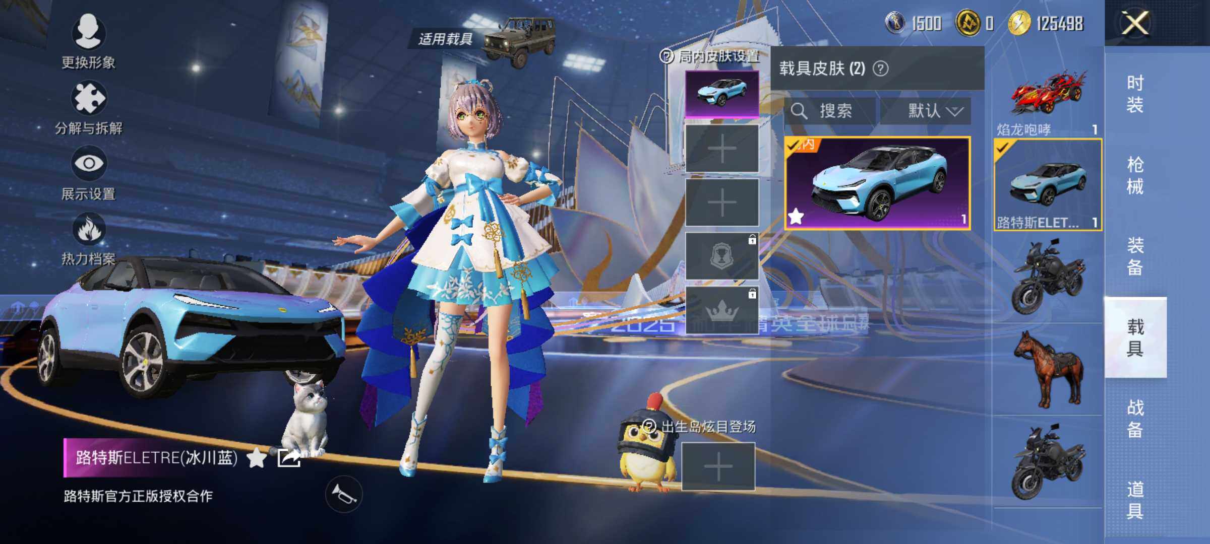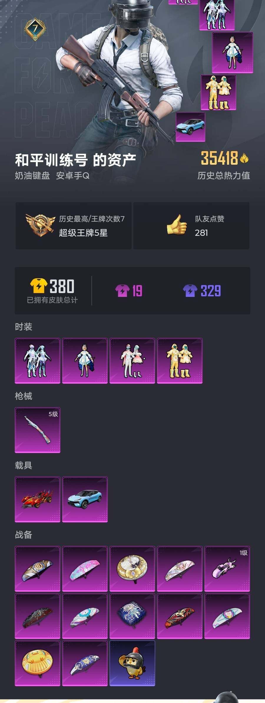 6164-4粉装-1特效呛-2载具-1粉色飞行器-35418热力值-7王牌印记-88套装-110呛皮 【粉色套装】:角色-洛天依,粉装-垂柳戏鸭,粉装-旋转彩虹,粉装-幻彩电音 【粉色呛皮等级】:kar98k-巳巳如意五级 【粉色载具】:路特斯eletre(冰川蓝),焰龙咆哮 【粉色呛皮】: