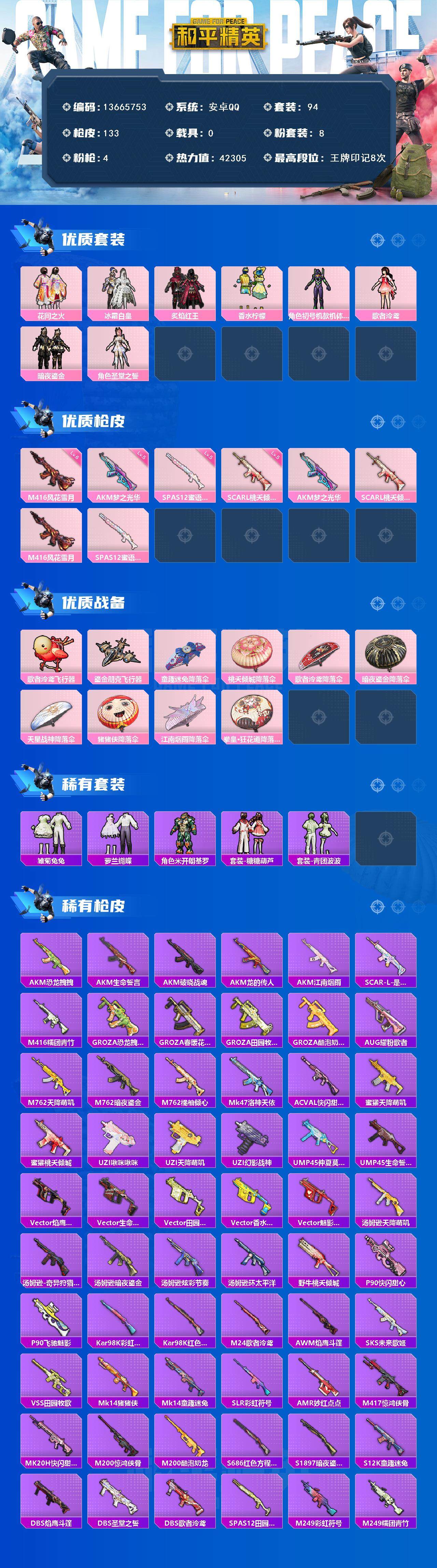 6165-8粉装-4特效呛-0载具-2粉色飞行器-42305热力值-8王牌印记-94套装-133呛皮 【热门品类】:套装-龟仙人 【粉色套装】:粉装-花间之火,粉装-冰霜白皇,粉装-炙焰红王,粉装-香水柠檬,角色-初号机款机体服,角色-歌者泠鸢,粉装-暗夜鎏金,角色-圣堂之誓 【粉色呛皮等级】: