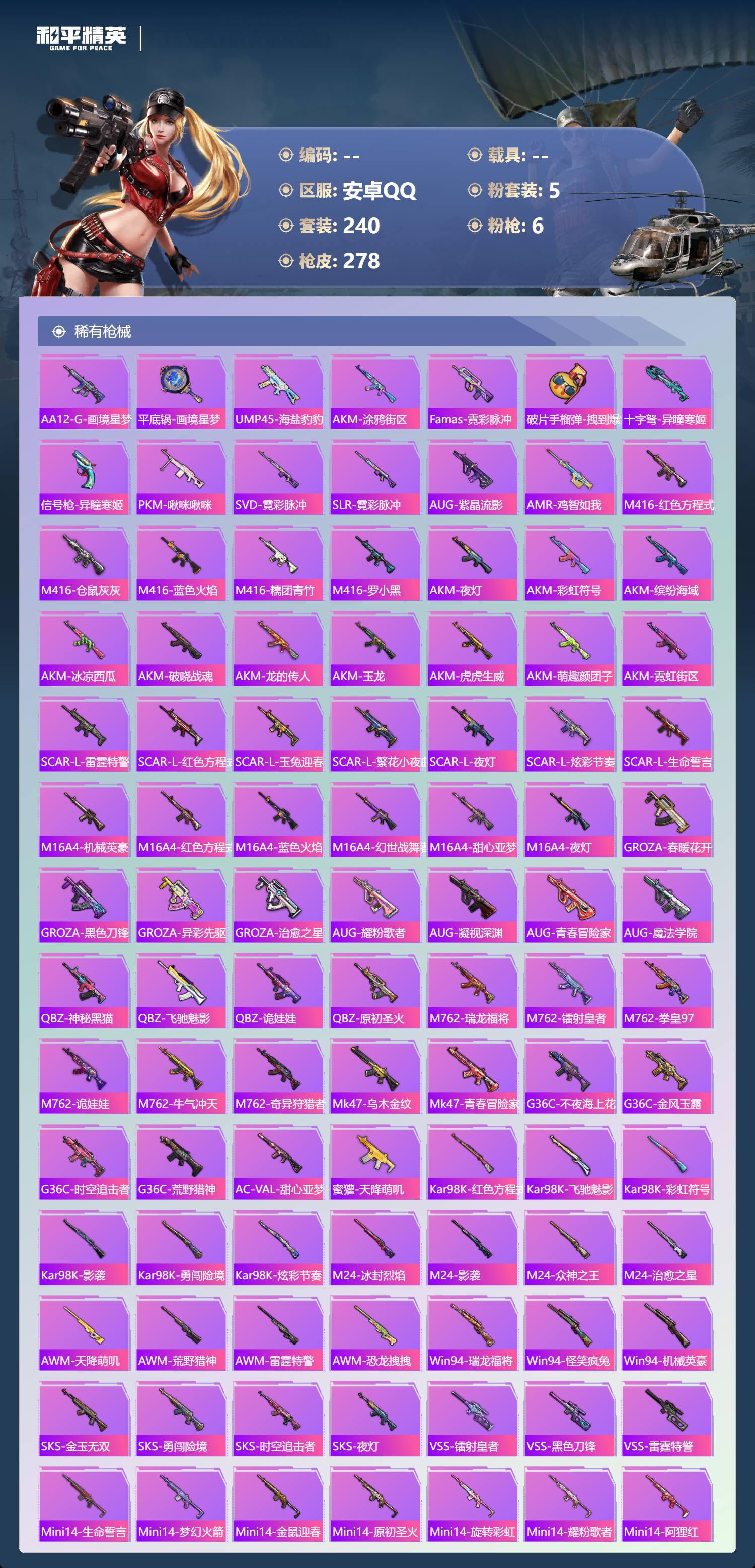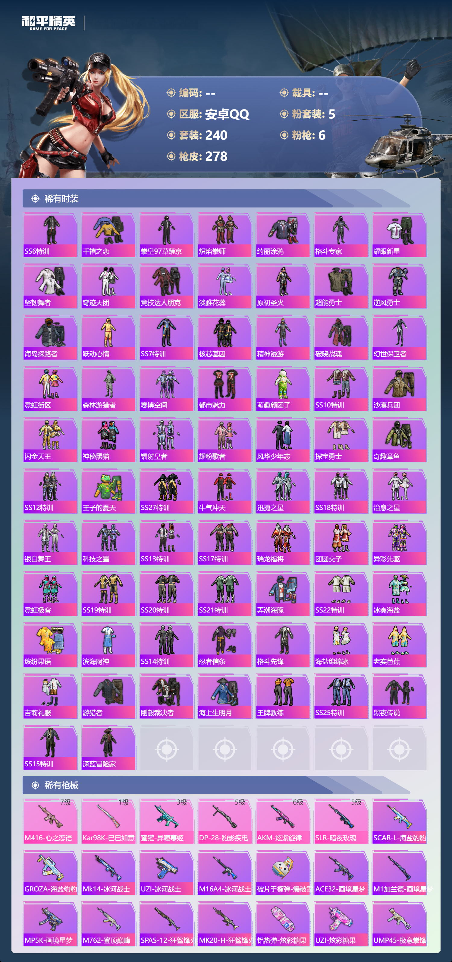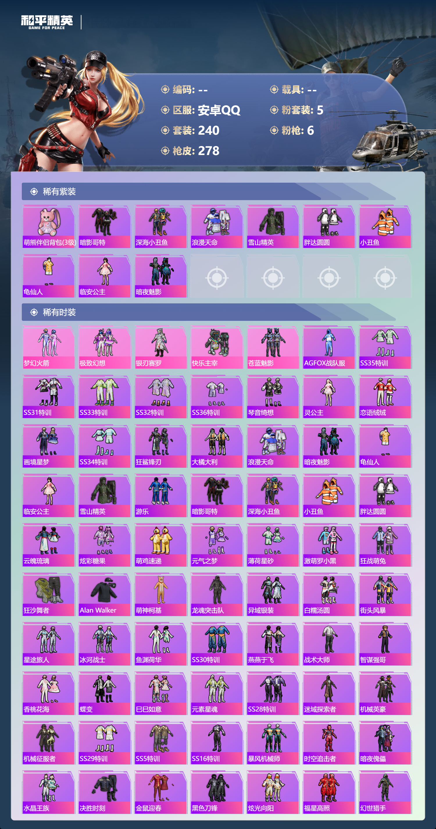 0载具-240套装-278呛皮-【 agfox战队服小丑鱼哥特5粉装6升级呛】安卓手q-15王牌印记-5粉装-6特效呛-91940热力值-240套装-278呛皮【5粉装】套装-梦幻火箭套装-银刃赛罗套装-苍蓝魅影套装-快乐主宰套装-极致幻想【6特效呛】dp-28-豹影疾电/5级slr-暗夜玫瑰/5级蜜獾-异瞳寒姬/3级akm-炫紫旋律/6级kar98k-巳巳如意/1级m416-心之恋语/7级