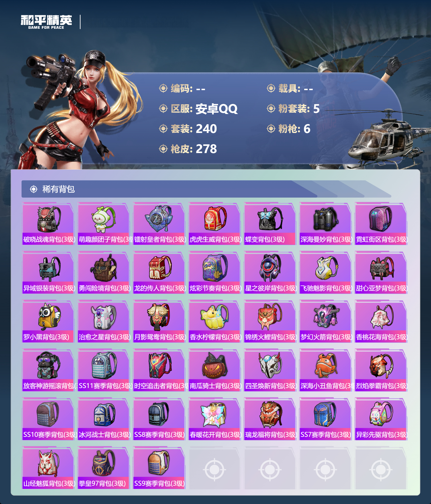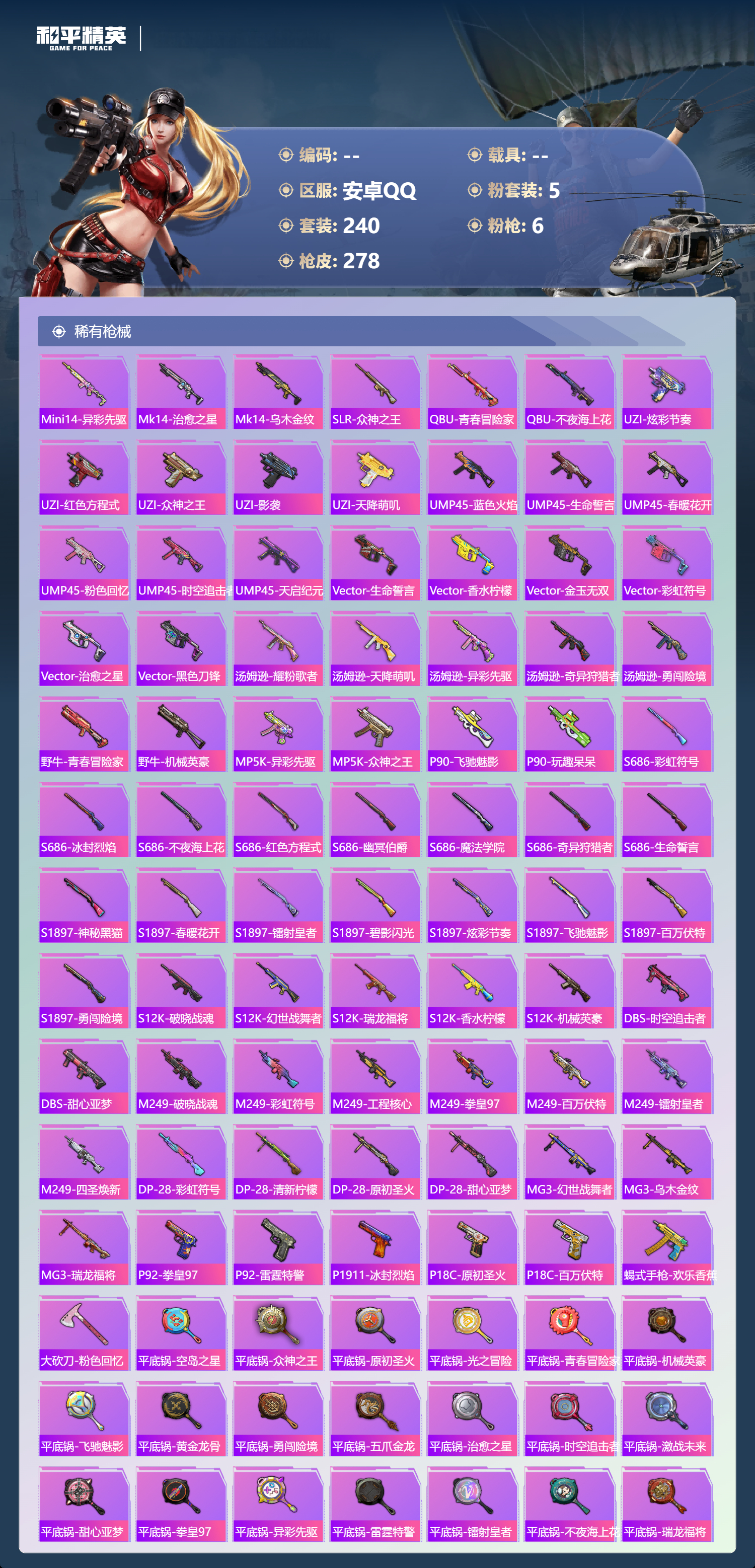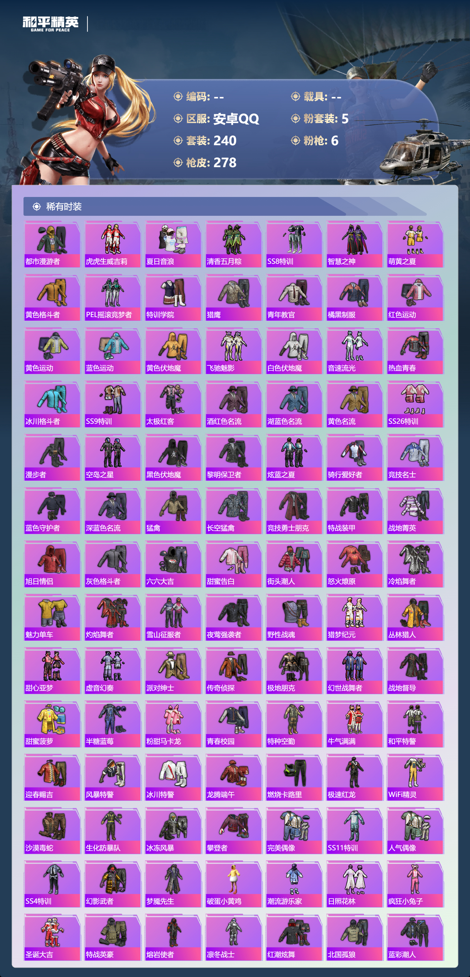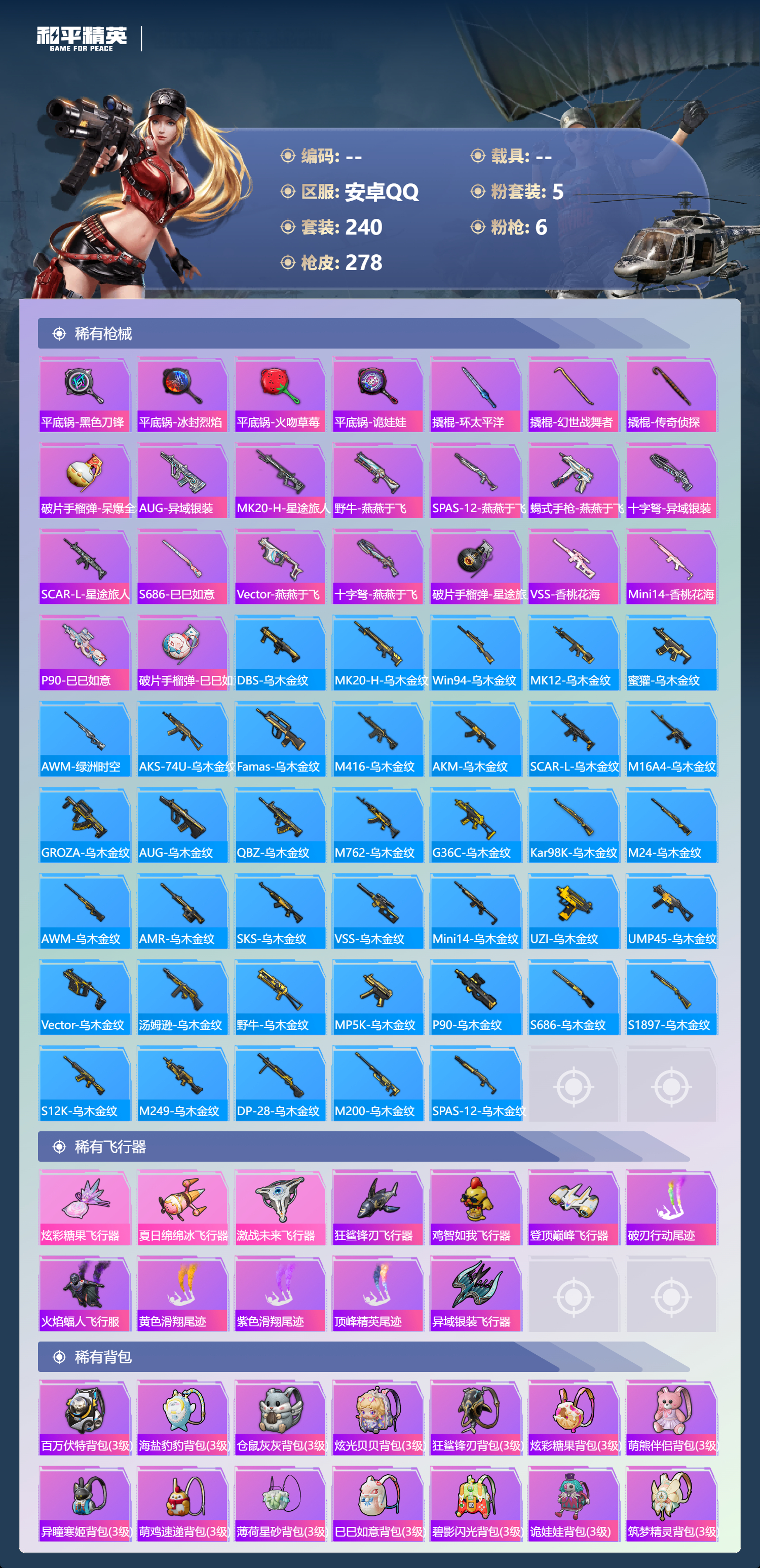 0载具-240套装-278呛皮-【 agfox战队服小丑鱼哥特5粉装6升级呛】安卓手q-15王牌印记-5粉装-6特效呛-91940热力值-240套装-278呛皮【5粉装】套装-梦幻火箭套装-银刃赛罗套装-苍蓝魅影套装-快乐主宰套装-极致幻想【6特效呛】dp-28-豹影疾电/5级slr-暗夜玫瑰/5级蜜獾-异瞳寒姬/3级akm-炫紫旋律/6级kar98k-巳巳如意/1级m416-心之恋语/7级