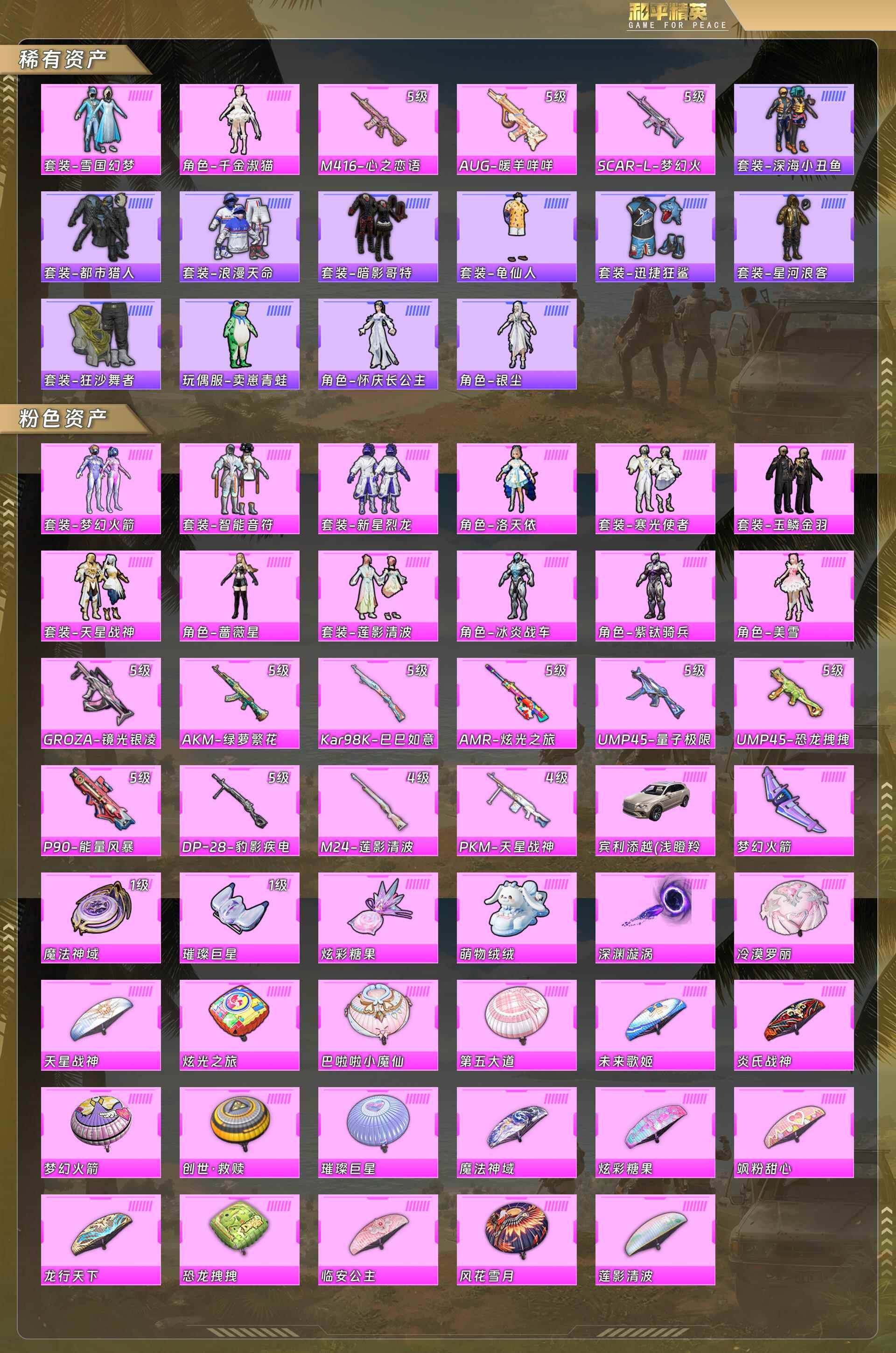素材号-地铁满天赋-雪国/千金淑猫/深海小丑鱼/都市/浪漫天命/红眼罩/梦幻火箭/智能音符/新星烈龙/洛天依/寒光使者/玉鳞金羽/天星战神/蔷薇星/莲影清波/冰炎战车/紫钛骑兵/美雪/m4心之恋语5级/aug暖羊咩咩5级/scar梦幻火箭5级/ak绿萝繁花5级/amr炫光之旅5级/ump恐龙拽拽5级/p90能量风暴5级/宾利添越棕(14粉套13粉呛1载具)没战神框hp4357-6粉色飞行器-65112热力值-10王牌印记-132套装-190呛皮 【热门品类】:粉装-雪国幻梦,粉装-梦幻火箭,套装-浪漫天命,套装-都市猎人,套装-深海小丑鱼,套装-星河浪客,角色-忠真马岱,角色-忠义严颜,套装-龟仙人,套装-暗影哥特 【粉色载具】:宾利添越(浅瞪羚棕) 【粉色套装】:粉装-雪国幻梦,粉装-梦幻火箭,粉装-智能音符,粉装-新星烈龙,角色-洛天依,粉装-寒光使者,粉装-玉鳞金羽,粉装-天星战神,角色-蔷薇星,粉装-莲影清波,角色-冰炎战车,角色-紫钛骑兵,角色-美雪,角色-千金淑猫 【粉色呛皮等级】:akm-绿萝繁花五级,scar-l-梦幻火箭五级,m416-心之恋语五级,groza-镜光银凌五级,aug-暖羊咩咩五级,ump45-恐龙拽拽五级,ump45-量子极限五级,p90-能量风暴五级,kar98k-巳巳如意五级,m24-莲影清波四级,amr-炫光之旅五级,dp-28-豹影疾电五级,pkm-天星战神四级 【粉色呛皮】:akm-绿萝繁花,scar-l-梦幻火箭,m416-心之恋语,groza-镜光银凌,aug-暖羊咩咩,ump45-恐龙拽拽,ump45-量子极限,p90-能量风暴,kar98k-巳巳如意,m24-莲影清波,amr-炫光之旅,dp-28-豹影疾电,pkm-天星战神 【粉色飞行器】:梦幻火箭飞行器,璀璨巨星飞行器,萌物绒绒飞行器,魔法神域飞行器,深渊漩涡飞行器 【粉色降落伞】:梦幻火箭降落伞,风花雪月降落伞,恐龙拽拽降落伞,第五大道降落伞,飒粉甜心降落伞,天星战神降落伞,璀璨巨星降落伞,炎氏战神降落伞,未来歌姬降落伞,炫光之旅降落伞,莲影清波降落伞,龙行天下降落伞,巴啦啦小魔仙降落伞,创世·救赎降落伞,魔法神域降落伞,临安公主降落伞,冷漠罗丽降落伞 【稀有套装】:套装-龟仙人,套装-雏菊兔兔,套装-萝兰蝴蝶,套装-小熊娃娃,角色-怀庆长公主,套装-燕燕于飞,套装-鱼渊荷华,套装-粉恋花,套装-紫幽梦,套装-蓝冰羽,角色-瑰梦爱神,套装-朱霞炽焰,套装-凌霄紫焰,套装-擎苍青焰,套装-炫彩糖果 【稀有呛皮】:aug-冰晶雪宝,akm-彩虹符号,akm-恐龙拽拽,akm-缤纷海域,akm-霓虹街区,akm-龙的传人,m16a4-莲影清波,scar-l-夜灯,scar-l-炫彩节奏,m416-动感兔斯基,m416-红色方程式,groza-影袭,groza-恐龙拽拽,groza-懵萌河马,aug-耀粉歌者,q-未来歌姬,m762-动感兔斯基,m762-彩虹符号,m762-快乐主宰,mk47-炫光之旅,g36c-懵萌河马,ac-val-天降萌叽,ac-val-彩虹甜喵,ac-val-快闪甜心,ac-val-闲梦青缨,蜜獾-天降萌叽,蜜獾-娇憨猪猪,arx-凌霄紫焰,uzi-啾咪啾咪,uzi-天降萌叽,ump45-夜灯,ump45-炫光之旅,ump45-生命誓言,vect-焰鹰斗篷,vect-炎氏战神,vect-生命誓言,vect-龙行天下,vect-创世·救赎,汤姆逊-天降萌叽,汤姆逊-奇异狩猎者,汤姆逊-炫彩节奏,汤姆逊-甜梦小狐,野牛-天星战神,js9-凌霄紫焰,p90-快闪甜心,kar98k-彩虹符号,kar98k-影袭,kar98k-梦幻火箭,m24-奇异狩猎者,awm-焰鹰斗篷,awm-圣堂之誓,awm-恐龙拽拽,sks-糯团青竹,mini14-梦幻火箭,mini14-涂山之恋,mk14-治愈之星,莫辛纳甘-懵萌河马,m417-惊鸿侠骨,mk20-h-快闪甜心,mk20-h-莲影清波,m200-惊鸿侠骨,svd-冷漠罗丽,s686-生命誓言,s1897-百万伏特,s12k-玩趣呆呆,s12k-夜灯,dbs-焰鹰斗篷,dbs-圣堂之誓,aa12-g-炫光之旅,m249-彩虹符号,m249-莲影清波,dp-28-焰鹰斗篷,dp-28-彩虹符号,mg3-幻世战舞者,mg3-惊鸿侠骨,mg3-璀璨巨星,pkm-懵萌河马,mg-36-凌霄紫焰,p92-凌霄紫焰,短管霰弹-竹节火铳,沙墨之鹦-快闪甜心,tmp-9-江南烟雨,爆炸猎弓-天星战神,爆炸猎弓-惊鸿侠骨,大砍刀-2p战斗服款,平底锅-凌霄紫焰 【其他套装】:套装-ss24特训,套装-ss25特训,套装-ss26特训,套装-ss27特训,套装-ss28特训,套装-ss29特训,套装-光之冒险,套装-夏日倾情,套装-旭日情侣,套装-暗影哥特,套装-浪漫天命,套装-海岛探路者,套装-涂山之恋,套装-燃烧卡路里,套装-狂沙舞者,套装-王牌教练,套装-白色伏地魔,套装-破蛋小黄鸡,套装-空岛之星,套装-竞技名士,套装-红色运动,套装-绯格组合,套装-缤纷果语,套装-荣耀,套装-蓝色运动,套装-超能勇士,套装-长空猛禽,套装-霓虹街区,套装-青涩时光,套装-青玉碎影,套装-魅力单车,套装-鹤鸣,套装-黄色伏地魔,套装-黄色运动,套装-黑色伏地魔,套装-龙的传人,套装-龟仙人,套装-冰冻风暴,套装-贵族骑装,套装-深海小丑鱼,套装-呆萌铁蟹,套装-迅捷狂鲨,套装-弄潮海豚,套装-坚韧舞者,套装-罗小黑,套装-激萌罗小黑,套装-豚鼠丹丹,套装-雪兔飞飞,套装-奶芙汪汪,套装-恶魔喵喵,套装-懵萌河马,套装-神气柴柴,套装-闪耀新星,套装-绝对偶像,套装-惊鸿侠骨,套装-锦衣飞扬,套装-金戈铁马,套装-日照花林,套装-深海梦境,套装-果汁能量,套装-晨曦薄雾,套装-快闪甜心,套装-春光漫游,套装-贝斯之夜,套装-焰鹰斗篷,套装-幻羽潜行,角色-湖雨初晴,角色-银尘,套装-纯真浪花,套装-热情海星,套装-湖畔霞光 【稀有头盔】:梦幻火箭头盔3级,梦幻火箭头盔2级,梦幻火箭头盔1级,雪国精灵头盔3级,雪国精灵头盔2级,雪国精灵头盔1级,百万伏特头盔3级,深海小丑鱼头盔2级,深海小丑鱼头盔1级 【稀有背包】:梦幻火箭背包3级,梦幻火箭背包2级,梦幻火箭背包1级,雪国精灵背包3级,雪国精灵背包2级,雪国精灵背包1级,金风玉露背包3级,金风玉露背包2