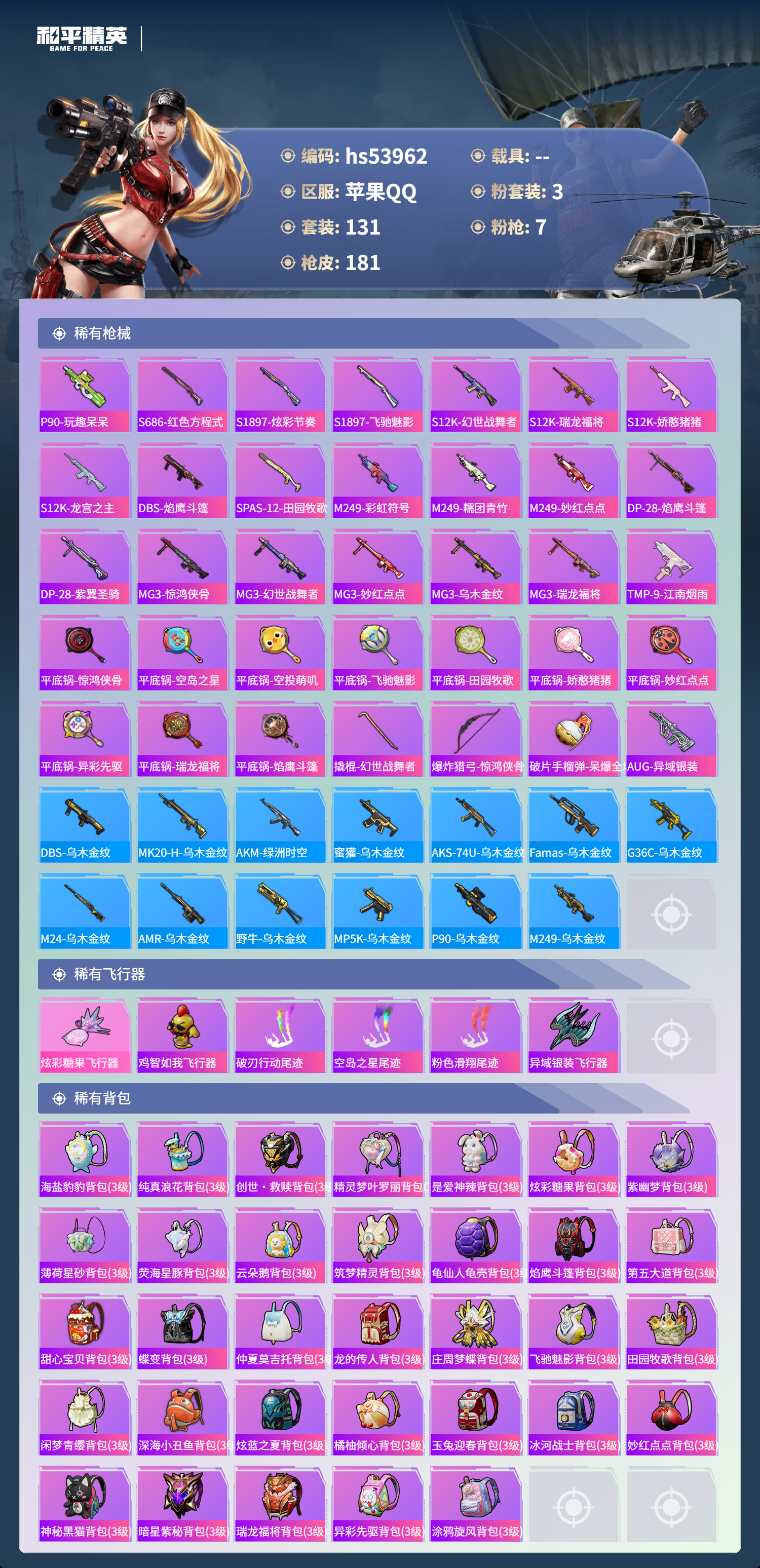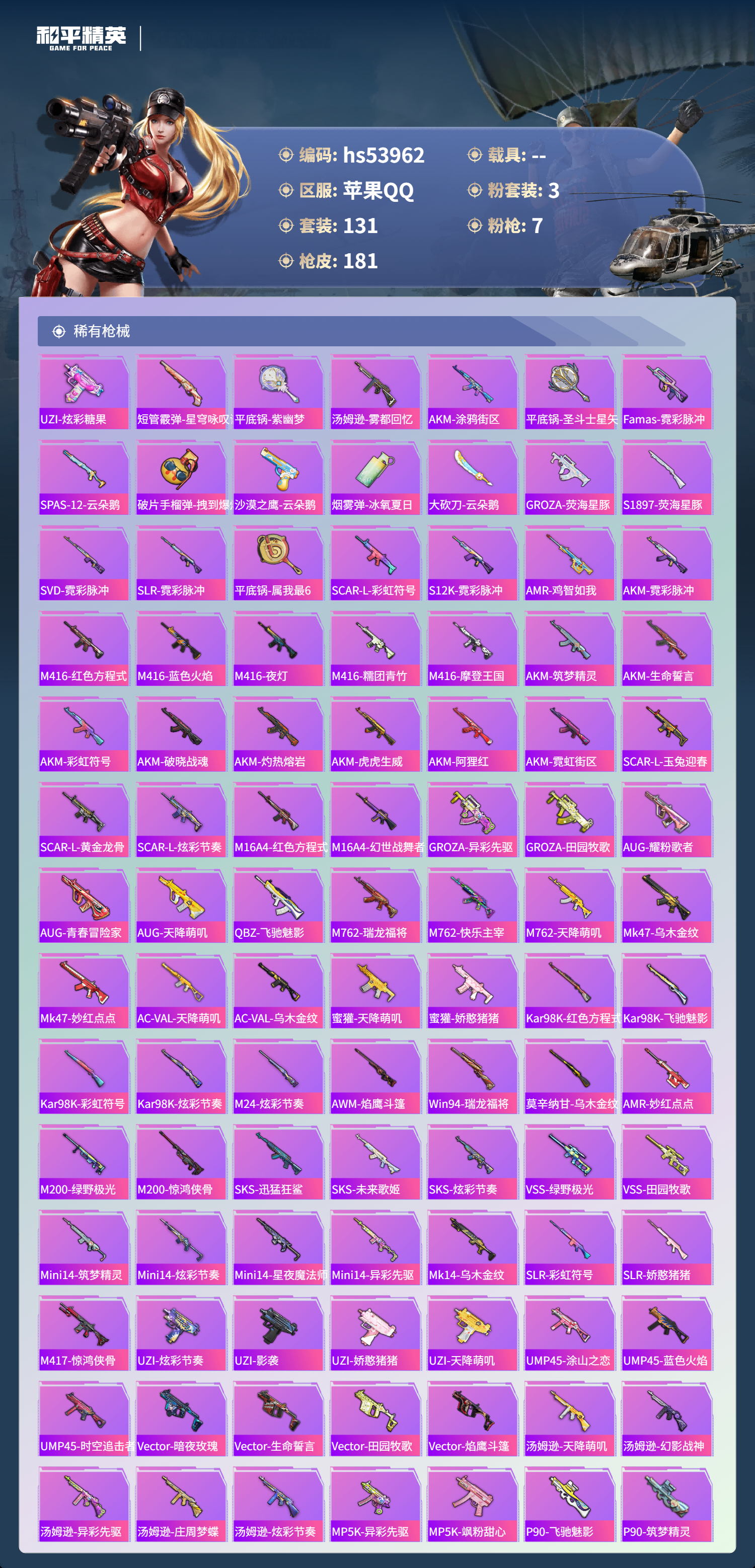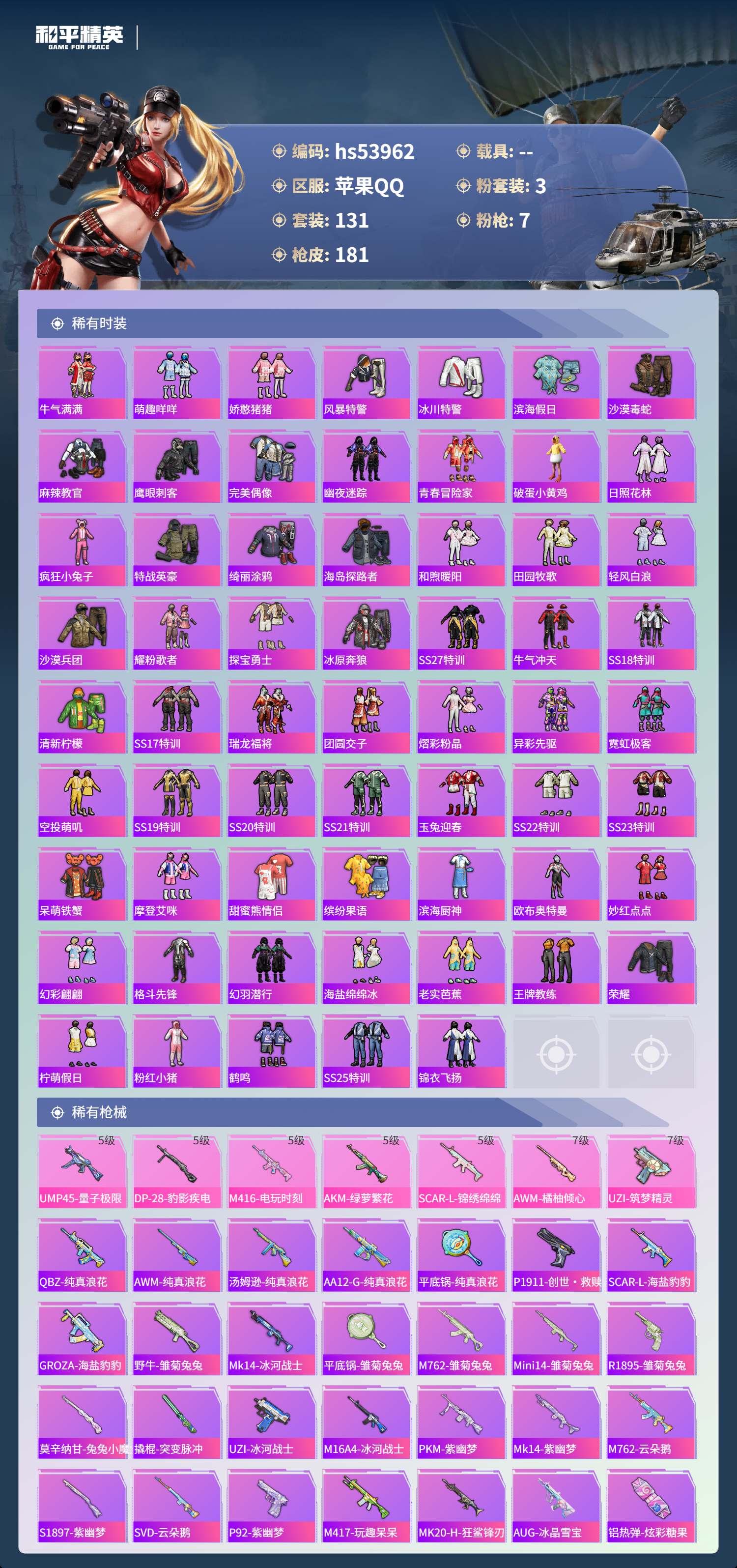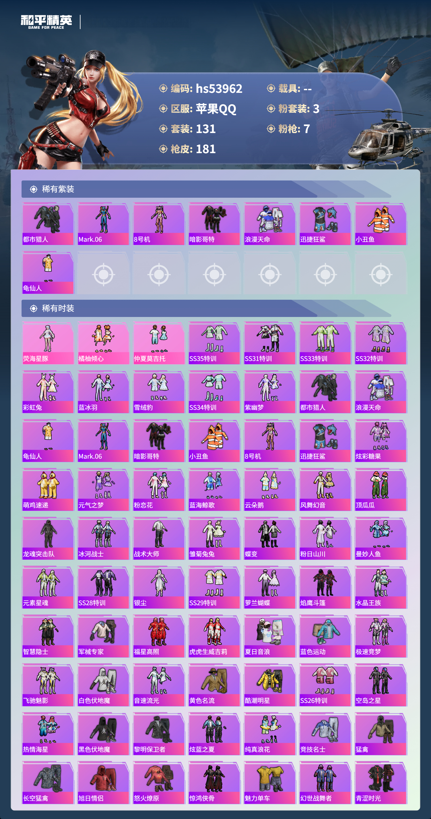 hs53962 苹果手q-8王牌印记-3粉装-7特效呛-54498热力值-131套装-181呛皮【3粉装】套装-橘柚倾心角色-荧海星豚套装-仲夏莫吉托【7特效呛】ump45-量子极限/5级uzi-筑梦精灵/7级awm-橘柚倾心/7级akm-绿萝繁花/5级m416-电玩时刻/5级scar-l-锦绣绵绵/5级dp-28-豹影疾电/5级【8稀有紫装】都市猎人mark.068号机