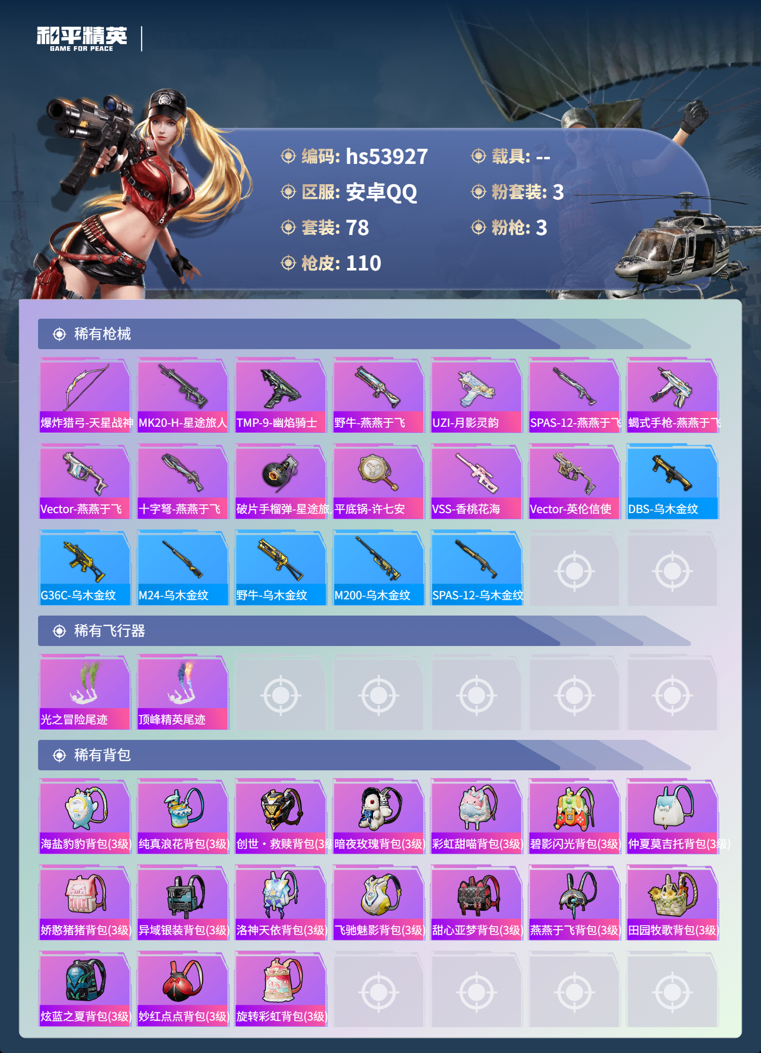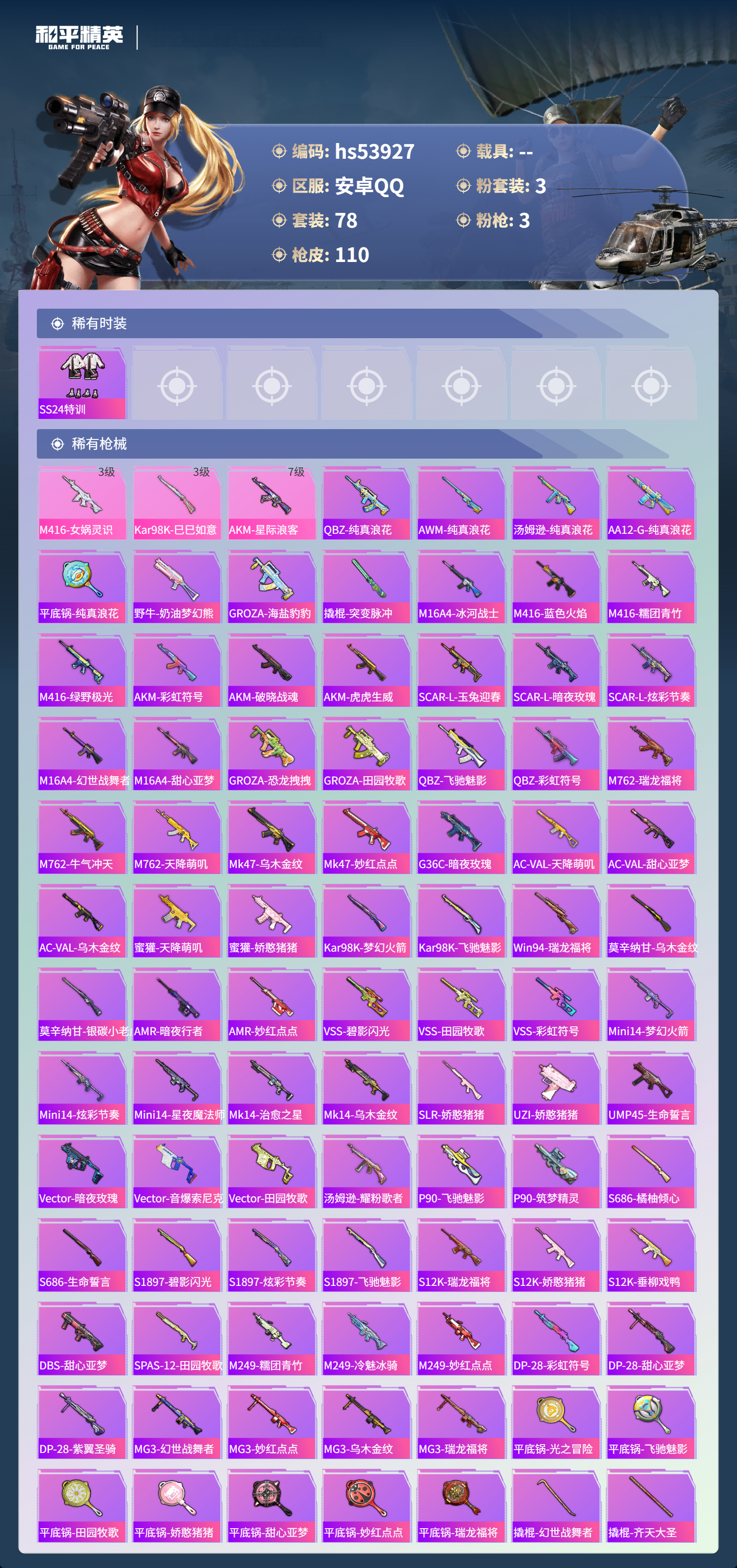 hs53927 安卓手q-8王牌印记-3粉装-3特效呛-36551热力值-78套装-110呛皮-1卓越印记-1传奇印记【3粉装】套装-梦幻火箭套装-创世·救赎套装-齐天大圣【3特效呛】kar98k-巳巳如意/3级m416-女娲灵识/3级akm-星际浪客/7级【2稀有紫装】mark.06龟仙人【78稀有时装】梦幻火箭ss31特训ss33特训龟仙人mark.06创世·救赎