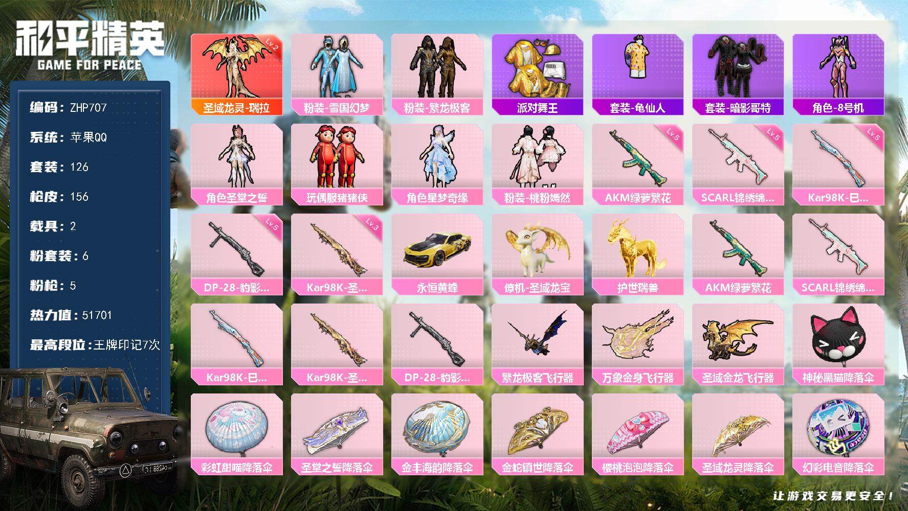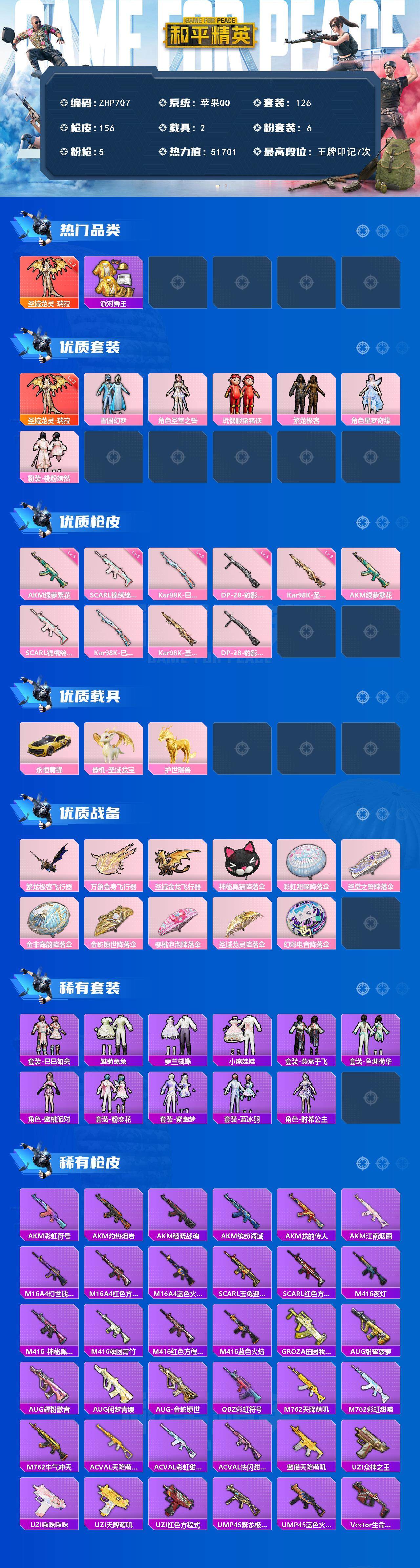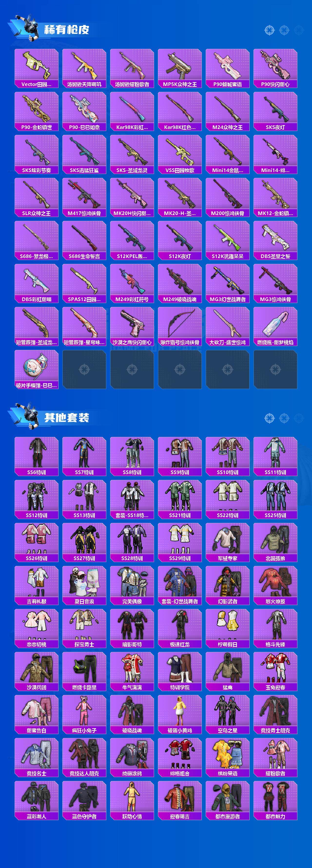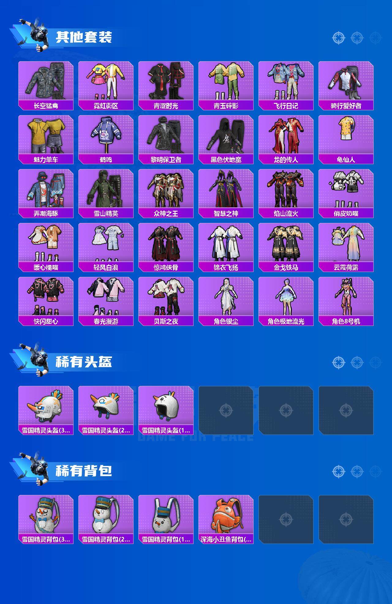 苹果 手q-1神装-6粉装-5特效呛-2载具-3粉色飞行器-51701热力值-7王牌印记-126套装-156呛皮-二级瑞拉!雪国!金鞋!哥特眼罩! 【热门品类】:粉装-雪国幻梦,粉装-繁龙极客,套装-派对舞王,套装-龟仙人,套装-暗影哥特,角色-8号机 【红色神装等级】:圣域龙灵-瑞拉二级 【红色角色神装】:圣域龙灵-瑞拉 【粉色套装】:粉装-雪国幻梦,角色-圣堂之誓,玩偶服-猪猪侠,粉装-繁龙极客,角色-星梦奇缘,粉装-桃粉嫣然 【粉色呛皮等级】:akm-绿萝繁花五级,scar-l-锦绣绵绵五级,kar98k-巳巳如意五级,kar98k-圣域龙灵三级,dp-28-豹影疾电五级 【粉色载具】:永恒黄蜂,僚机-圣域龙宝,护世瑞兽 【粉色呛皮】:akm-绿萝繁花,scar-l-锦绣绵绵,kar98k-巳巳如意,kar98k-圣域龙灵,dp-28-豹影疾电 【粉色飞行器】:繁龙极客飞行器,万象金身飞行器,圣域金龙飞行器 【粉色降落伞】:神秘黑猫降落伞,彩虹甜喵降落伞,圣堂之誓降落伞,金丰海韵降落伞,金蛇镇世降落伞,樱桃泡泡降落伞,圣域龙灵降落伞,幻彩电音降落伞 【稀有套装】:套装-龟仙人,套装-巳巳如意,套装-雏菊兔兔,套装-萝兰蝴蝶,套装-小熊娃娃,套装-燕燕于飞,套装-鱼渊荷华,角色-蜜桃派对,套装-粉恋花,套装-紫幽梦,套装-蓝冰羽,角色-时希公主 【稀有呛皮】:akm-彩虹符号,akm-江南烟雨,akm-灼热熔岩,akm-破晓战魂,akm-缤纷海域,akm-龙的传人,m16a4-幻世战舞者,m16a4-红色方程式,m16a4-蓝色火焰,scar-l-玉兔迎春,scar-l-红色方程式,m416-夜灯,m416-神秘黑猫,m416-糯团青竹,m416-红色方程式,m416-蓝色火焰,groza-田园牧歌,aug-甜蜜菠萝,aug-耀粉歌者,aug-闲梦青缨,aug-金蛇镇世,q-彩虹符号,m762-天降萌叽,m762-彩虹甜喵,m762-牛气冲天,ac-val-天降萌叽,ac-val-彩虹甜喵,ac-val-快闪甜心,蜜獾-天降萌叽,uzi-众神之王,uzi-啾咪啾咪,uzi-天降萌叽,uzi-红色方程式,ump45-繁龙极客,ump45-蓝色火焰,vect-生命誓言,vect-田园牧歌,汤姆逊-天降萌叽,汤姆逊-耀粉歌者,mp5k-众神之王,p90-倾城蜜语,p90-快闪甜心,p90-金蛇镇世,p90-巳巳如意,kar98k-彩虹符号,kar98k-红色方程式,m24-众神之王,sks-夜灯,sks-炫彩节奏,sks-迅猛狂鲨,sks-圣域龙灵,vss-田园牧歌,mini14-金鼠迎春,mini14-绯穹魔姬,slr-众神之王,m417-惊鸿侠骨,mk20-h-快闪甜心,mk20-h-圣域龙灵,m200-惊鸿侠骨,mk12-金蛇镇世,s686-繁龙极客,s686-生命誓言,s12k-玩趣呆呆,s12k-pel轰鸣竞梦者,s12k-夜灯,dbs-圣堂之誓,dbs-彩虹甜喵,spas-12-田园牧歌,m249-彩虹符号,m249-破晓战魂,mg3-幻世战舞者,mg3-惊鸿侠骨,短管霰弹-圣域龙灵,短管霰弹-星穹咏叹调,沙墨之鹦-快闪甜心,爆炸猎弓-惊鸿侠骨,大砍刀-盛世惊鸿,燃烧瓶-甜梦桃焰,破片手留单-巳巳如意 【其他套装】:套装-ss6特训,套装-ss7特训,套装-ss8特训,套装-ss9特训,套装-ss10特训,套装-ss11特训,套装-ss12特训,套装-ss13特训,套装-ss18特训,套装-ss21特训,套装-ss22特训,套装-ss25特训,套装-ss26特训,套装-ss27特训,套装-ss28特训,套装-ss29特训,套装-军械专家,套装-北国孤狼,套装-吉莉礼服,套装-夏日音浪,套装-完美偶像,套装-幻世战舞者,套装-幻影武者,套装-怒火燎原,套装-恋恋初桃,套装-探宝勇士,套装-暗影哥特,套装-极速红龙,套装-柠萌假日,套装-格斗先锋,套装-沙漠兵团,套装-燃烧卡路里,套装-牛气满满,套装-特训学院,套装-猛禽,套装-玉兔迎春,套装-甜蜜告白,套装-疯狂小兔子,套装-破晓战魂,套装-破蛋小黄鸡,套装-空岛之星,套装-竞技勇士朋克,套装-竞技名士,套装-竞技达人朋克,套装-绮丽涂鸦,套装-绯格组合,套装-缤纷果语,套装-耀粉歌者,套装-蓝彩潮人,套装-蓝色守护者,套装-跃动心情,套装-迎春赐吉,套装-都市漫游者,套装-都市魅力,套装-长空猛禽,套装-霓虹街区,套装-青涩时光,套装-青玉碎影,套装-飞行日记,套装-骑行爱好者,套装-魅力单车,套装-鹤鸣,套装-黎明保卫者,套装-黑色伏地魔,套装-龙的传人,套装-龟仙人,套装-弄潮海豚,套装-雪山精英,套装-众神之王,套装-智慧之神,套装-焰山流火,套装-俏皮奶喵,套装-暖心橘喵,套装-轻风白浪,套装-惊鸿侠骨,套装-锦衣飞扬,套装-金戈铁马,套装-云霞荷露,套装-快闪甜心,套装-春光漫游,套装-贝斯之夜,角色-银尘,角色-极地流光,角色-8号机 【稀有头盔】:雪国精灵头盔3级,雪国精灵头盔2级,雪国精灵头盔1级 【稀有背包】:雪国精灵背包3级,雪国精灵背包2级,雪国精灵背包1级,深海小丑鱼背包3级 【营地id】:918904679
