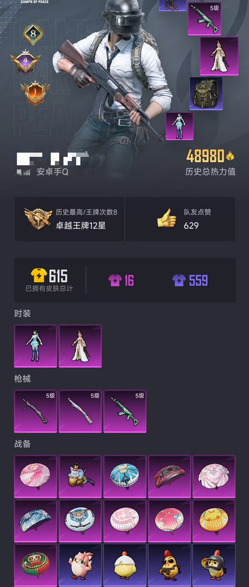 【小丑鱼 2粉装3特效呛可秒换绑】 安卓q区-48980热力值-8印记-133套装-176呛皮 【1稀有】 awm-黄金龙骨【2粉装】 角色-萨利娅 角色-异瞳寒姬【3特效呛】 m762-青锋波束5级 kar98k-巳巳如意5级 dp-28-豹影疾电5级【26热门】 m416-蓝色火焰 groza-彩虹符号 长空猛禽 虚音幻奏 甜心亚梦 牛气冲天 风暴特警 浪漫天命 鹰眼刺客 破蛋小