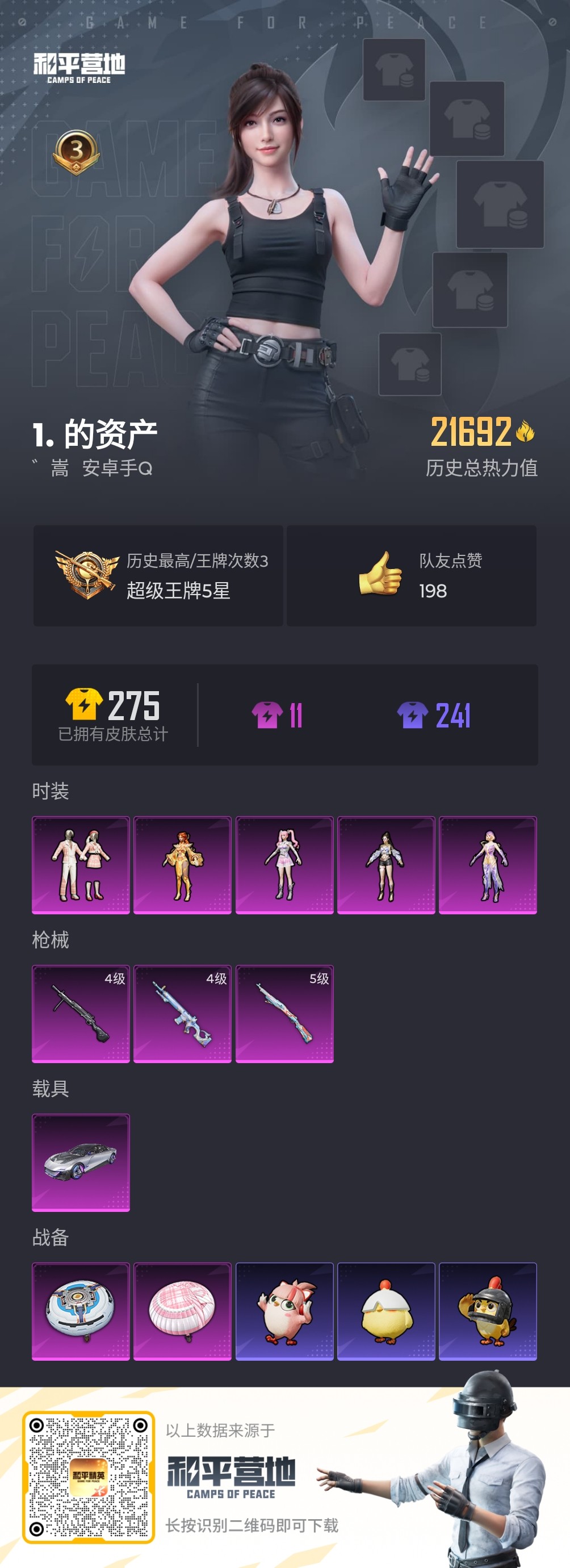 【和平精英】【txhp5063】5粉装,3特效呛,1载具,历史最高段位:超级王牌5星 王牌印记3次 热力值:21693,71套装,72呛械,69装备,47战备;套装:套装-第五大道,时空协奏·回响,时空协奏·心弦,角色-金域紫灵,角色-羲和光序,套装-特训学院,套装-猎鹰,套装-青年教官,套装-橘黑制服,套装-红色运动,套装-黄色运动,套装-蓝色运动,套装-黄色伏地魔,套装-白色伏地魔,套装-黑色伏地魔,套装-竞技名士,套装-湖蓝色名流,套装-黄色名流,套装-长空猛禽,套装-漫步者,套装-海岛探路者,套装-冷焰舞者,套装-春日漫步,套装-鹰眼刺客,套装-冰冻风暴,套装-街头潮人,套装-魅力单车,套装-破晓战魂,套装-都市魅力,套装-缤纷果语,套装-滨海厨神,套装-元素星魂,套装-粉红小猪,套装-破蛋小黄鸡,套装-疯狂小兔子,套装-鹤鸣,套装-白熊同盟,套装-白糯汤圆,套装-战术大师,套装-耀粉歌者,套装-tt战队服,套装-柠萌假日,套装-恋语绒绒,套装-街头风暴,套装-小熊娃娃,套装-ss29特训,套装-雏菊兔兔,套装-萝兰蝴蝶,角色-绯色魅影,套装-异域银装,角色-摩登魅猫,套装-星途旅人,套装-ss30特训,套装-青团波波,套装-糖糖葫芦,玩偶服-憨乐熊二,套装-绒宝小鹅,套装-ss31特训,套装-鱼渊荷华,套装-燕燕于飞,套装-智谋强哥,套装-ss33特训,套装-巳巳如意,套装-ss32特训,套装-大橘大利,套装-星影赞美诗,套装-ss34特训,套装-朱霞炽焰,套装-凌霄紫焰,套装-薄荷星砂,套装-ss35特训;呛皮:m762-第五大道,m762-天降萌叽,m762-雏菊兔兔,q-彩虹符号,akm-荧星灵猫,scar-l-炫彩节奏,scar-l-星途旅人,mk47-炫光之旅,ac-val-天降萌叽,蜜獾-糖糖葫芦,蜜獾-乌木金纹,aug-甜蜜菠萝,aug-天降萌叽,aug-异域银装,aug-月影灵韵,aug-紫晶流影,groza-海盐豹豹,arx-凌霄紫焰,famas-乌木金纹,m24-影袭,5级kar98k-巳巳如意,m200-乌木金纹,mk20-h-星途旅人,mk20-h-樱桃泡泡,mk20-h-糖糖葫芦,mk20-h-乌木金纹,mini14-穿刺龙虾,mini14-雏菊兔兔,sks-迅猛狂鲨,mk14-冰河战士,4级mk12-雪月幻音,vect-生命誓言,vect-燕燕于飞,uzi-影袭,uzi-天降萌叽,uzi-月影灵韵,js9-凌霄紫焰,野牛-雏菊兔兔,野牛-燕燕于飞,ump45-猪猪侠,ump45-海盐豹豹,ump45-糖糖葫芦,aks-74u-乌木金纹,p90-玩趣呆呆,p90-巳巳如意,p90-乌木金纹,汤姆逊-天降萌叽,mp5k-乌木金纹,s12k-夜灯,s12k-玩趣呆呆,s686-生命誓言,s686-巳巳如意,spas-12-燕燕于飞,spas-12-乌木金纹,s1897-糯团青竹,4级dp-28-豹影疾电,dp-28-彩虹符号,mg3-幻世战舞者,mg3-第五大道,mg-36-凌霄紫焰,pkm-啾咪啾咪,p18c-糖糖葫芦,r1895-雏菊兔兔,蝎式手呛-燕燕于飞,p92-凌霄紫焰,平底锅-雏菊兔兔,平底锅-糖糖葫芦,平底锅-凌霄紫焰,破片手留单-星途旅人,破片手留单-巳巳如意,爆炸猎弓-雪月幻音,十子怒-燕燕于飞;载具:星河领航磐石银;降落伞:招财竹蜻蜓飞行器; 详情看图3王牌印记/2.1w热力值/5粉/第五大道/3特/1车