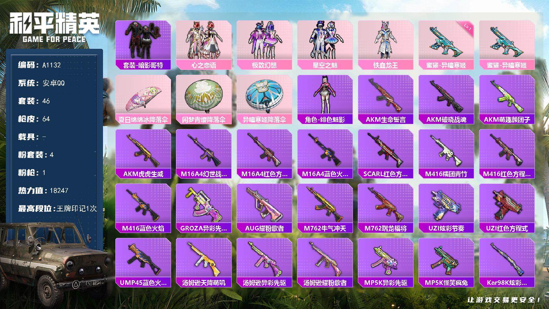 [14809070]安卓【小号 暗影哥特 心之恋语 极致幻想 星空之魅 铁血龙王 蜜獾-异瞳寒姬 异瞳寒姬降落伞 】 手q-4粉装-1特效呛-0载具-1粉色飞行器-18247热力值-1王牌印记-46套装-64呛皮 【热门品类】:套装-暗影哥特 【粉色套装】:粉装-心之恋语,粉装-极致幻想,粉装-星空之魅,粉装-铁血龙王 【粉色呛皮等级】:蜜獾-异瞳寒姬一级 【粉色呛皮】:蜜獾-异瞳寒姬 【粉色降落伞】:夏日绵绵冰降落伞,闲梦青缨降落伞,异瞳寒姬降落伞 【稀有套装】:角色-绯色魅影,套装-炫彩糖果 【稀有呛皮】:akm-生命誓言,akm-破晓战魂,akm-萌趣颜团子,akm-虎虎生威,m16a4-幻世战舞者,m16a4-红色方程式,m16a4-蓝色火焰,scar-l-红色方程式,m416-糯团青竹,m416-红色方程式,m416-蓝色火焰,groza-异彩先驱,aug-耀粉歌者,m762-牛气冲天,m762-瑞龙福将,uzi-炫彩节奏,uzi-红色方程式,ump45-蓝色火焰,汤姆逊-天降萌叽,汤姆逊-异彩先驱,汤姆逊-耀粉歌者,mp5k-异彩先驱,mp5k-怪笑疯兔,kar98k-炫彩节奏,kar98k-红色方程式,m24-炫彩节奏,sks-炫彩节奏,vss-彩虹符号,mini14-异彩先驱,mini14-海渊国主,mini14-耀粉歌者,win94-瑞龙福将,s686-红色方程式,s1897-炫彩节奏,s12k-瑞龙福将,s12k-破晓战魂,s12k-幻世战舞者,m249-破晓战魂,dp-28-彩虹符号,mg3-幻世战舞者,mg3-瑞龙福将,信号呛-奇迹舞步 【其他套装】:套装-ss16特训,套装-ss17特训,套装-ss18特训,套装-ss19特训,套装-ss20特训,套装-ss21特训,套装-夏日音浪,套装-幻世战舞者,套装-怒火燎原,套装-探宝勇士,套装-暗影哥特,套装-海上生明月,套装-滨海假日,套装-炫蓝之夏,套装-热血青春,套装-牛气冲天,套装-牛气满满,套装-特种颜团子,套装-疯狂小兔子,套装-白色伏地魔,套装-破蛋小黄鸡,套装-福星高照,套装-竞技名士,套装-绮丽涂鸦,套装-耀眼新星,套装-耀粉歌者,套装-萌趣颜团子,套装-虎虎生威吉莉,套装-长空猛禽,套装-霓虹街区,套装-魅力单车,套装-冰川特警,套装-黑色刀锋,套装-抹茶蜜豆,套装-瑞龙福将,套装-团圆交子