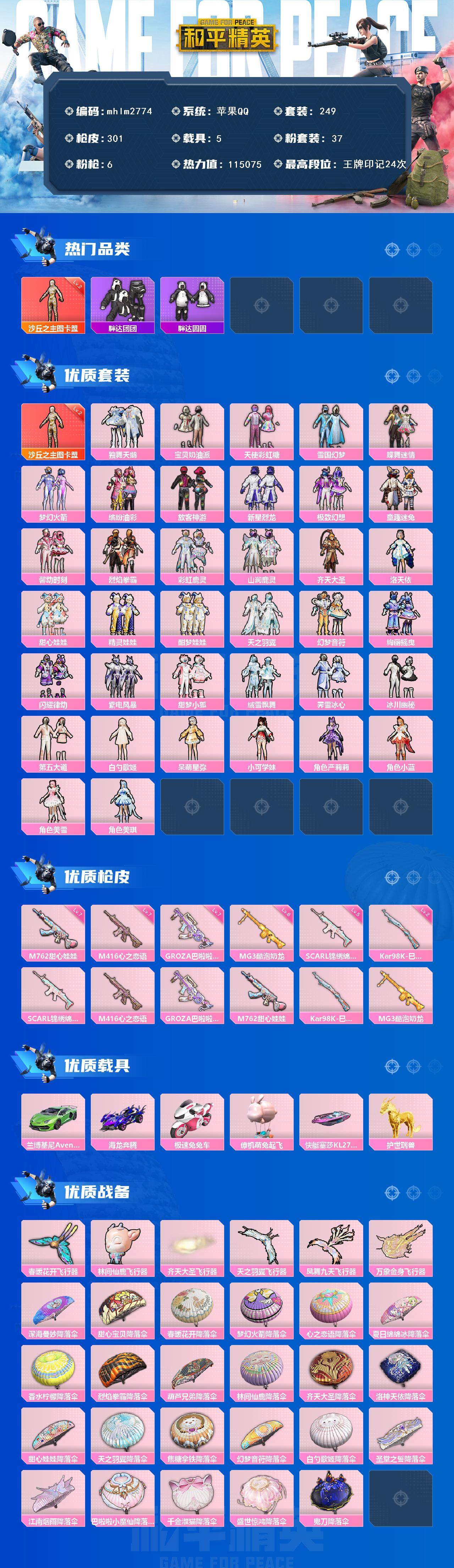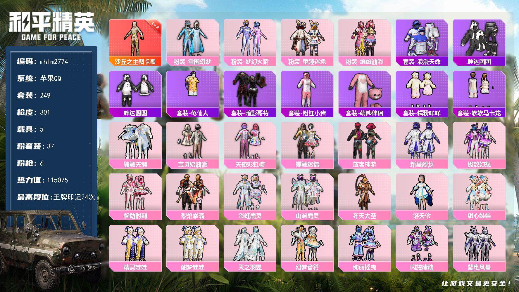 [14815376]【mhlm2774】苹果 手q-1神装-37粉装-6特效呛-5载具-6粉色飞行器-115075热力值-24王牌印记-249套装-301呛皮 【红色神装等级】:沙丘之主-图卡盟二级 【红色角色神装】:沙丘之主-图卡盟 【热门品类】:粉装-雪国幻梦,粉装-梦幻火箭,粉装-童趣迷兔,粉装-缤纷油彩,套装-浪漫天命,套装-胖达团团,套装-胖达圆圆,套装-龟仙人,套装-暗影哥特,套装-粉红小猪,套装-萌熊伴侣,套装-糯粉咩咩,套装-软软马卡龙 【粉色套装】:粉装-独舞天鹅,粉装-宝贝奶油派,粉装-天使彩虹糖,粉装-雪国幻梦,粉装-蝶舞迷情,粉装-梦幻火箭,粉装-缤纷油彩,粉装-放客神游,粉装-新星烈龙,粉装-极致幻想,粉装-童趣迷兔,粉装-馨动时刻,粉装-烈焰拳霸,粉装-彩虹鹿灵,粉装-山涧鹿灵,粉装-齐天大圣,角色-洛天依,粉装-甜心娃娃,粉装-精灵娃娃,粉装-酣梦娃娃,粉装-天之羽翼,粉装-幻梦音符,粉装-绚丽摇曳,粉装-闪耀律动,粉装-紫电风暴,粉装-甜梦小狐,粉装-绒雪飘舞,粉装-霁雪冰心,粉装-冰川幽秘,粉装-第五大道,角色-白勺歌姬,角色-呆萌星弥,角色-小可学妹,角色-严莉莉,角色-小蓝,角色-美雪,角色-美琪 【粉色呛皮等级】:scar-l-锦绣绵绵五级,m416-心之恋语七级,groza-巴啦啦小魔仙七级,m762-甜心娃娃七级,kar98k-巳巳如意二级,mg3-酷泡奶龙六级 【粉色载具】:兰博基尼aventad svj(翡翠绿),海龙奔腾,极速兔兔车,僚机-萌兔起飞,快艇-塞莎kl27(霓虹粉),护世瑞兽 【粉色呛皮】:scar-l-锦绣绵绵,m416-心之恋语,groza-巴啦啦小魔仙,m762-甜心娃娃,kar98k-巳巳如意,mg3-酷泡奶龙 【粉色飞行器】:春暖花开飞行器,林间仙鹿飞行器,齐天大圣飞行器,天之羽翼飞行器,凤舞九天飞行器,万象金身飞行器 【粉色降落伞】:深海曼妙降落伞,甜心宝贝降落伞,春暖花开降落伞,梦幻火箭降落伞,心之恋语降落伞,夏日绵绵冰降落伞,香水柠檬降落伞,烈焰拳霸降落伞,葫芦兄弟降落伞,林间仙鹿降落伞,齐天大圣降落伞,洛神天依降落伞,甜心娃娃降落伞,天之羽翼降落伞,焦糖拿铁降落伞,幻梦音符降落伞,白勺歌姬降落伞,圣堂之誓降落伞,江南烟雨降落伞,巴啦啦小魔仙降落伞,千金淑猫降落伞,盛世惊鸿降