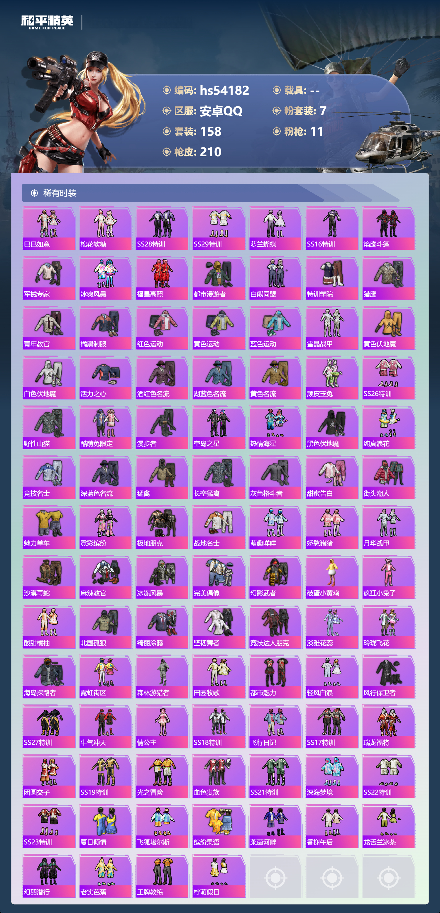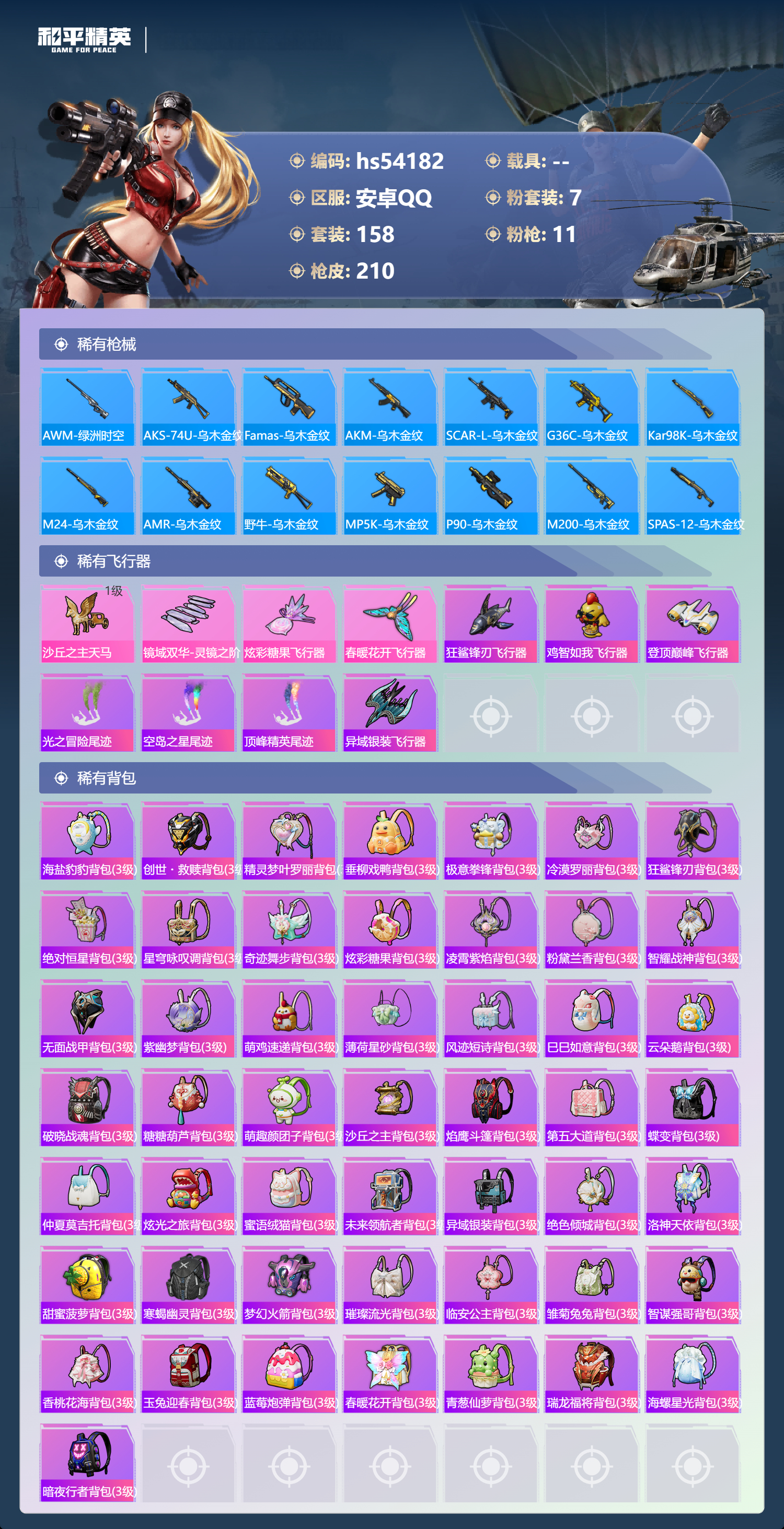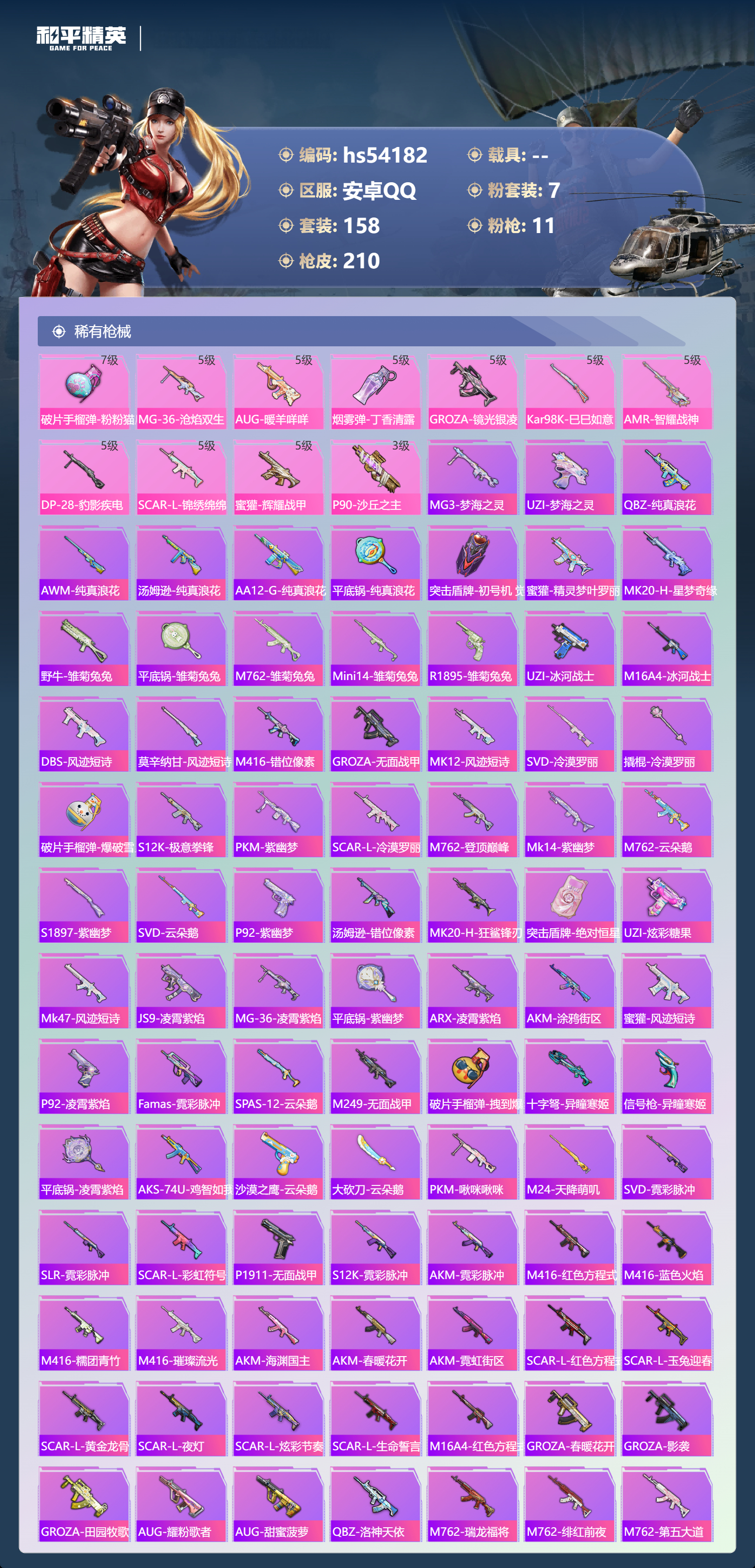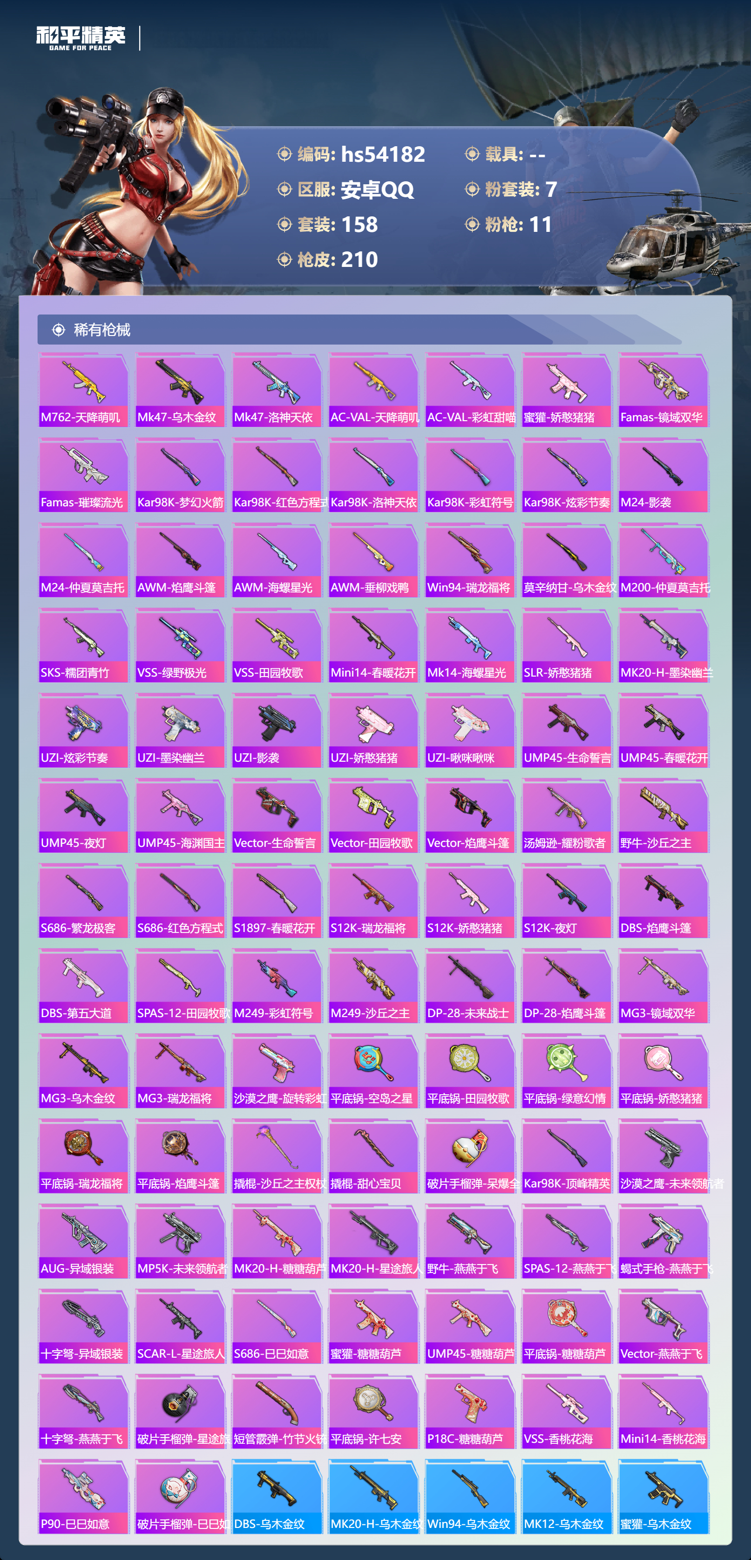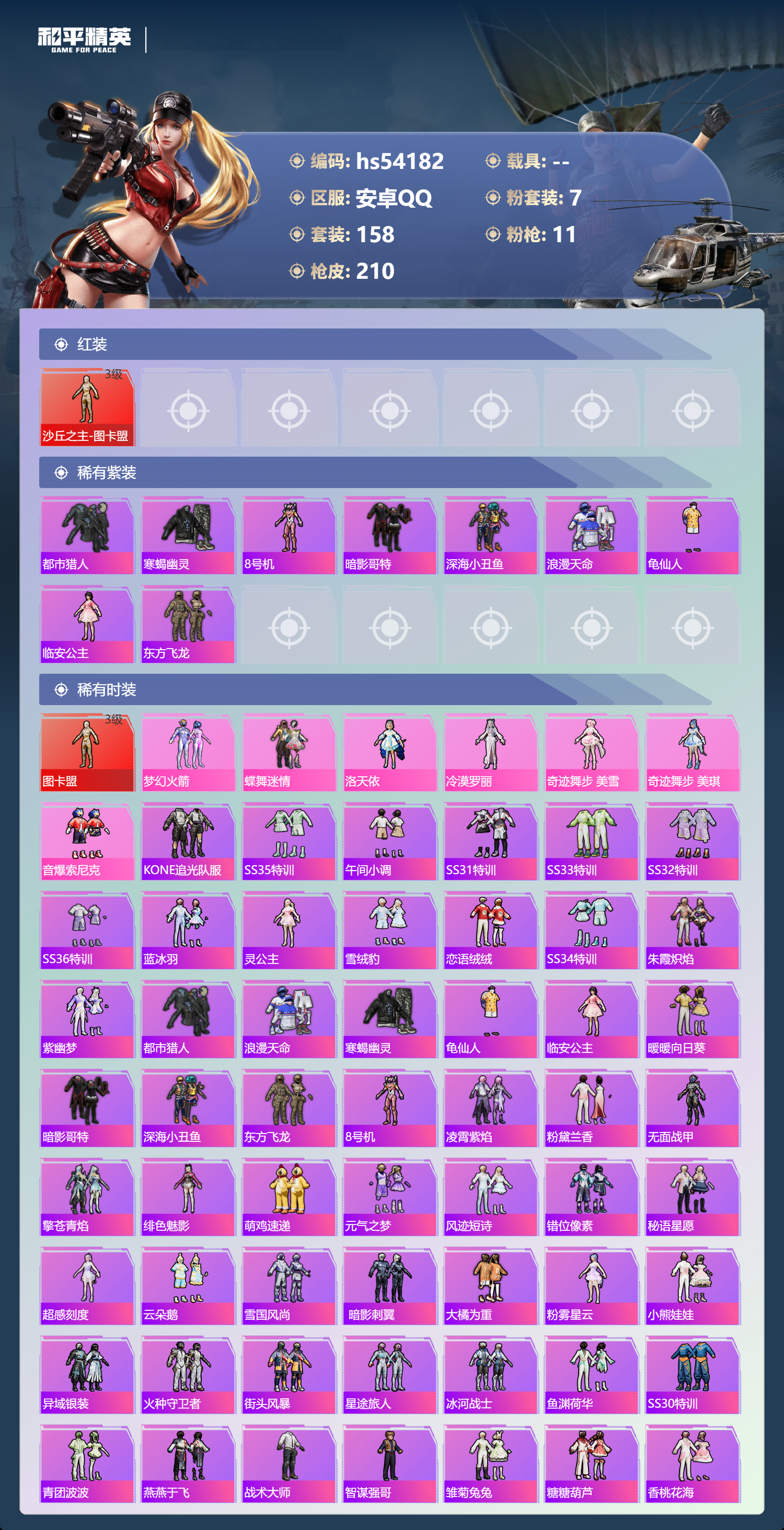 hs54182 安卓手q-12王牌印记-1红装-7粉装-11特效呛-71526热力值-158套装-210呛皮-4卓越印记-1传奇印记【1红装】沙丘之主-图卡盟/3级【7粉装】角色-奇迹舞步 美雪角色-冷漠罗丽套装-蝶舞迷情套装-梦幻火箭套装-音爆索尼克角色-奇迹舞步 美琪角色-洛天依【11特效呛】aug-暖羊咩咩/5级scar-l-锦绣绵绵/5级kar98k-巳巳如意/5级