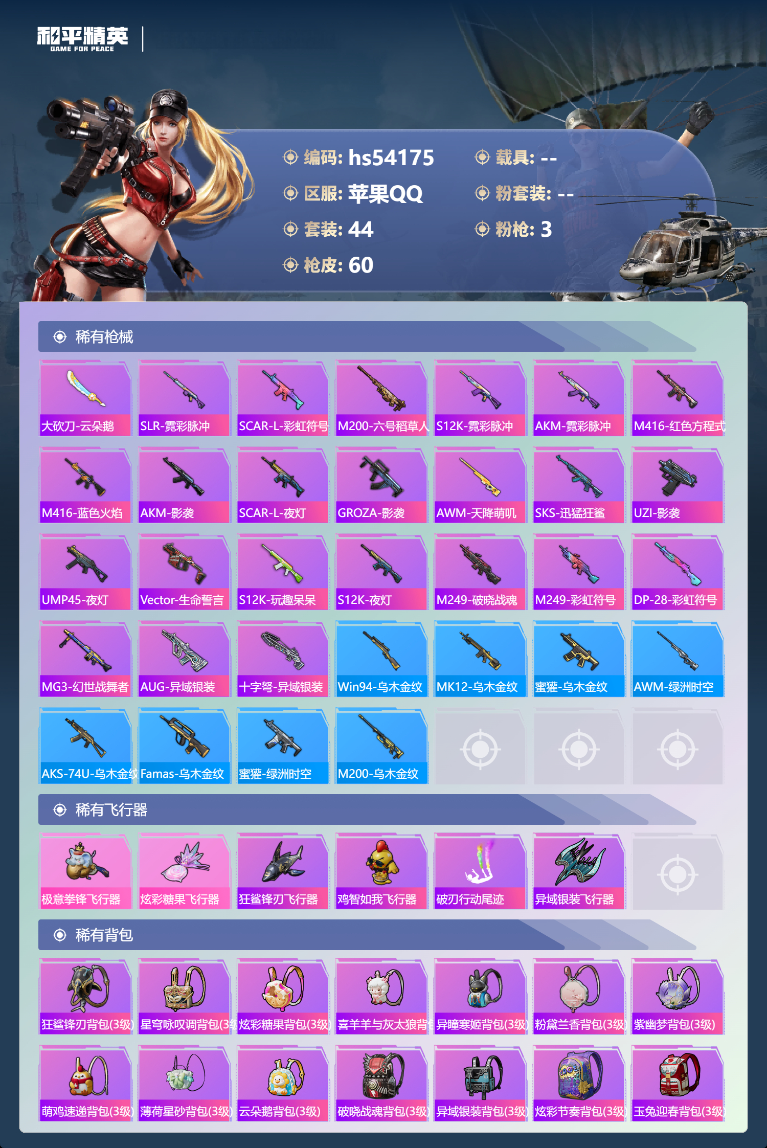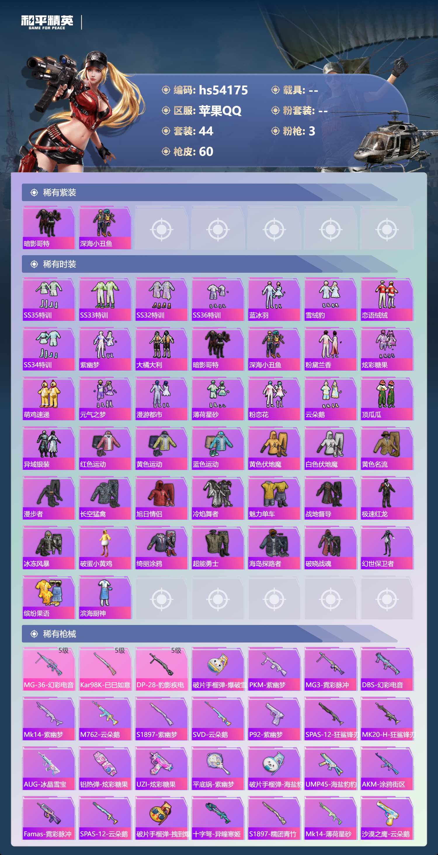 hs54175 苹果手q-4王牌印记-3特效呛-15930热力值-44套装-60呛皮【3特效呛】mg-36-幻彩电音/5级dp-28-豹影疾电/5级kar98k-巳巳如意/5级【2稀有紫装】暗影哥特深海小丑鱼【44稀有时装】ss35特训ss33特训ss32特训ss36特训蓝冰羽雪绒豹恋语绒绒ss34特训紫幽梦大橘大利暗影哥特深海小丑鱼粉黛兰香炫彩糖果萌鸡速递