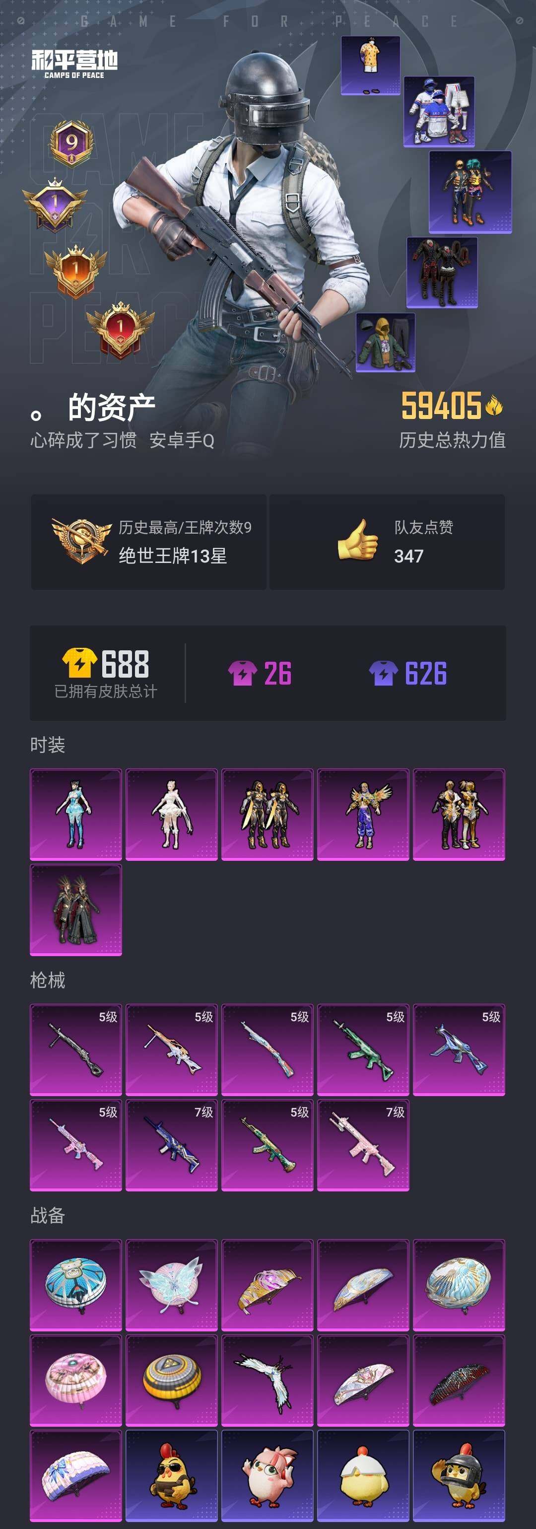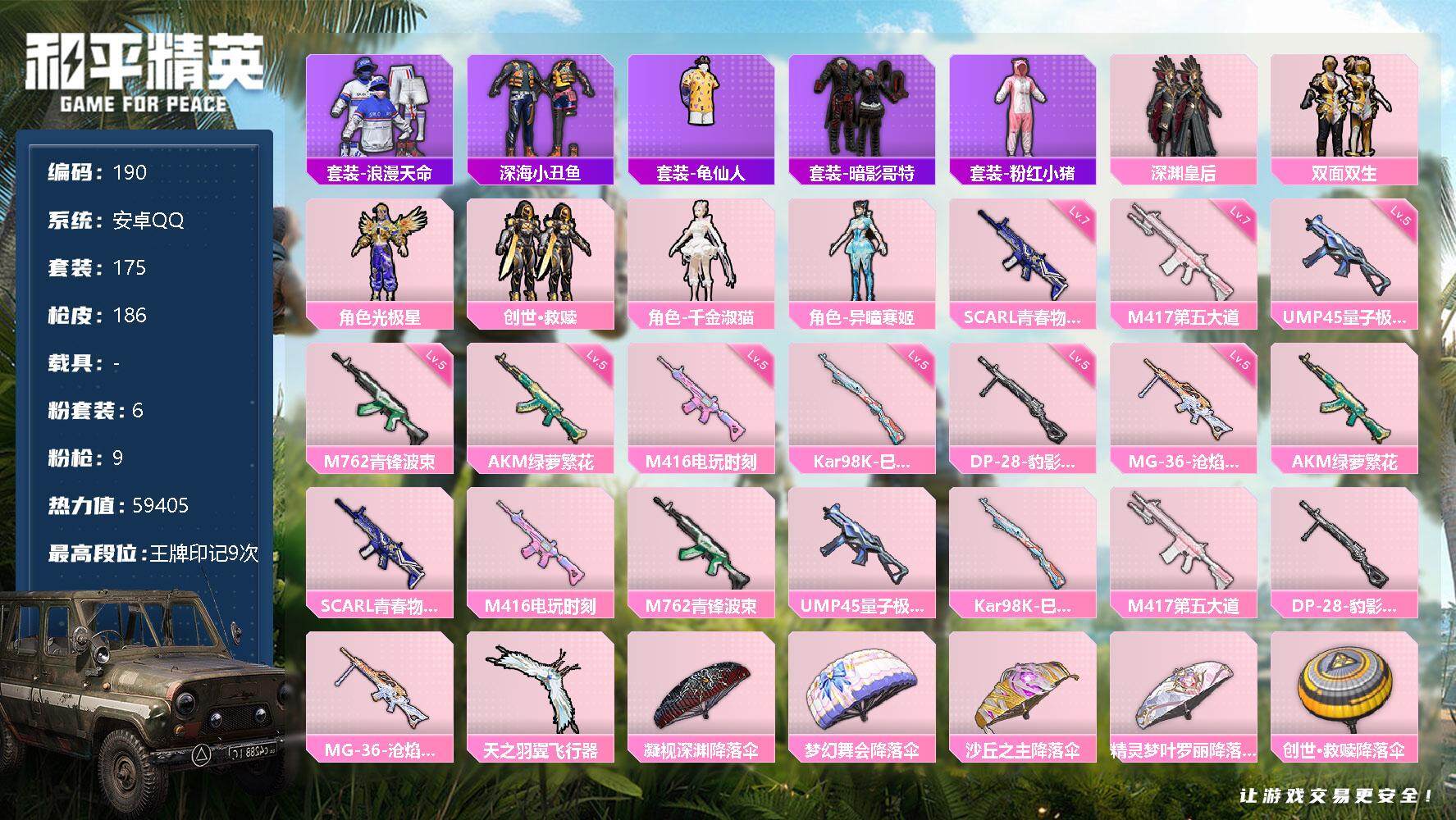 [14817057]【编号75037 可秒换绑】【店长推荐捡漏!!!顶级极品号喜欢的宝宝速抢】安卓 手q-6粉装-9特效呛-0载具-1粉色飞行器-59405热力值-9王牌印记-175套装-186呛皮 【热门品类】:套装-浪漫天命,套装-深海小丑鱼,套装-龟仙人,套装-暗影哥特,套装-粉红小猪 【粉色套装】:粉装-深渊皇后,粉装-双面双生,角色-光极星,套装-创世·救赎,角色-千金淑猫,角色-异瞳寒姬 【粉色呛皮等级】:akm-绿萝繁花五级,scar-l-青春物语七级,m416-电玩时刻五级,m762-青锋波束五级,ump45-量子极限五级,kar98k-巳巳如意五级,m417-第五大道七级,dp-28-豹影疾电五级,mg-36-沧焰双生五级 【粉色呛皮】:akm-绿萝繁花,scar-l-青春物语,m416-电玩时刻,m762-青锋波束,ump45-量子极限,kar98k-巳巳如意,m417-第五大道,dp-28-豹影疾电,mg-36-沧焰双生 【粉色飞行器】:天之羽翼飞行器 【粉色降落伞】:凝视深渊降落伞,梦幻舞会降落伞,沙丘之主降落伞,精灵梦叶罗丽降落伞,创世·救赎降落伞,守护天翼降落伞,金丰海韵降落伞,月影灵韵降落伞,晶梦幻蝶降落伞,异瞳寒姬降落伞 【稀有套装】:套装-龟仙人,套装-绒宝小鹅,套装-巳巳如意,套装-雏菊兔兔,套装-萝兰蝴蝶,套装-小熊娃娃,套装-火种守卫者,套装-糖糖葫芦,套装-青团波波,套装-棉花软糖,角色-俏兔智灵,套装-晶辉守护,套装-朱霞炽焰,套装-凌霄紫焰,套装-擎苍青焰,角色-绯色魅影,角色-紫俏灵猫 【稀有呛皮】:akm-2p战斗服款,akm-夜灯,akm-星之彼岸,akm-破晓战魂,akm-龙的传人,m16a4-凝视深渊,m16a4-幻世战舞者,scar-l-凝视深渊,scar-l-玉兔迎春,scar-l-红色方程式,m416-糯团青竹,m416-红色方程式,m416-绯红前夜,m416-蓝色火焰,groza-彩虹符号,groza-影袭,groza-懵萌河马,aug-凝视深渊,aug-天降萌叽,aug-耀粉歌者,aug-闲梦青缨,aug-金蛇镇世,q-彩虹符号,q-未来歌姬,m762-天降萌叽,m762-彩虹符号,m762-牛气冲天,mk47-炫光之旅,g36c-懵萌河马,ac-val-天降萌叽,ac-v