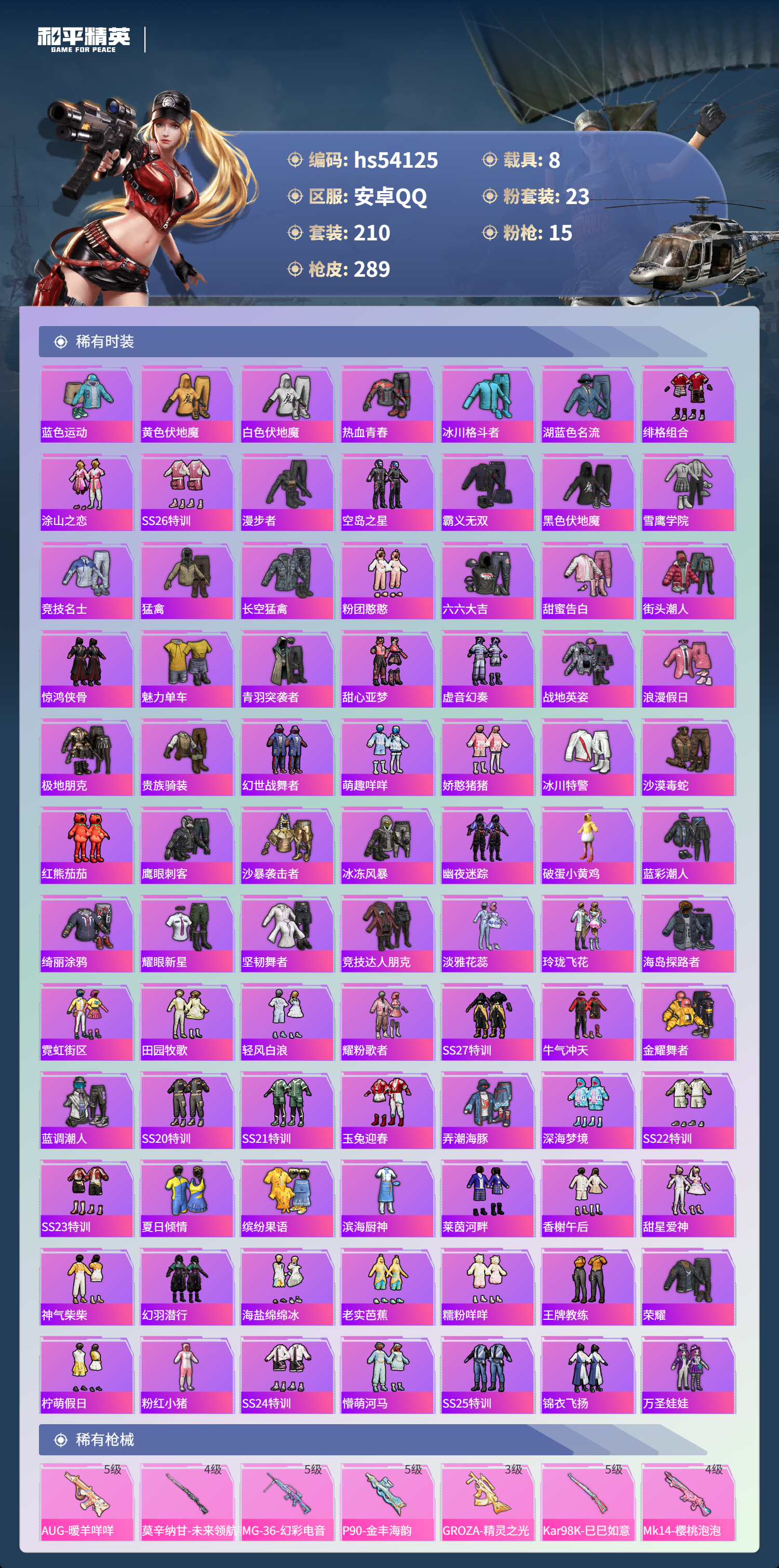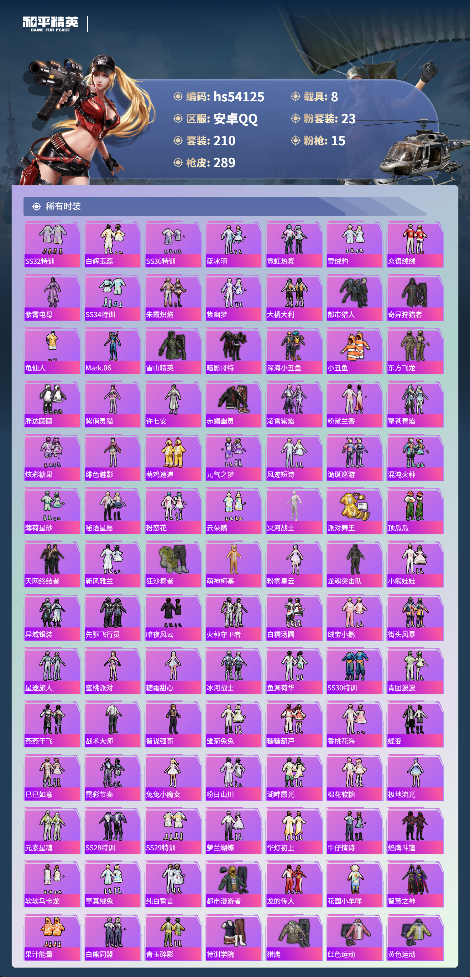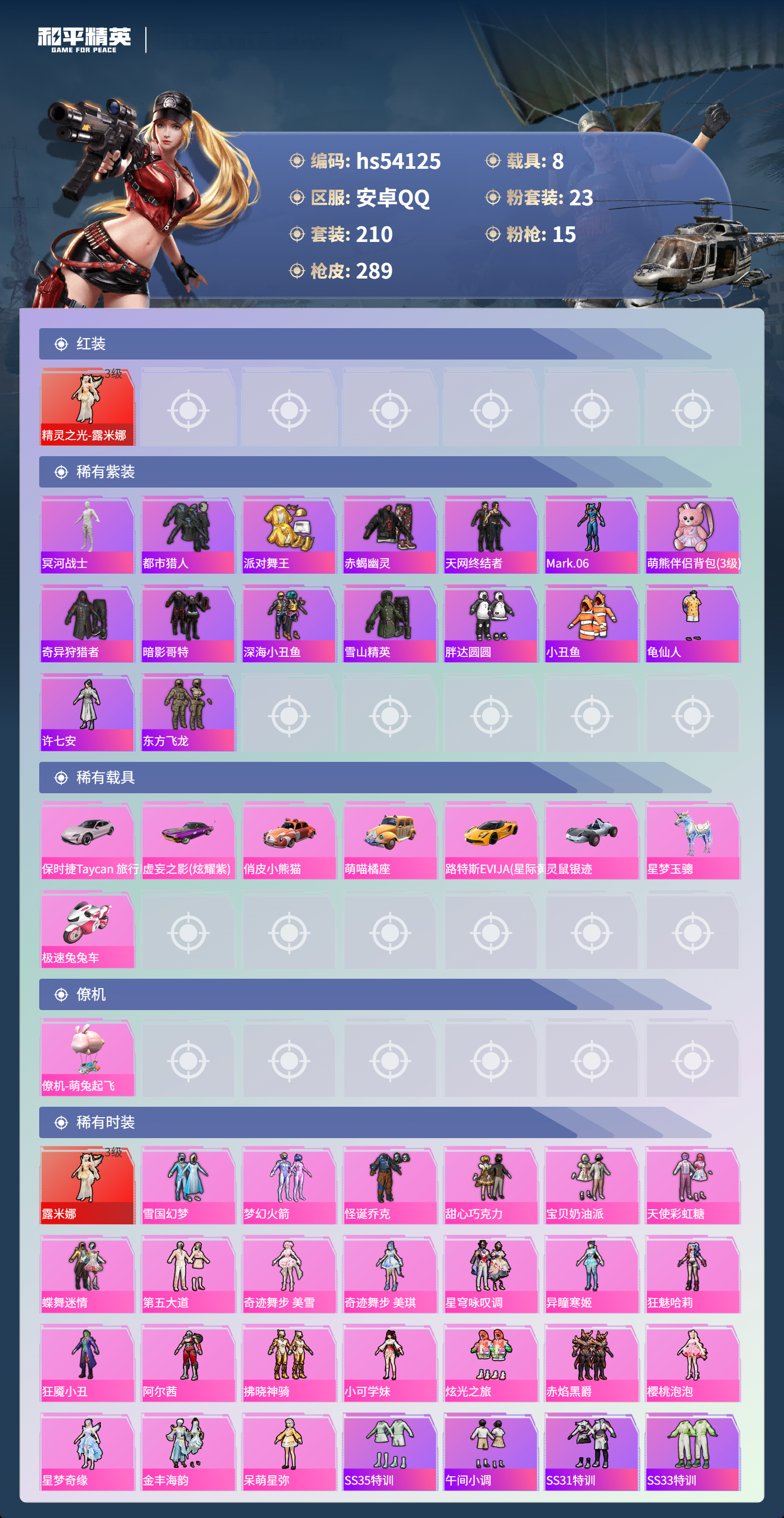 hs54125 安卓手q-16王牌印记-1红装-23粉装-15特效呛-8载具-热力值-210套装-289呛皮-6卓越印记-1传奇印记【1红装】精灵之光-露米娜/3级【23粉装】套装-星穹咏叹调套装-怪诞乔克角色-狂魇小丑套装-梦幻火箭角色-小可学妹角色-奇迹舞步 美雪角色-狂魅哈莉套装-雪国幻梦角色-异瞳寒姬套装-第五大道角色-星梦奇缘套装-赤焰黑爵角色-呆