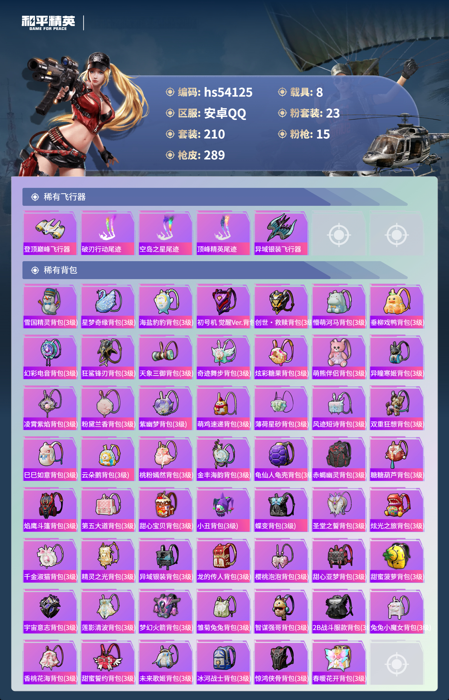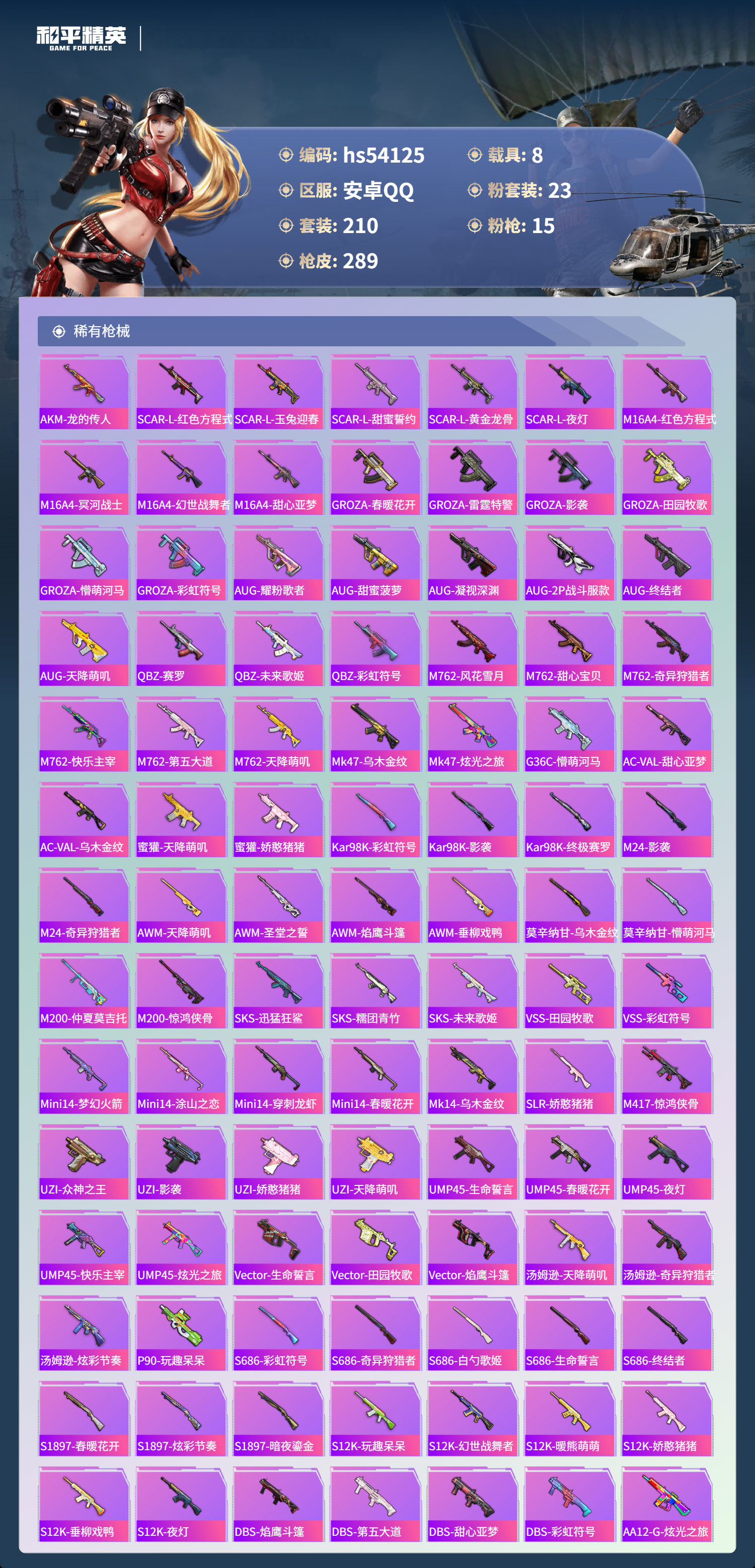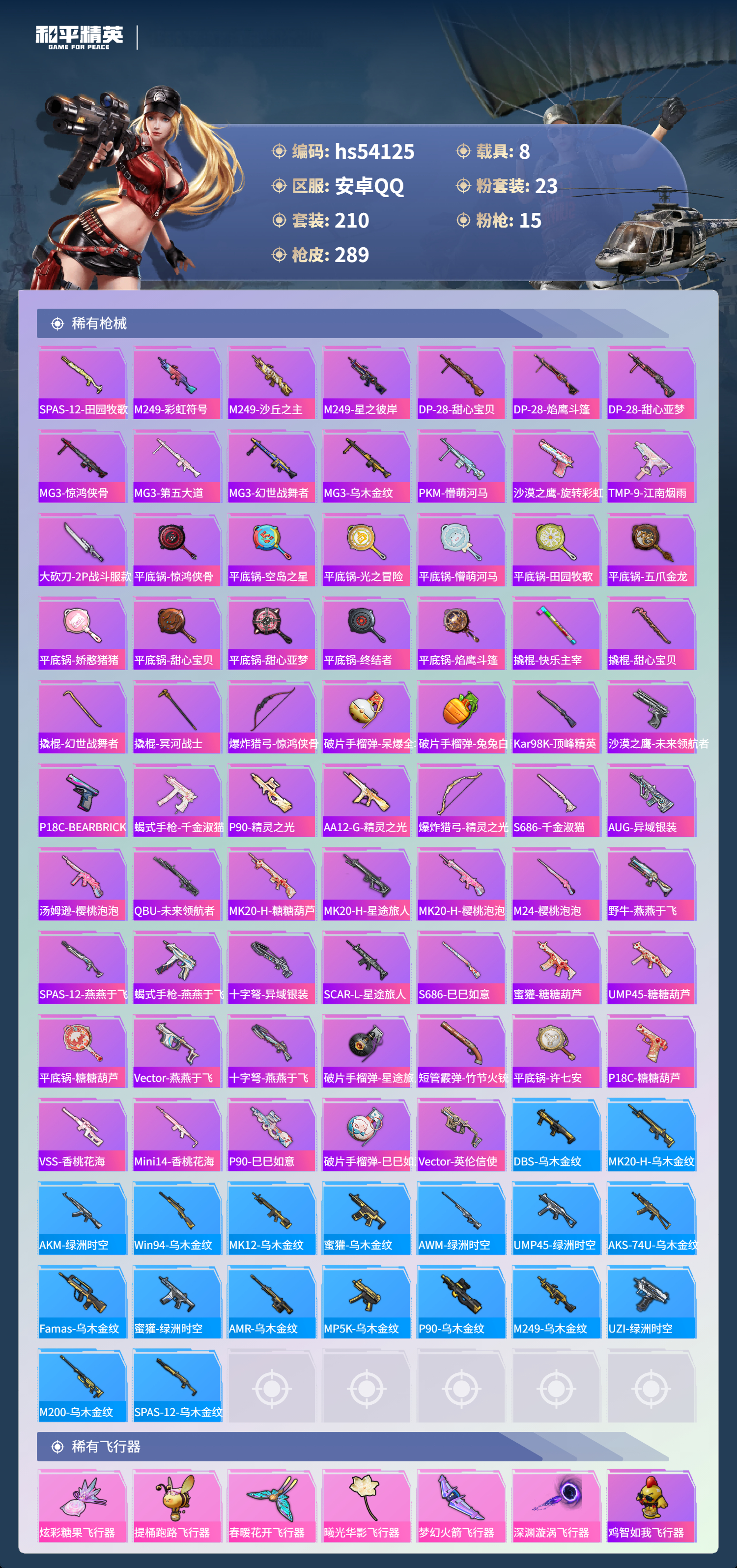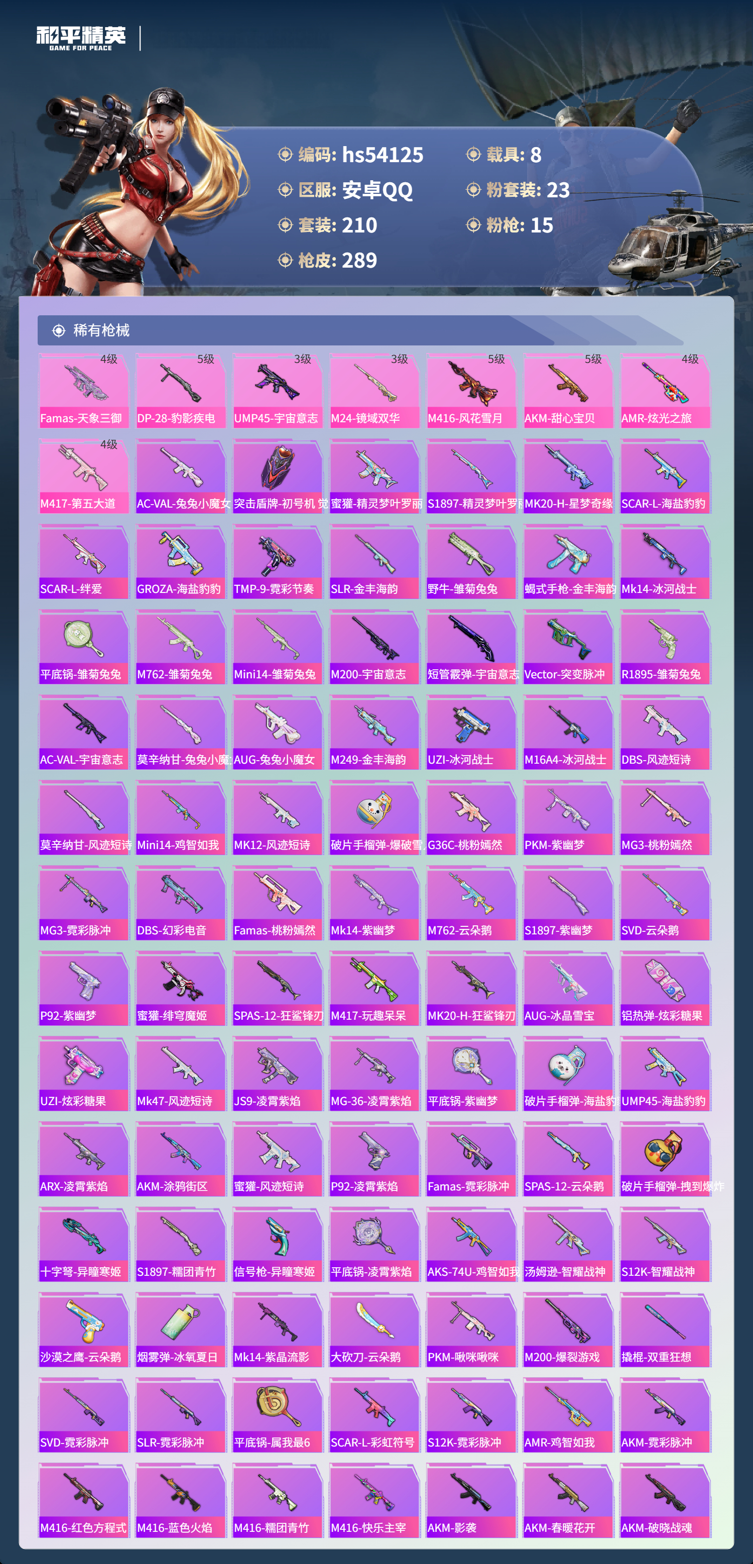 hs54125 安卓手q-16王牌印记-1红装-23粉装-15特效呛-8载具-热力值-210套装-289呛皮-6卓越印记-1传奇印记【1红装】精灵之光-露米娜/3级【23粉装】套装-星穹咏叹调套装-怪诞乔克角色-狂魇小丑套装-梦幻火箭角色-小可学妹角色-奇迹舞步 美雪角色-狂魅哈莉套装-雪国幻梦角色-异瞳寒姬套装-第五大道角色-星梦奇缘套装-赤焰黑爵角色-呆