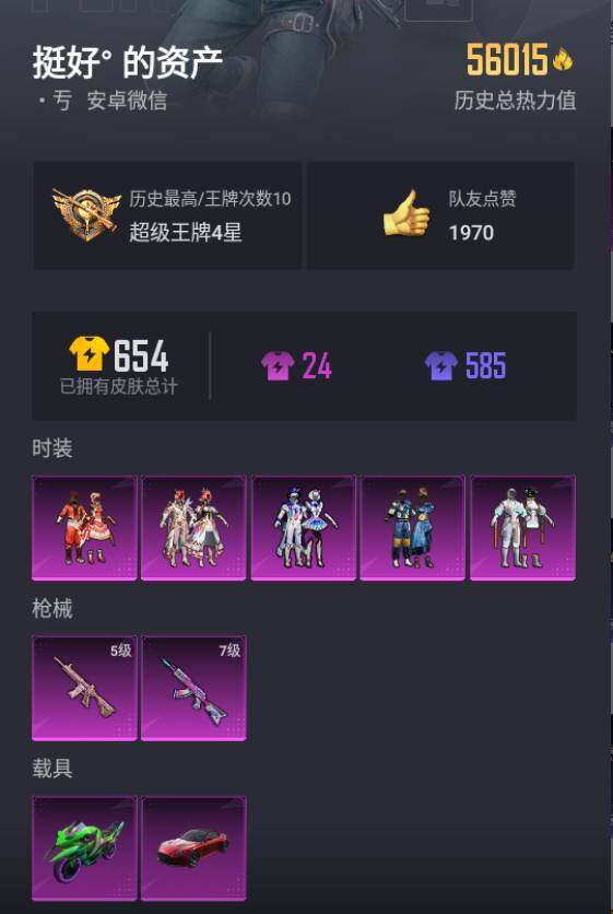[14820250]安卓【小号/10王牌印记/百万伏特背包/5粉装-2特效呛-2载具-4粉色飞行器】 微信56015热力值-10王牌印记-181套装-153呛皮 【热门品类】:套装-黄金大亨,套装-金羽特工,套装-浪客战士,套装-ss1特训,旭日初心兜帽大衣,套装-浪漫波比,套装-粉红小猪,小恶魔头饰,熔岩游骑兵面罩,熔岩游骑兵连帽夹克 【粉色载具】:阿斯顿马丁dbs(红),双人摩托-双刃魅影(绿) 【粉色套装】:粉装-智能音符,粉装-向日葵,粉装-心之恋语,粉装-星空之魅,粉装-锦绣火鲤 【粉色呛皮等级】:akm-炫紫旋律七级,m416-心之恋语五级 【粉色呛皮】:akm-炫紫旋律,m416-心之恋语 【粉色飞行器】:深海曼妙飞行器,伏魔团飞行器,心之恋语飞行翼,太空嘟嘟飞行器 【粉色降落伞】:深海曼妙降落伞,pel轰鸣竞梦者降落伞,神秘黑猫降落伞,古堡领主降落伞,繁花小夜曲降落伞,四圣焕新降落伞,马卡龙降落伞,潮汐统领降落伞,阿狸红降落伞,垂柳戏鸭降落伞,太空嘟嘟降落伞 【稀有呛皮】:akm-冰凉西瓜,akm-四圣焕新,akm-灼热熔岩,akm-生命誓言,akm-阿狸红,akm-霓虹街区,m16a4-夜灯,m16a4-机械英豪,m16a4-生命誓言,m16a4-红色方程式,m16a4-蓝色火焰,scar-l-浪客战士,scar-l-炫彩节奏,scar-l-玉兔迎春,scar-l-雷霆特警,scar-l-黄金龙骨,m416-仓鼠灰灰,m416-夜灯,m416-潮汐统领,m416-蓝色火焰,groza-生命誓言,groza-雷霆特警,groza-黑色刀锋,aug-凝视深渊,q-原初圣火,q-潮汐统领,q-神秘黑猫,q-诡娃娃,m762-牛气冲天,m762-生命誓言,m762-诡娃娃,m762-镭射皇者,mk47-百万伏特,mk47-粉色回忆,g36c-不夜海上花,g36c-金风玉露,uzi-众神之王,uzi-古堡领主,uzi-生命誓言,ump45-夜灯,ump45-天启纪元,ump45-快乐主宰,ump45-粉色回忆,ump45-蓝色火焰,ump45-诡娃娃,vect-生命誓言,vect-银河战甲,vect-魅夜紫皇,vect-黑色刀锋,汤姆逊-勇闯险境,汤姆逊-幻影战神,野牛-机械英豪,mp5k-众神之王,mp5k-甜蜜誓约,mp5k-繁