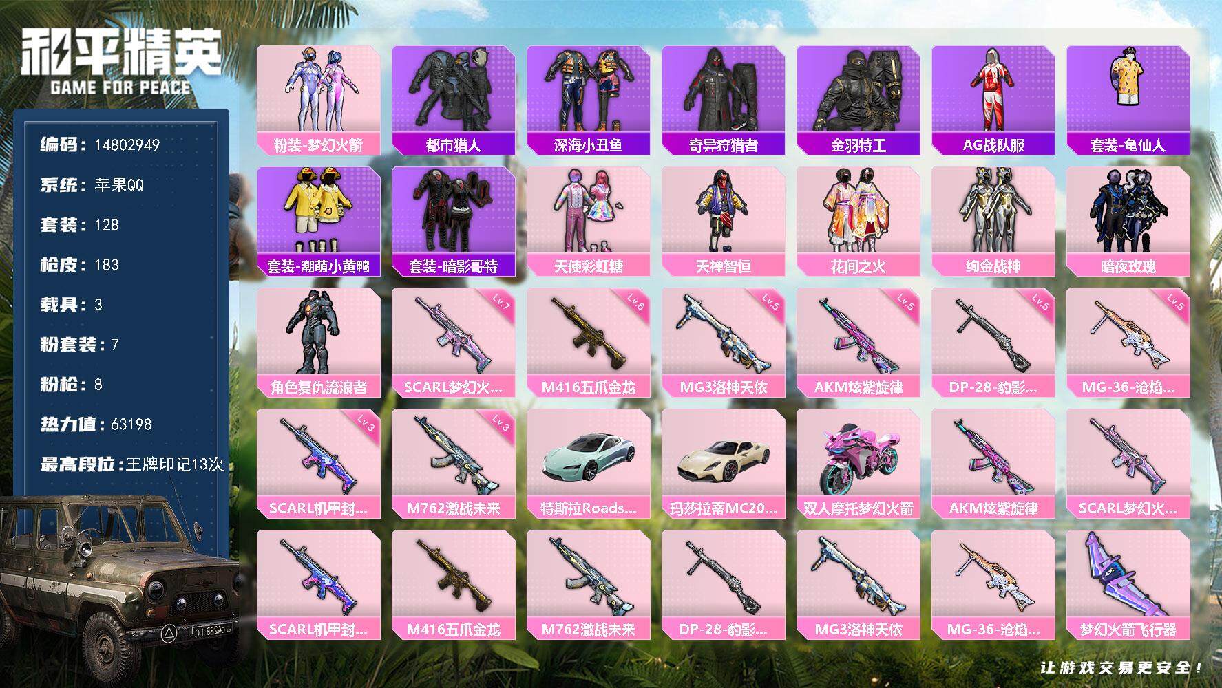 [14827103]" df443有二次苹果q-2稀有3载具7粉装8特效呛17热门128套装183呛皮 63198热力值 13印记 历史超级王牌11星 都市猎人 梦幻火箭 天使彩虹糖 scar-l-梦幻火箭 7级 暗影哥特 百万伏特背包 萌熊伴侣背包 【2稀有】 奇异狩猎者 都市猎人 【3载具】 玛莎拉蒂m白色 特斯拉r水滴蓝 双人摩托梦幻火箭 【7粉装】 梦幻火箭 天使彩虹糖 天禅智恒 花间之火 绚金战神 暗夜玫瑰 复仇流浪者 【8特效呛】 scar-l-梦幻火箭 7级 m416-五爪金龙 6级 akm-炫紫旋律 5级 mg-36-沧焰双生 5级 dp-28-豹影疾电 5级 m762-激战未来 3级 mg3-洛神天依 5级 scar-l-机甲封神 3级 【17热门】 龟仙人 雪山精英 潮萌小黄鸭 鹰眼刺客 深海小丑鱼 金羽特工 ag战队服 暗影哥特 团圆交子 瑞龙福将 狂沙舞者 漫步者 抹茶蜜豆 破蛋小黄鸡 akm-奇异狩猎者 m762-瑞龙福将 s686-奇异狩猎者 【2飞行器】 梦幻火箭飞行器 齐天大圣飞行器 【4头盔】 童趣迷兔头盔 梦幻火箭头盔 百万伏特头盔 花间之火头盔 【4背包】 梦幻火箭背包 百万伏特背包 萌熊伴侣背包 花间之火背包"