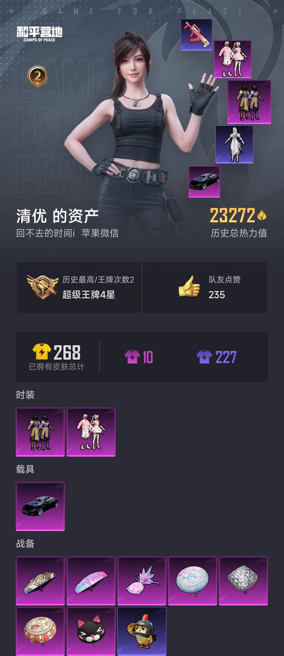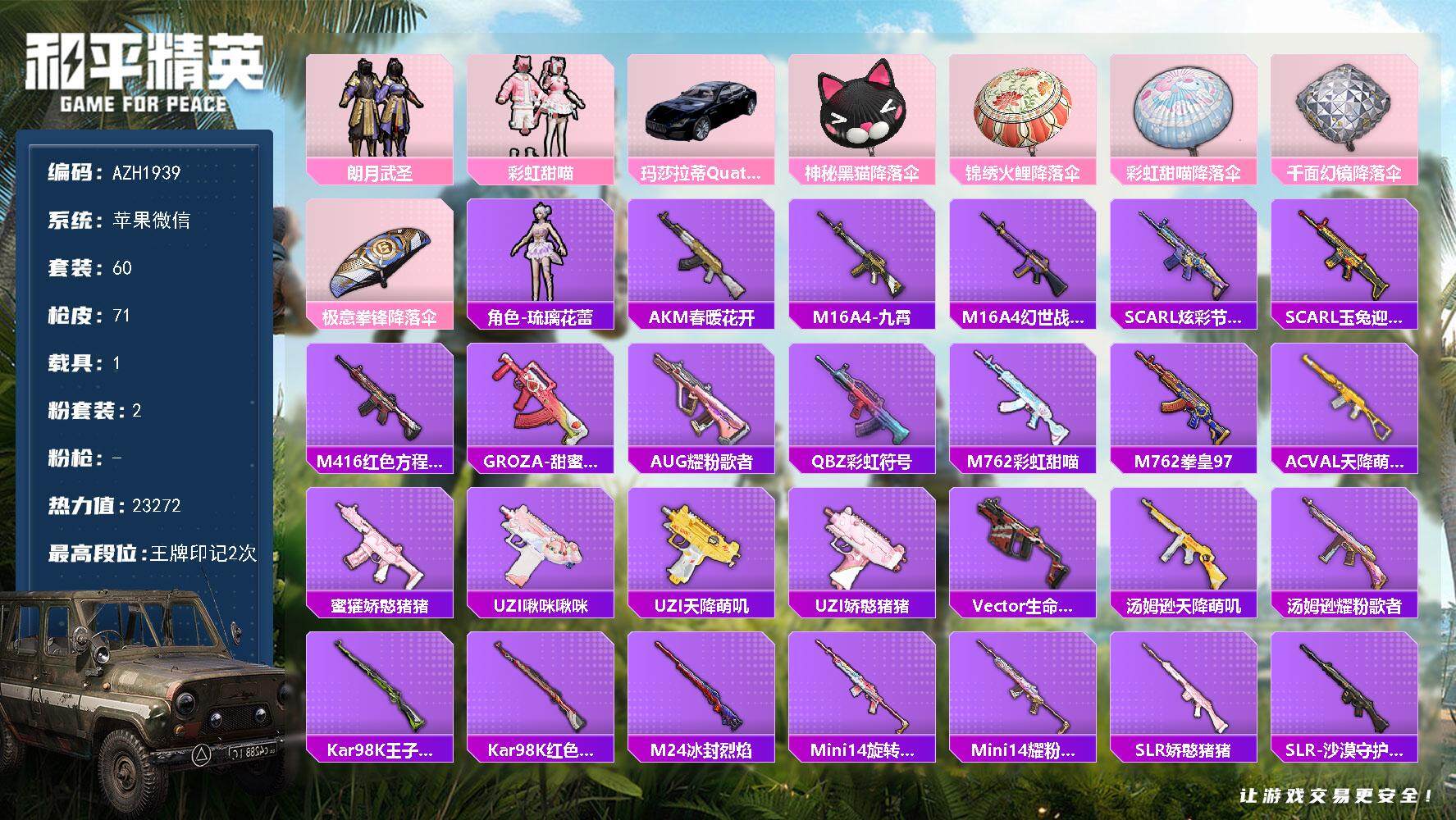 苹果 微信【彩虹甜喵 1载具玛莎拉蒂(夜幕蓝)】2粉装-0特效呛-1载具-1粉色飞行器-23272热力值-2王牌印记-60套装-71呛皮 【粉色套装】:粉装-朗月武圣,粉装-彩虹甜喵 【粉色载具】:玛莎拉蒂quattropte(夜幕蓝) 【粉色降落伞】:神秘黑猫降落伞,锦绣火鲤降落伞,彩虹甜喵降落伞,千面幻镜降落伞,极意拳锋降落伞 【稀有套装】:套装-雪国风尚,角色-琉璃花蕾 【稀有呛皮】