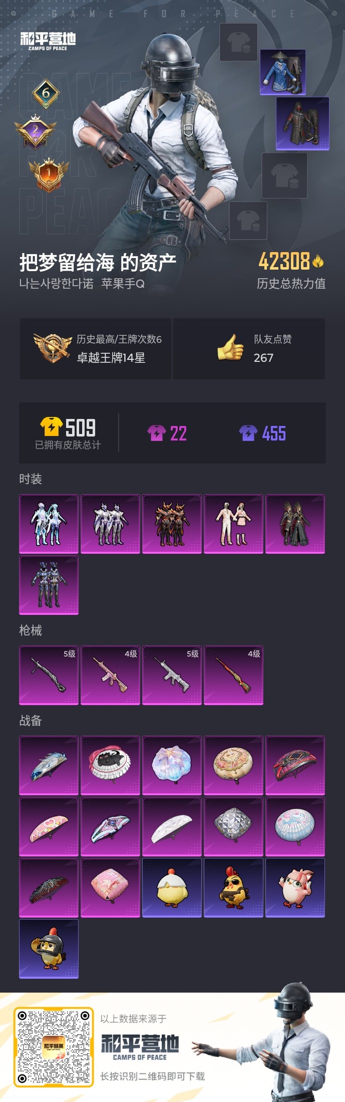 【和平精英】【txhp5102】6粉装,4特效呛,0载具,历史最高段位:卓越王牌14星 王牌印记6次 热力值:42308,105套装,150呛械,156装备,75战备;套装:套装-深渊皇后,套装-苍蓝魅影,套装-赤焰黑爵,套装-紫电风暴,套装-第五大道,套装-幻彩电音,套装-特训学院,套装-猎鹰,套装-红色运动,套装-黄色运动,套装-蓝色运动,套装-黑色伏地魔,套装-竞技名士,套装-湖蓝色名流,套装-猛禽,套装-野性山猫,套装-长空猛禽,套装-漫步者,套装-黎明保卫者,套装-海岛探路者,套装-旭日情侣,套装-浪漫天命,套装-缤纷假日,套装-春日漫步,套装-潮流先锋,套装-燃烧卡路里,套装-鹰眼刺客,套装-暗金炫舞,套装-怒火燎原,套装-魅力单车,套装-耀眼新星,套装-摩艾涂鸦,套装-幻世战舞者,套装-奇趣章鱼,套装-奇异狩猎者,套装-蓝调潮人,套装-缤纷果语,套装-海上生明月,套装-麻辣教官,套装-疯狂小兔子,套装-裁决冥王,套装-浴火魔神,套装-鹤鸣,套装-超能拳王,套装-探宝勇士,套装-牛气满满,套装-青春冒险家,套装-潮流游乐家,套装-萌趣颜团子,套装-特种颜团子,套装-牛气冲天,套装-耀粉歌者,套装-吉莉礼服,套装-快乐星愿,套装-星梦畅游,套装-ss15特训,套装-ss16特训,套装-福星高照,角色-军刀雅典娜,套装-ss20特训,套装-甜心亚梦,套装-虚音幻奏,套装-ss21特训,套装-萌趣咩咩,套装-娇憨猪猪,套装-暖心橘喵,套装-玉兔迎春,套装-ss22特训,套装-田园牧歌,套装-轻风白浪,套装-光之冒险,套装-ss23特训,套装-飞狐塔尔斯,套装-香榭午后,套装-神气柴柴,套装-懵萌河马,套装-妙红点点,套装-幻彩翩翩,套装-王牌教练,套装-柠萌假日,套装-ss24特训,套装-冥星暗影,套装-龟仙人,套装-涂山之恋,套装-ss25特训,套装-锦衣飞扬,套装-ss26特训,套装-云魄琉璃,角色-绛羽幽主,角色-瑰梦爱神,套装-ss33特训,套装-云朵鹅,套装-ss32特训,套装-彩虹兔,套装-顶瓜瓜,套装-雪绒豹,套装-大橘大利,套装-霓虹热舞,套装-元气之梦,套装-ss34特训,套装-擎苍青焰,套装-朱霞炽焰,套装-游乐,套装-凌霄紫焰,套装-薄荷星砂;呛皮:ac-val-甜心亚梦,ac-val-乌木金纹,ac-val-彩虹甜喵,ac-val-天降萌叽,aug-凝视深渊,aug-青春冒险家,aug-天降萌叽,aug-异域银装,aug-紫晶流影,5级scar-l-纯梦嫁纱,scar-l-生命誓言,scar-l-凝视深渊,scar-l-夜灯,scar-l-炫彩节奏,scar-l-彩虹符号,scar-l-玉兔迎春,akm-生命誓言,akm-破晓战魂,akm-涂鸦街区,akm-萌趣颜团子,akm-虎虎生威,akm-环太平洋,akm-胡桃卫兵,akm-绿洲时空,groza-影袭,groza-彩虹符号,groza-田园牧歌,groza-懵萌河马,m16a4-凝视深渊,m16a4-甜心亚梦,m16a4-幻世战舞者,famas-乌木金纹,蜜獾-娇憨猪猪,蜜獾-天降萌叽,蜜獾-乌木金纹,g36c-暗夜玫瑰,g36c-炙焰牛王,g36c-懵萌河马,g36c-乌木金纹,mk47-青春冒险家,mk47-乌木金纹,mk47-妙红点点,mk47-炫光之旅,q-彩虹符号,4级m416-心之恋语,m416-梨园星光,m416-糯团青竹,m762-天降萌叽,m762-云朵鹅,arx-凌霄紫焰,m200-雪梅暗香,m200-仲夏莫吉托,kar98k-红色方程式,kar98k-王子的夏天,kar98k-梦幻火箭,kar98k-乌木金纹,svd-云朵鹅,莫辛纳甘-乌木金纹,莫辛纳甘-懵萌河马,awm-垂柳戏鸭,4级m24-翩跹演武,amr-妙红点点,amr-鸡智如我,amr-乌木金纹,mk14-乌木金纹,mk14-薄荷星砂,sks-迅猛狂鲨,sks-炫彩节奏,slr-娇憨猪猪,slr-彩虹符号,mini14-耀粉歌者,mini14-鸡智如我,vss-星之彼岸,vss-田园牧歌,qbu-青春冒险家,m417-玩趣呆呆,汤姆逊-耀粉歌者,js9-凌霄紫焰,vect-生命誓言,vect-夜灯,vect-彩虹符号,vect-田园牧歌,野牛-王牌四分卫,野牛-青春冒险家,ump45-夜灯,ump45-蓝色火焰,ump45-涂山之恋,ump45-海盐豹豹,ump45-绿洲时空,uzi-生命誓言,uzi-娇憨猪猪,uzi-天降萌叽,uzi-啾咪啾咪,aks-74u-鸡智如我,aks-74u-乌木金纹,s12k-破晓战魂,s12k-夜灯,s12k-娇憨猪猪,s12k-垂柳戏鸭,s12k-幻世战舞者,s12k-音爆索尼克,s12k-霓彩脉冲,spas-12-田园牧歌,spas-12-云朵鹅,s686-红色方程式,s686-彩虹符号,s686-白勺歌姬,dbs-甜心亚梦,dbs-第五大道,dbs-幻彩电音,s1897-炫彩节奏,s1897-乌木金纹,mg3-幻世战舞者,mg3-乌木金纹,mg3-青空秋雨,mg3-妙红点点,mg3-惊鸿侠骨,mg3-霓彩脉冲,m249-破晓战魂,m249-星之彼岸,m249-冷魅冰骑,m249-糯团青竹,m249-妙红点点,5级dp-28-豹影疾电,dp-28-彩虹符号,dp-28-齐天大圣,dp-28-甜心亚梦,pkm-懵萌河马,mg-36-凌霄紫焰,p92-凌霄紫焰,沙墨之鹦-云朵鹅,平底锅-青春冒险家,平底锅-甜心亚梦,平底锅-娇憨猪猪,平底锅-田园牧歌,平底锅-光之冒险,平底锅-妙红点点,平底锅-懵萌河马,平底锅-惊鸿侠骨,平底锅-空岛之星,平底锅-属我最6,平底锅-宁雨蝶,平底锅-凌霄紫焰,撬棍-环太平洋,撬棍-幻世战舞者,大砍刀-云朵鹅,破片手留单-萌趣颜团子,破片手留单-海盐豹豹,十子怒-异域银装,盐雾蛋-冰氧夏日;降落伞:粉色滑翔尾迹,红色滑翔尾迹,光之冒险尾迹,异域银装飞行器,破刃行动尾迹; 详情看图6王牌印记 4.2w热力值 6粉 4特 第五 奇异 心之恋语 纯梦嫁纱