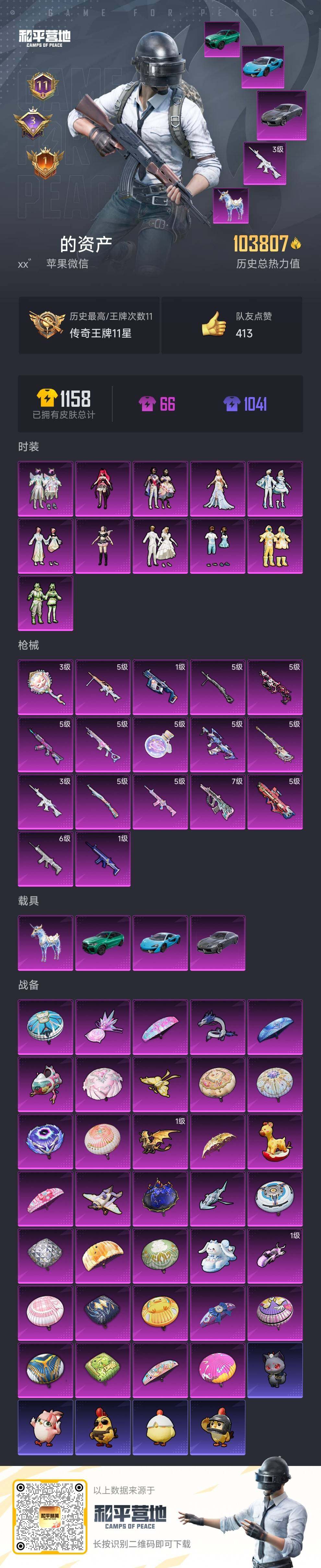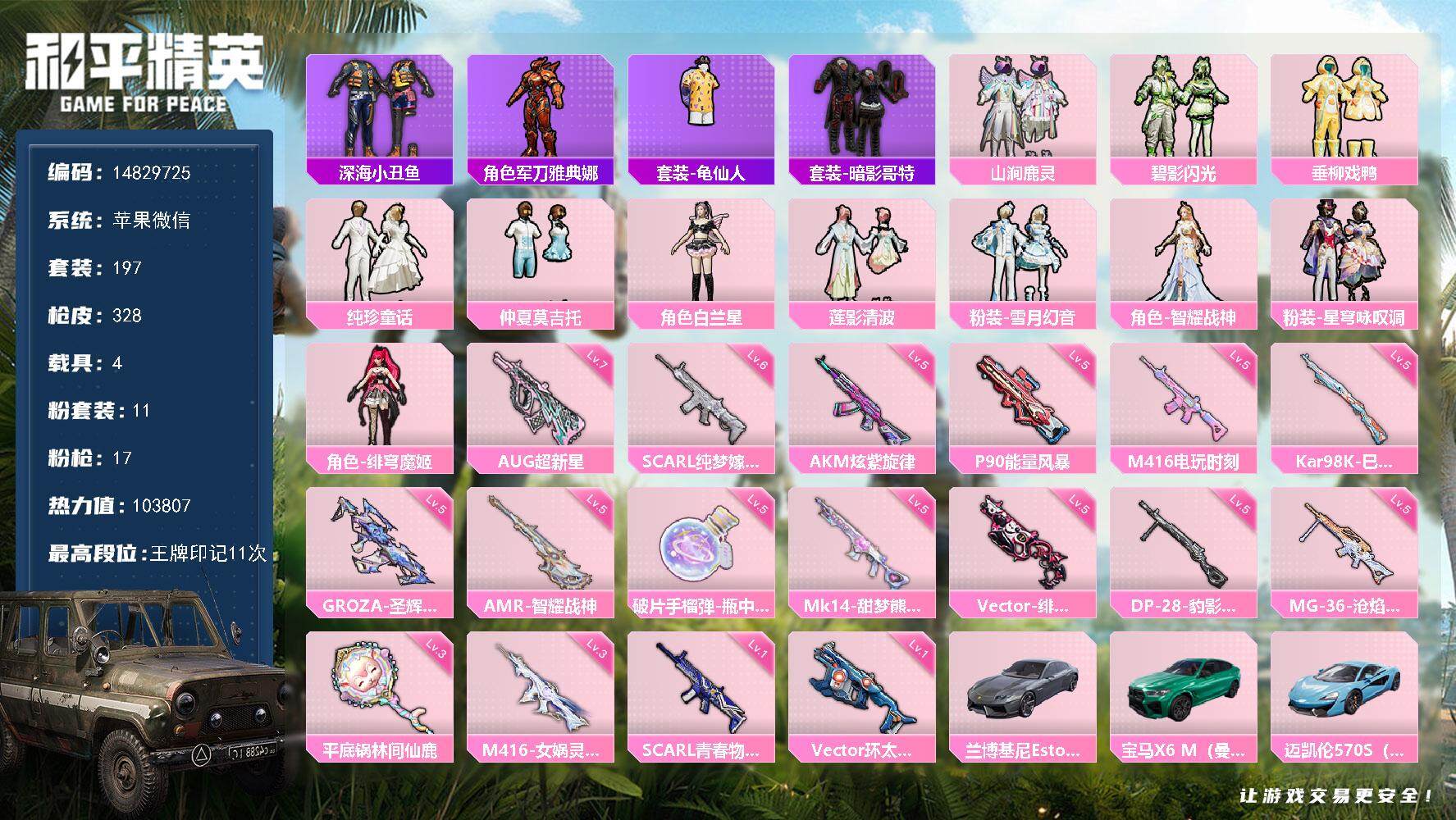 [14834509]das7783 可二次 苹果v-1稀有4载具11粉装17特效呛14热门197套装328呛皮 103807热力值 11印记 历史传奇王牌11星 m416-女娲灵识 3级 aug-超新星 7级 鹰眼刺客 暗影哥特 【1稀有】 awm-黄金龙骨 【4载具】 迈凯伦570s天际蓝 宝马x6m曼岛绿 兰博轿车灰色 星梦玉骢 【11粉装】 绯穹魔姬 白兰星 雪月幻音 星穹咏叹调 智耀战神 垂柳戏鸭 莲影清波 仲夏莫吉托 纯珍童话 山涧鹿灵 碧影闪光 【17特效呛】 scar-l-纯梦嫁纱 6级 m416-电玩时刻 5级 m416-女娲灵识 3级 akm-炫紫旋律 5级 kar98k-巳巳如意 5级 vect-绯穹魔姬 5级 mg-36-沧焰双生 5级 dp-28-豹影疾电 5级 p90-能量风暴 5级 aug-超新星 7级 mk14-甜梦熊击 5级 amr-智耀战神 5级 groza-圣辉之星 5级 平底锅-林间仙鹿 3级 vect-环太平洋 1级 scar-l-青春物语 1级 破片手留单-瓶中星球 5级 【14热门】 龟仙人 鹰眼刺客 深海小丑鱼 jteam战队服 暗影哥特 团圆交子 瑞龙福将 狂沙舞者 漫步者 军刀雅典娜 英勇保护者 m762-瑞龙福将 m24-奇异狩猎者 汤姆逊-林间仙鹿 【2飞行器】 萌物绒绒飞行器 庄周梦蝶飞行器 【3头盔】 梦幻火箭头盔 深海小丑鱼头盔 金羽特工头盔 【2背包】 梦幻火箭背包 深海小丑鱼背包