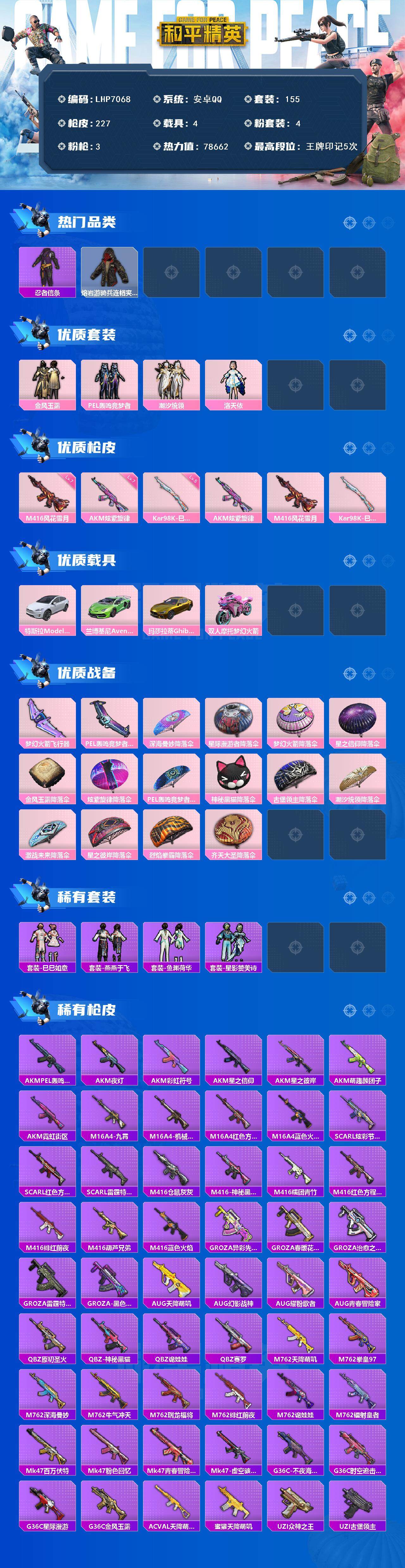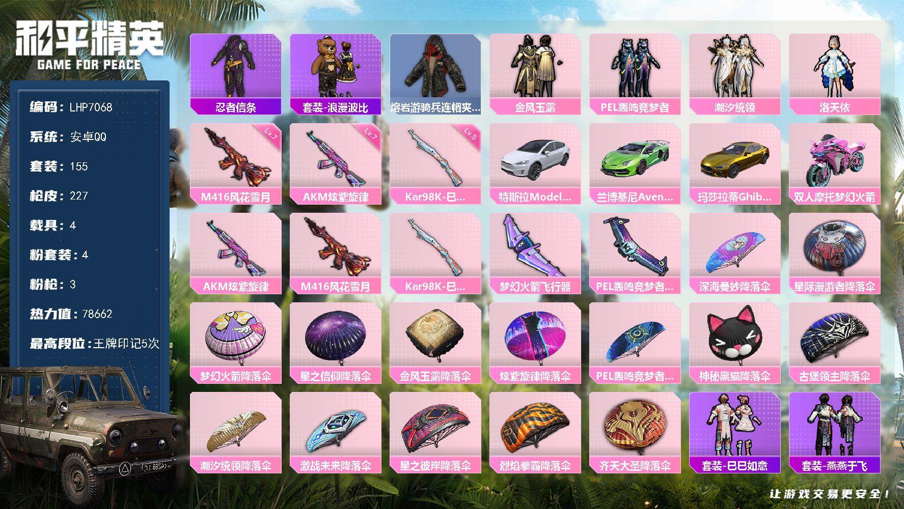 【店主推荐捡漏号!可直接换绑】素材身法号安卓 手q-4粉装-3特效呛-4载具-2粉色飞行器-78662热力值-5王牌印记-155套装-227呛皮 【热门品类】:套装-忍者信条,套装-浪漫波比,熔岩游骑兵连帽夹克 【粉色套装】:粉装-金风玉露,粉装-pel轰鸣竞梦者,粉装-潮汐统领,角色-洛天依 【粉色呛皮等级】:akm-炫紫旋律七级,m416-风花雪月七级,kar98k-巳巳如意五级 【粉色载具】:特斯拉model x(珍珠白),兰博基尼aventad svj(翡翠绿),玛莎拉蒂ghibli(金),双人摩托-梦幻火箭 【粉色呛皮】:akm-炫紫旋律,m416-风花雪月,kar98k-巳巳如意 【粉色飞行器】:梦幻火箭飞行器,pel轰鸣竞梦者飞行器 【粉色降落伞】:深海曼妙降落伞,星际漫游者降落伞,梦幻火箭降落伞,星之信仰降落伞,金风玉露降落伞,炫紫旋律降落伞,pel轰鸣竞梦者降落伞,神秘黑猫降落伞,古堡领主降落伞,潮汐统领降落伞,激战未来降落伞,星之彼岸降落伞,烈焰拳霸降落伞,齐天大圣降落伞 【稀有套装】:套装-巳巳如意,套装-燕燕于飞,套装-鱼渊荷华,套装-星影赞美诗 【稀有呛皮】:akm-pel轰鸣竞梦者,akm-夜灯,akm-彩虹符号,akm-星之信仰,akm-星之彼岸,akm-萌趣颜团子,akm-霓虹街区,m16a4-九霄,m16a4-机械英豪,m16a4-红色方程式,m16a4-蓝色火焰,scar-l-炫彩节奏,scar-l-红色方程式,scar-l-雷霆特警,m416-仓鼠灰灰,m416-神秘黑猫,m416-糯团青竹,m416-红色方程式,m416-绯红前夜,m416-葫芦兄弟,m416-蓝色火焰,groza-异彩先驱,groza-春暖花开,groza-治愈之星,groza-雷霆特警,groza-黑色刀锋,aug-天降萌叽,aug-幻影战神,aug-耀粉歌者,aug-青春冒险家,q-原初圣火,q-神秘黑猫,q-诡娃娃,q-赛罗,m762-天降萌叽,m762-拳皇97,m762-深海曼妙,m762-牛气冲天,m762-瑞龙福将,m762-绯红前夜,m762-诡娃娃,m762-镭射皇者,mk47-百万伏特,mk47-粉色回忆,mk47-青春冒险家,mk47-虚空骇客,g36c-不夜海上花,g36c-时空追击者,g36c-星际漫游,g36c-金风玉露,ac-val-天降萌叽,蜜獾-天降萌叽,uzi-众神之王,uzi-古堡领主,uzi-啾咪啾咪,uzi-天降萌叽,uzi-幻影战神,uzi-炫彩节奏,uzi-烈焰拳霸,uzi-红色方程式,uzi-金玉无双,uzi-金风玉露,uzi-魔法学院,ump45-时空追击者,ump45-蓝色火焰,ump45-金玉无双,vect-pel轰鸣竞梦者,vect-彩虹符号,vect-治愈之星,vect-黑色刀锋,vect-龙虾霸霸,汤姆逊-勇闯险境,汤姆逊-幻影战神,汤姆逊-异彩先驱,汤姆逊-炫彩节奏,汤姆逊-银刃赛罗,野牛-夜灯,野牛-机械英豪,野牛-青春冒险家,mp5k-众神之王,mp5k-异彩先驱,mp5k-繁花小夜曲,mp5k-蓝莓炮弹,p90-巳巳如意,kar98k-勇闯险境,kar98k-古堡领主,kar98k-彩虹符号,kar98k-梦幻火箭,kar98k-深海曼妙,kar98k-红色方程式,kar98k-蓝莓炮弹,m24-治愈之星,m24-炫彩节奏,m24-众神之王,m24-冰封烈焰,awm-不夜海上花,sks-勇闯险境,sks-夜灯,sks-天之羽翼,sks-时空追击者,sks-炫彩节奏,vss-华贵君王,vss-彩虹符号,vss-镭射皇者,vss-雷霆特警,vss-黑色刀锋,vss-虚空骇客,mini14-原初圣火,mini14-异彩先驱,mini14-梦幻火箭,mini14-炫彩节奏,mini14-金鼠迎春,mini14-马卡龙,mk14-治愈之星,win94-机械英豪,win94-瑞龙福将,slr-众神之王,slr-四圣焕新,qbu-不夜海上花,qbu-青春冒险家,m417-幻影飞狐,s686-不夜海上花,s686-冰封烈焰,s686-彩虹符号,s686-深海曼妙,s686-红色方程式,s686-巳巳如意,s1897-勇闯险境,s1897-天启纪元,s1897-星之信仰,s1897-潮汐统领,s1897-镭射皇者,s12k-玩趣呆呆,s12k-瑞龙福将,s12k-龙虾霸霸,s12k-pel轰鸣竞梦者,s12k-机械英豪,dbs-时空追击者,dbs-月下星之子,m249-古堡领主,m249-拳皇97,m249-星之彼岸,m249-镭射皇者,dp-28-原初圣火,dp-28-彩虹符号,dp-28-彩虹独角兽,mg3-幻世战舞者,mg3-瑞龙福将,p92-拳皇97,p92-雷霆特警,p1911-冰封烈焰,p18c-原初圣火,p18c-百万伏特 【其他套装】:套装-ss2特训,套装-ss3特训,套装-ss5特训,套装-ss6特训,套装-ss7特训,套装-ss8特训,套装-ss9特训,套装-ss10特训,套装-ss11特训,套装-ss12特训,套装-ss13特训,套装-ss14特训,套装-ss15特训,套装-ss16特训,套装-ss17特训,套装-ss18特训,套装-ss19特训,套装-ss20特训,套装-ss21特训,套装-ss22特训,套装-ss23特训,套装-ss26特训,套装-丛林猎人,套装-人鱼之吻,套装-传奇侦探,套装-冰川格斗者,套装-北国孤狼,套装-千禧之恋,套装-半糖蓝莓,套装-夏日音浪,套装-奇迹天团,套装-怒火燎原,套装-拳皇97草薙京,套装-摇滚狂鲨,套装-旭日情侣,套装-时尚圣诞,套装-星光纪元,套装-柠萌假日,套装-格斗专家,套装-海上生明月,套装-潮流炫酷,套装-灰色格斗者,套装-炽焰拳师,套装-牛气冲天,套装-牛气满满,套装-特战装甲,套装-特种空勤,套装-特种颜团子,套装-王牌教练,套装-甜蜜告白,套装-甜蜜熊情侣,套装-疯狂小兔子,套装-神秘领域,套装-福星高照,套装-空投萌叽,套装-竞技勇士朋克,套装-竞技名士,套装-耀粉歌者,套装-萌趣颜团子,套装-萌黄之夏,套装-跃动心情,套装-长空猛禽,套装-霓虹街区,套装-青涩时光,套装-顽皮玉兔,套装-飞行日记,套装-鹤鸣,套装-刚毅裁决者,套装-贵族骑装,套装-战地菁英,套装-街舞达人,套装-幻影公爵,套装-和平特警,套装-夜莺强袭者,套装-风暴特警,套装-冰川特警,套装-雷霆特警,套装-冷血极客,套装-梦魇先生,套装-坚韧舞者,套装-黑夜传说,套装-凛冬战士,套装-雪山精英,套装-雪山征服者,套装-冰原使者,套装-浪漫波比,套装-圣诞大吉,套装-蔷薇魔法师,套装-核芯基因,套装-精神漫游,套装-黑色刀锋,套装-银河圣歌,套装-闪耀星光,套装-迷域探索者,套装-深蓝冒险家,套装-云丝凤蟒,套装-新侠客行,套装-清香五月粽,套装-软嫩糖
