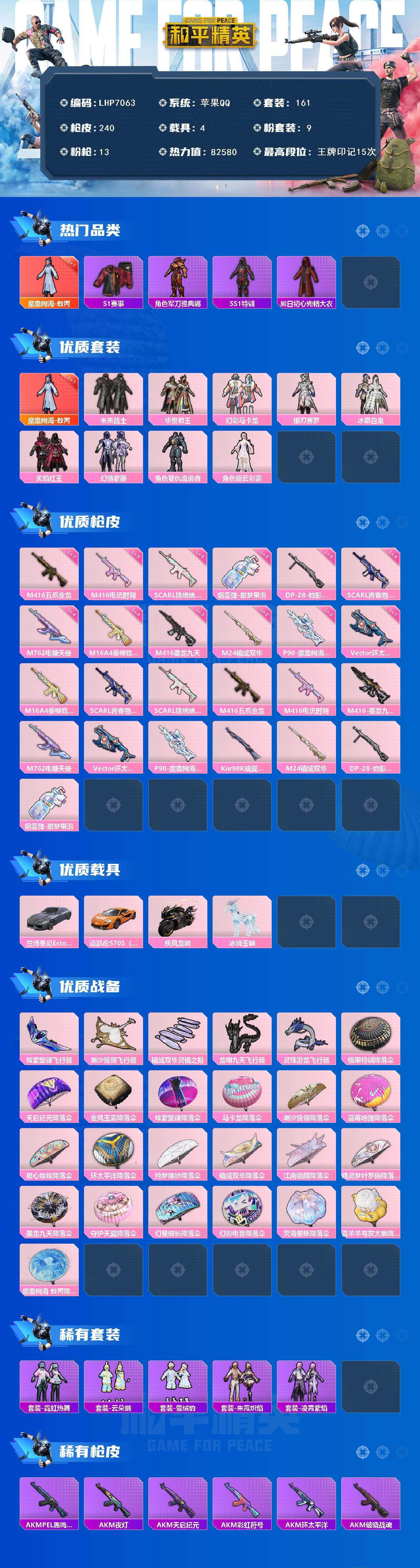 【店主推荐捡漏号!可直接换绑】苹果 手q-1神装-9粉装-13特效呛-4载具-6粉色飞行器-82580热力值-15王牌印记-161套装-240呛皮【红色神装等级】:魔童闹海-敖丙一级【红色角色神装】:魔童闹海-敖丙【热门品类】:套装-s1赛事,角色-军刀雅典娜,套装-ss1特训,旭日初心兜帽大衣,套装-龟仙人,套装-粉红小猪,角色-mark.06【粉色套装】:粉装-未来战士,粉装-华贵君王,粉装-幻彩马卡龙,粉装-银刃赛罗,粉装-冰霜白皇,粉装-炙焰红王,粉装-幻情紫藤,角色-复仇流浪者,角色-烟云彩露【粉色呛皮等级】:m16a4-垂柳戏鸭四级,scar-l-青春物语四级,scar-l-锦绣绵绵五级,m416-五爪金龙七级,m416-电玩时刻五级,m416-墨龙九天三级,m762-电糖天使四级,vect-环太平洋一级,p90-魔童闹海 敖丙二级,m24-镜域双华二级,dp-28-豹影疾电五级,盐雾蛋-甜梦果泡五级【粉色载具】:兰博基尼estoque(银翼灰),迈凯伦570s(旭日黄),疾风龙骑,冰绡玉鳞【粉色呛皮】:m16a4-垂柳戏鸭,scar-l-青春物语,scar-l-锦绣绵绵,m416-五爪金龙,m416-电玩时刻,m416-墨龙九天,m762-电糖天使,vect-环太平洋,p90-魔童闹海 敖丙,kar98k-暗翼战神,m24-镜域双华,dp-28-豹影疾电,盐雾蛋-甜梦果泡【粉色飞行器】:炫紫旋律飞行器,潮汐统领飞行器,镜域双华-灵镜之阶,龙翔九天飞行器,灵珠游龙飞行器