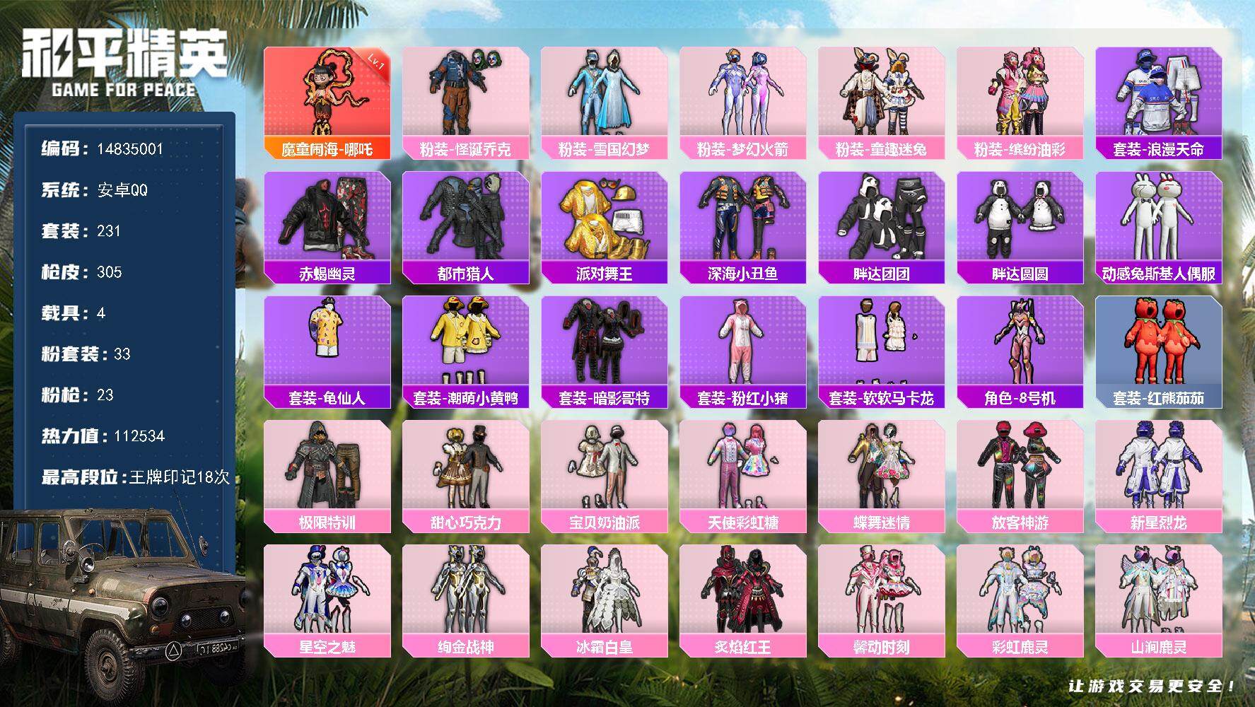 [14837228]" dfx58可二次安卓q-1红装6稀有5载具33粉装23特效呛28热门231套装305呛皮 112534热力值 18印记 历史超级王牌21星 魔童闹海-哪吒 1级 都市猎人 赤蝎幽灵派对舞王(金靴子) 保时捷panamera星辰紫 虚妄之影炫耀紫 星梦玉骢 踏焰逐风摩托车 僚机-冰龙团团 梦幻火箭 宝贝奶油派 天使彩虹糖 甜心巧克力 怪诞乔克 缤纷油彩 scar-l-魔童闹海哪吒 3级 kar98k-圣域龙灵 3级 ump45-玉魂晶魄 9级 破片手留单-粉粉猫爪 7级 暗影哥特 梦幻火箭背包 萌熊伴侣背包 【1红装】 魔童闹海-哪吒 1级 【6稀有】 赤蝎幽灵 akm-缤纷海域 都市猎人 浪漫天命 派对舞王 派对舞王(金靴子) 【5载具】 保时捷panamera星辰紫 虚妄之影炫耀紫 星梦玉骢 踏焰逐风摩托车 僚机-冰龙团团 【33粉装】 梦幻火箭 蝶舞迷情 雪国幻梦 宝贝奶油派 天使彩虹糖 甜心巧克力 千金淑猫 星穹咏叹调 怪诞乔克 小可学妹 垂柳戏鸭 幻彩电音 缤纷油彩 放客神游 仲夏莫吉托 极限特训 第五大道 新星烈龙 星空之魅 甜蜜草莓 暗夜鎏金 绚金战神 童趣迷兔 冰霜白皇 炙焰红王 暖熊萌萌 霁雪冰心 甜梦小狐 馨动时刻 冰川红玫 山涧鹿灵 彩虹鹿灵 黄伞悠悠 【23特效呛】 m416-五爪金龙 1级 scar-l-魔童闹海哪吒 3级 m416-电玩时刻 5级 akm-炫紫旋律 5级 aks-74u-星穹咏叹调 5级 kar98k-圣域龙灵 3级 kar98k-巳巳如意 5级 m762-电糖天使 4级 mg-36-沧焰双生 5级 dp-28-千金淑猫 4级 dp-28-豹影疾电 5级 aug-暖羊咩咩 5级 amr-鸢尾晶梦 4级 scar-l-童趣迷兔 4级 m416-暖熊萌萌 6级 m417-第五大道 4级 ump45-玉魂晶魄 9级 vect-灵感创作师 6级 groza-旋转彩虹 4级 p90-甜蜜草莓 4级 平底锅-林间仙鹿 3级 平底锅-仲夏莫吉托 1级 破片手留单-粉粉猫爪 7级 【28热门】 8号机 龟仙人 红熊茄茄 东方飞龙 动感兔斯基 潮萌小黄鸭 软软马卡龙 晶辉守