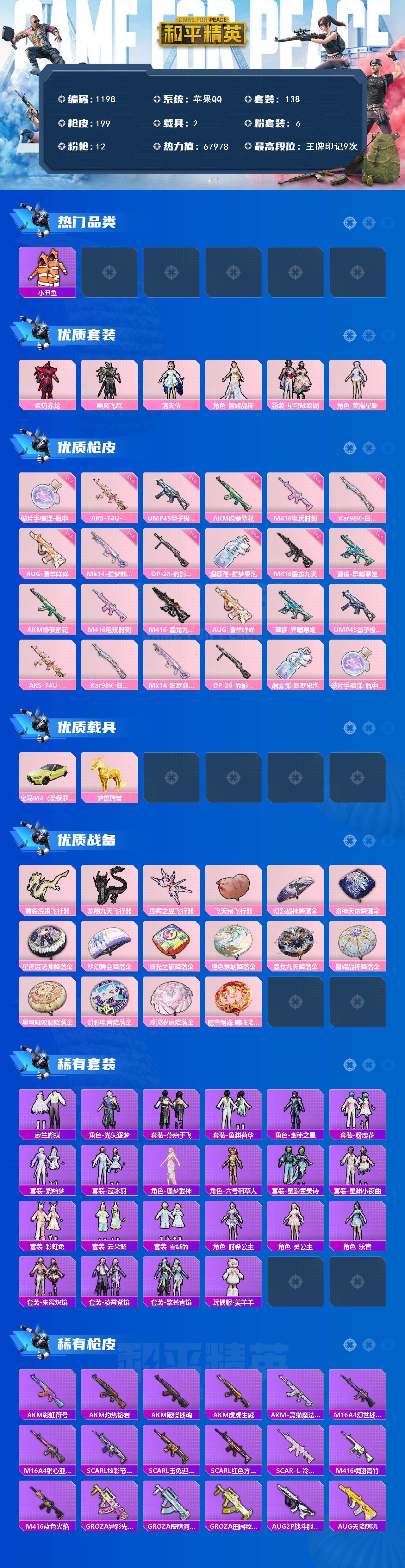 2载具-138套装-199呛皮-wj【身法小号,螳螂,六号稻草人,秒换绑】苹果 手q-6粉装-12特效呛-2载具-5粉色飞行器-67978热力值-9王牌印记-138套装-199呛皮 【热门品类】:套装-小丑鱼,套装-龟仙人,套装-粉红小猪,角色-mark.06,角色-六号稻草人 【粉色套装】:粉装-炙焰赤龙,粉装-飓风飞鹰,角色-洛天依,角色-智耀战神,粉装-星穹咏叹调,角色-荧海星豚 【粉色呛皮等级】:akm-绿萝繁花五