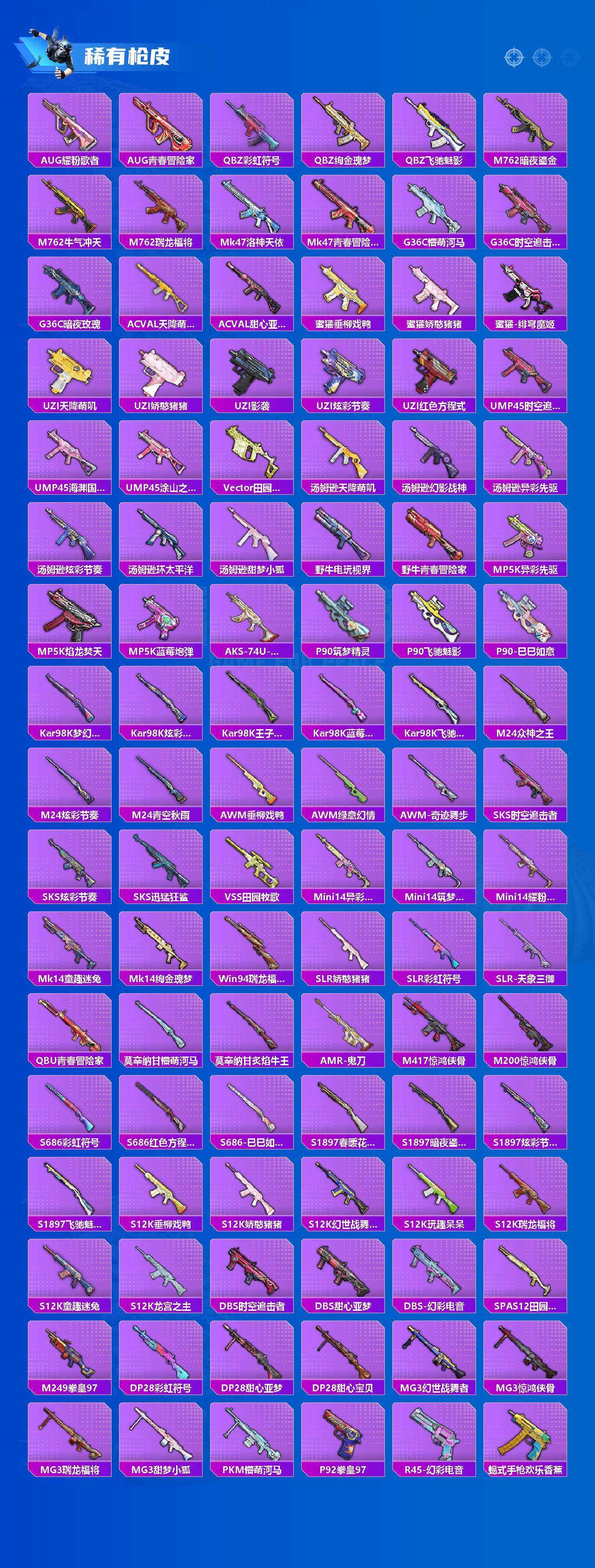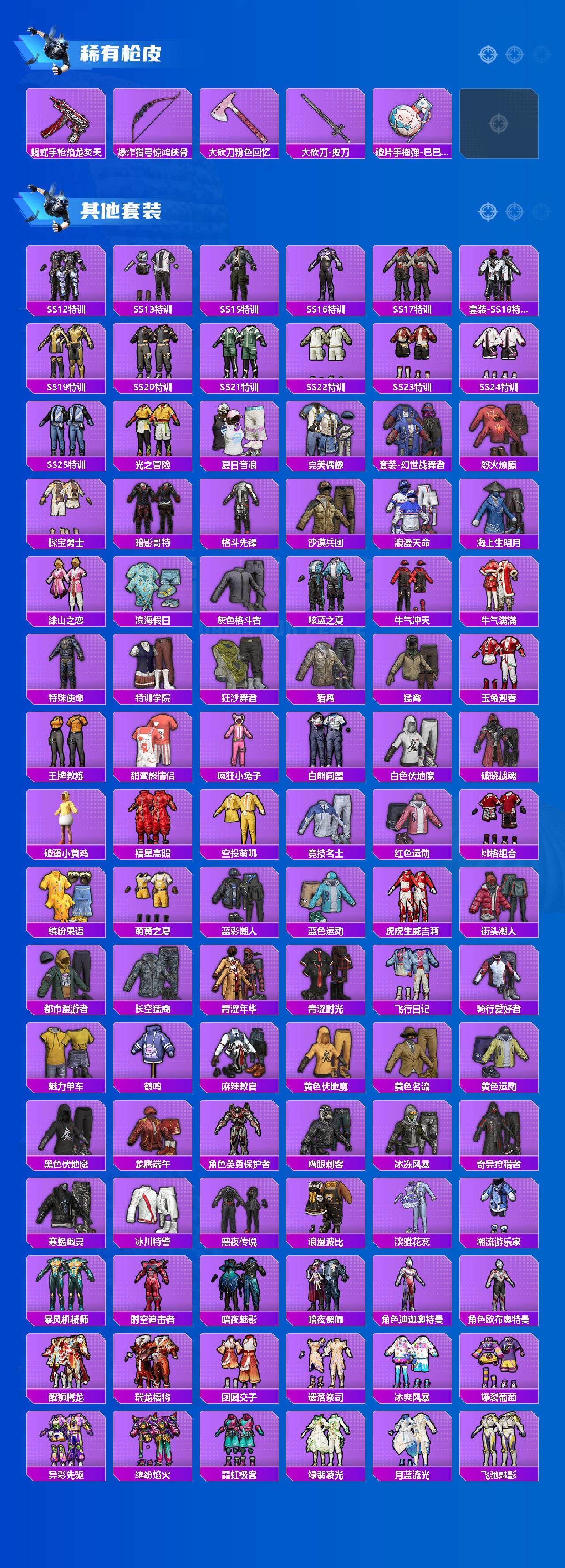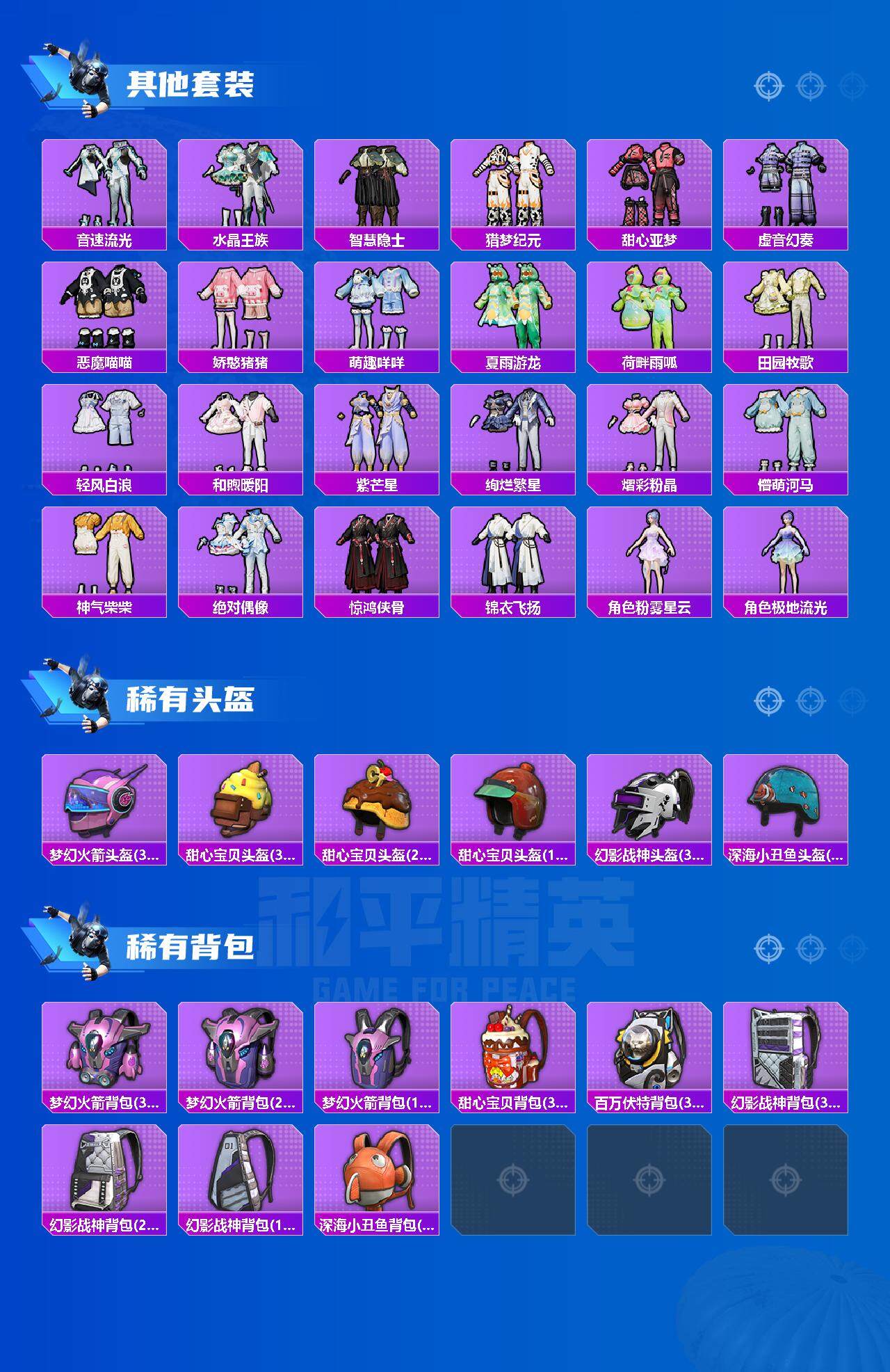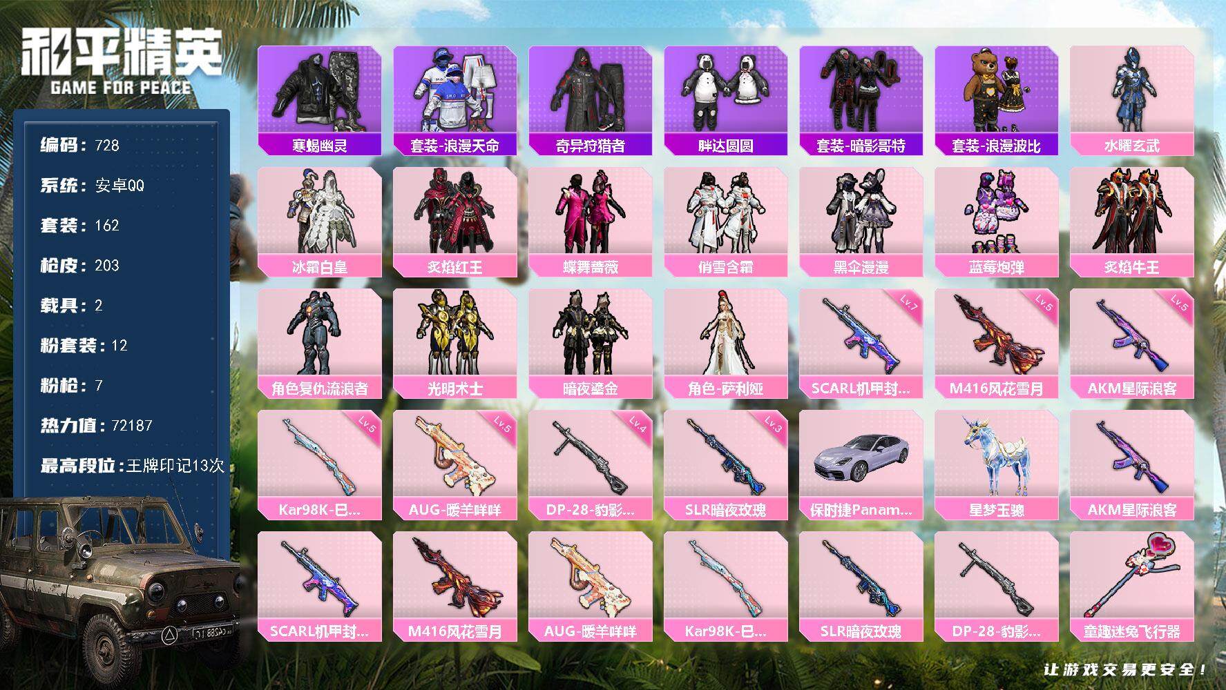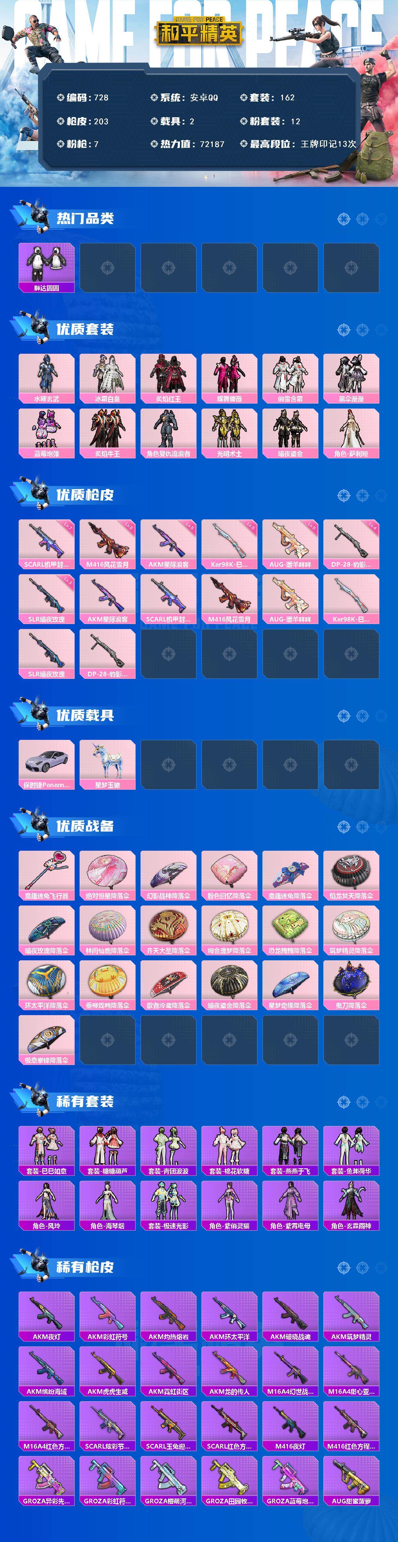 [14840334]安卓 手q-12粉装-7特效呛-2载具-2粉色飞行器-72187热力值-13王牌印记-162套装-203呛皮 【热门品类】:套装-寒蝎幽灵,套装-浪漫天命,套装-奇异狩猎者,套装-胖达圆圆,套装-暗影哥特,套装-浪漫波比 【粉色套装】:粉装-水曜玄武,粉装-冰霜白皇,粉装-炙焰红王,粉装-蝶舞蔷薇,粉装-俏雪含霜,粉装-黑伞漫漫,粉装-蓝莓炮弹,粉装-炙焰牛王,角色-复仇流浪者,粉装-光明术士,粉装-暗夜鎏金,角色-萨利娅 【粉色呛皮等级】:akm-星际浪客五级,scar-l-机甲封神七级,m416-风花雪月五级,aug-暖羊咩咩五级,kar98k-巳巳如意五级,slr-暗夜玫瑰三级,dp-28-豹影疾电四级 【粉色载具】:保时捷panamera(星辰紫),星梦玉骢 【粉色呛皮】:akm-星际浪客,scar-l-机甲封神,m416-风花雪月,aug-暖羊咩咩,kar98k-巳巳如意,slr-暗夜玫瑰,dp-28-豹影疾电 【粉色飞行器】:童趣迷兔飞行器 【粉色降落伞】:绝对恒星降落伞,幻影战神降落伞,粉色回忆降落伞,童趣迷兔降落伞,焰龙焚天降落伞,暗夜玫瑰降落伞,林间仙鹿降落伞,齐天大圣降落伞,绚金瑰梦降落伞,恐龙拽拽降落伞,筑梦精灵降落伞,环太平洋降落伞,垂柳戏鸭降落伞,歌者泠鸢降落伞,暗夜鎏金降落伞,星梦奇缘降落伞,鬼刀降落伞,极意拳锋降落伞 【稀有套装】:套装-巳巳如意,套装-雪国风尚,套装-糖糖葫芦,套装-青团波波,套装-棉花软糖,套装-燕燕于飞,套装-鱼渊荷华,角色-风玲,角色-海琴烟,套装-极速光影,角色-紫俏灵猫,角色-紫霄电母,角色-玄霖雨神,套装-炫彩糖果 【稀有呛皮】:aug-冰晶雪宝,akm-夜灯,akm-彩虹符号,akm-灼热熔岩,akm-环太平洋,akm-破晓战魂,akm-筑梦精灵,akm-缤纷海域,akm-虎虎生威,akm-霓虹街区,akm-龙的传人,m16a4-幻世战舞者,m16a4-甜心亚梦,m16a4-红色方程式,scar-l-炫彩节奏,scar-l-玉兔迎春,scar-l-红色方程式,m416-夜灯,m416-红色方程式,groza-异彩先驱,groza-彩虹符号,groza-懵萌河马,groza-田园牧歌,groza-蓝莓炮弹,aug-甜蜜菠萝,aug-耀粉歌者,aug-青春冒险家,q-彩虹符号