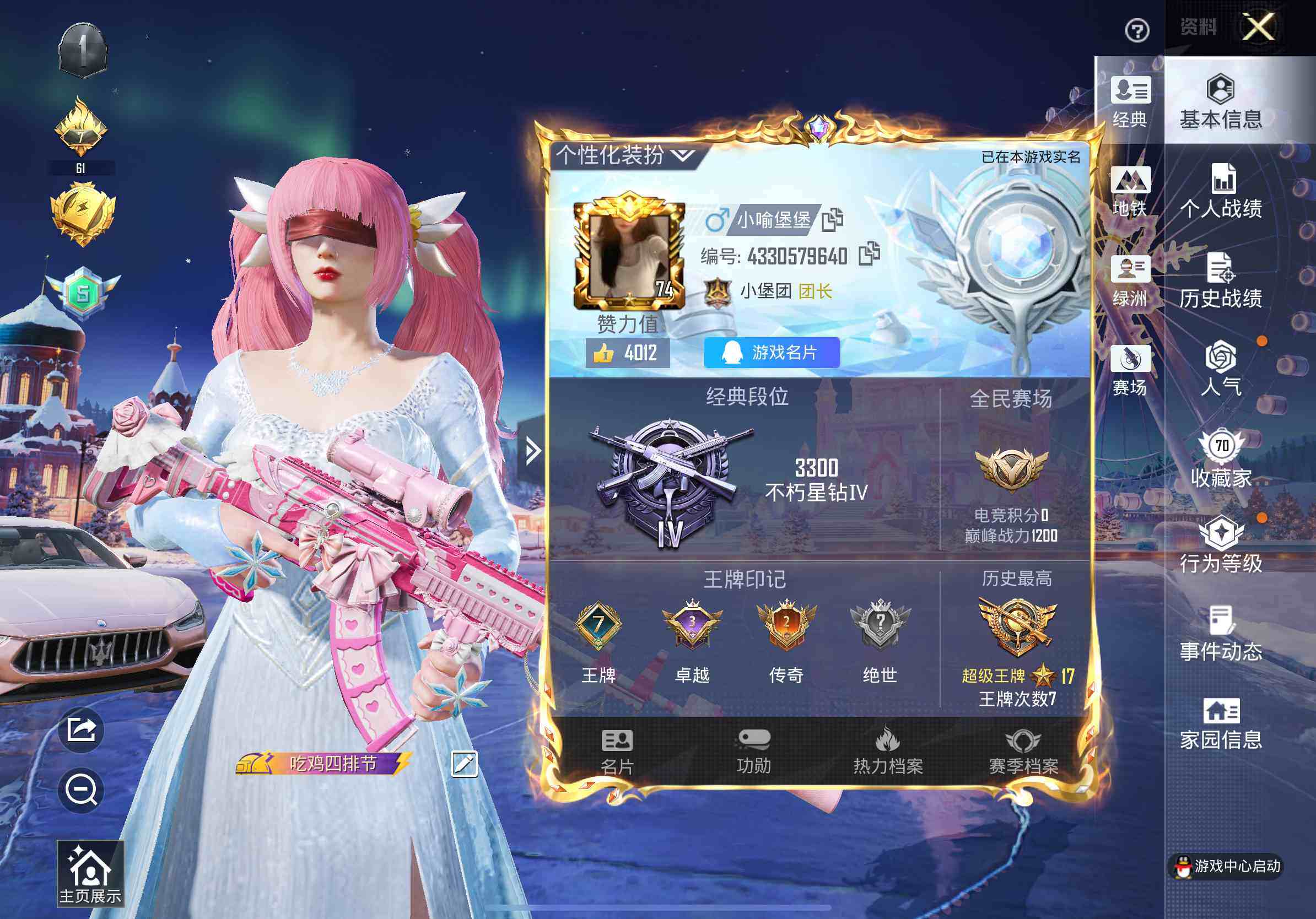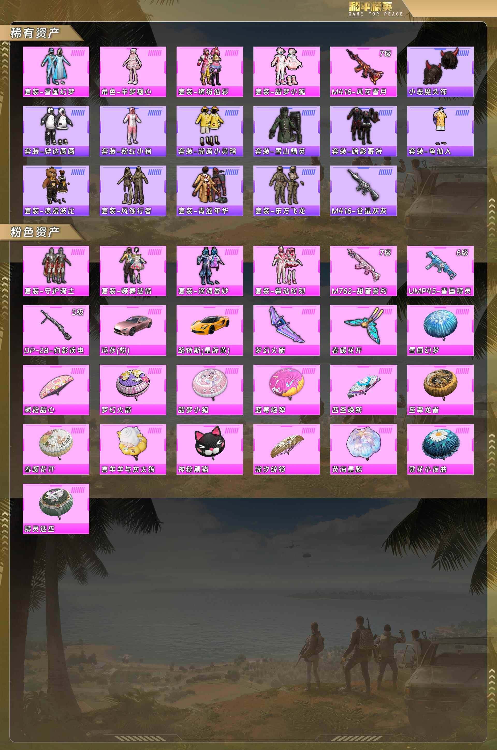 素材号-雪国/猪脸/小恶魔头饰/胖达圆圆/红眼罩/粉红小猪/老六服/浪漫波比/风蚀行者/东方飞龙/守护骑士/蝶舞迷情/深海曼妙/馨动时刻【呛皮】m4风花雪月7级/m762甜蜜誓约7级/ump45雪国精灵6级/dp28豹影疾电5级【载具】玛莎拉蒂粉/路特斯evija星际黄 没战神框(8粉套4粉呛2载具)hp4403-2粉色飞行器-88174热力值-7王牌印记-215套装-252呛皮 【热门品类】:粉装-雪国幻梦,粉装-缤纷油彩,套装-胖达圆圆,旭日初心兜帽大衣,套装-龟仙人,套装-潮萌小黄鸭,套装-暗影哥特,套装-浪漫波比,套装-粉红小猪 【粉色载具】:路特斯evija(星际黄),玛莎拉蒂ghibli(粉) 【粉色套装】:粉装-深海曼妙,粉装-守护骑士,粉装-雪国幻梦,粉装-蝶舞迷情,粉装-缤纷油彩,粉装-馨动时刻,粉装-甜梦小狐,角色-羊梦糖心 【粉色呛皮等级】:m416-风花雪月七级,m762-甜蜜誓约七级,ump45-雪国精灵六级,dp-28-豹影疾电五级 【粉色呛皮】:m416-风花雪月,m762-甜蜜誓约,ump45-雪国精灵,dp-28-豹影疾电 【粉色飞行器】:春暖花开飞行器,梦幻火箭飞行器 【粉色降落伞】:至尊龙雀降落伞,雪国幻梦降落伞,春暖花开降落伞,精灵迷巫降落伞,梦幻火箭降落伞,神秘黑猫降落伞,繁花小夜曲降落伞,四圣焕新降落伞,潮汐统领降落伞,蓝莓炮弹降落伞,甜梦小狐降落伞,飒粉甜心降落伞,荧海星豚降落伞,喜羊羊与灰太狼降落伞 【稀有套装】:套装-龟仙人,套装-云朵鹅,套装-雪绒豹,套装-蓝海鲸歌,套装-朱霞炽焰,套装-凌霄紫焰,套装-擎苍青焰 【稀有呛皮】:akm-冰凉西瓜,akm-四圣焕新,akm-夜灯,akm-彩虹符号,akm-春暖花开,akm-灼热熔岩,akm-玉龙,akm-龙的传人,m16a4-南瓜骑士,m16a4-幻世战舞者,m16a4-机械英豪,m16a4-甜心亚梦,m16a4-红色方程式,m16a4-蓝色火焰,m16a4-魔法学院,scar-l-炫彩节奏,scar-l-玉兔迎春,scar-l-甜蜜誓约,scar-l-金风玉露,scar-l-雷霆特警,m416-仓鼠灰灰,m416-夜灯,m416-神秘黑猫,m416-蓝色火焰,groza-2b战斗服款,groza-异彩先驱,groza-恐龙拽拽,groza-懵萌河马,groza-春暖花开,groza-治愈之星,groza-生命誓言,groza-黑色刀锋,aug-天降萌叽,aug-闲梦青缨,aug-魔法学院,q-原初圣火,q-彩虹符号,q-潮汐统领,q-银河战甲,q-飞驰魅影,m762-天降萌叽,m762-拳皇97,m762-牛气冲天,m762-瑞龙福将,m762-镭射皇者,m762-云朵鹅,mk47-洛神天依,g36c-不夜海上花,g36c-懵萌河马,g36c-炙焰牛王,g36c-雪国精灵,ac-val-天降萌叽,ac-val-甜心亚梦,ac-val-闲梦青缨,arx-凌霄紫焰,uzi-众神之王,uzi-古堡领主,uzi-生命誓言,uzi-魔法学院,ump45-夜灯,ump45-春暖花开,ump45-生命誓言,vect-治愈之星,vect-金玉无双,vect-黑色刀锋,汤姆逊-勇闯险境,汤姆逊-天降萌叽,汤姆逊-异彩先驱,汤姆逊-炫彩节奏,汤姆逊-甜梦小狐,汤姆逊-耀粉歌者,野牛-机械英豪,mp5k-众神之王,mp5k-异彩先驱,mp5k-繁花小夜曲,mp5k-蓝莓炮弹,js9-凌霄紫焰,p90-飞驰魅影,kar98k-勇闯险境,kar98k-彩虹符号,kar98k-炫彩节奏,kar98k-蜘蛛突变者,kar98k-飞驰魅影,m24-治愈之星,m24-炫彩节奏,m24-赤寒幽灵,m24-众神之王,m24-冰封烈焰,awm-不夜海上花,awm-庄周梦蝶,sks-勇闯险境,sks-夜灯,sks-折纸暴龙,sks-炫彩节奏,sks-迅猛狂鲨,vss-华贵君王,vss-彩虹符号,vss-镭射皇者,vss-雷霆特警,vss-黑色刀锋,mini14-原初圣火,mini14-异彩先驱,mini14-春暖花开,mini14-梦幻火箭,mini14-炫彩节奏,mini14-生命誓言,mini14-筑梦精灵,mini14-金鼠迎春,mk14-治愈之星,win94-机械英豪,win94-瑞龙福将,slr-众神之王,qbu-不夜海上花,莫辛纳甘-懵萌河马,amr-喜羊羊与灰太狼,m417-惊鸿侠骨,mk20-h-莲影清波,m200-惊鸿侠骨,svd-云朵鹅,s686-不夜海上花,s686-冰封烈焰,s686-奇异狩猎者,s686-幽冥伯爵,s686-王牌投手,s686-魔法学院,s1897-勇闯险境,s1897-春暖花开,s1897-炫彩节奏,s1897-镭射皇者,s1897-飞驰魅影,s12k-玩趣呆呆,s12k-瑞龙福将,s12k-pel轰鸣竞梦者,s12k-夜灯,s12k-幻世战舞者,s12k-机械英豪,dbs-圣堂之誓,dbs-甜心亚梦,spas-12-云朵鹅,m249-古堡领主,m249-彩虹符号,m249-拳皇97,m249-镭射皇者,dp-28-原初圣火,dp-28-清新柠檬,dp-28-甜心亚梦,mg3-幻世战舞者,mg3-惊鸿侠骨,mg3-瑞龙福将,pkm-懵萌河马,mg-36-凌霄紫焰,p92-拳皇97,p92-雷霆特警,p92-凌霄紫焰,p1911-冰封烈焰,p18c-原初圣火,蝎式手呛-欢乐香蕉,沙墨之鹦-云朵鹅,爆炸猎弓-天星战神,爆炸猎弓-惊鸿侠骨,大砍刀-2p战斗服款,大砍刀-云朵鹅,平底锅-凌霄紫焰 【其他套装】:套装-ss2特训,套装-ss5特训,套装-ss6特训,套装-ss7特训,套装-ss8特训,套装-ss9特训,套装-ss10特训,套装-ss11特训,套装-ss12特训,套装-ss13特训,套装-ss14特训,套装-ss15特训,套装-ss17特训,套装-ss18特训,套装-ss19特训,套装-ss20特训,套装-ss21特训,套装-ss24特训,套装-ss25特训,套装-ss26特训,套装-ss27特训,套装-ss28特训,套装-丛林猎人,套装-人气偶像,套装-传奇侦探,套装-光之冒险,套装-冷焰舞者,套装-北国孤狼,套装-半糖蓝莓,套装-夏日倾情,套装-夏日音浪,套装-奇趣企鹅,套装-帅气教官,套装-幻世战舞者,套装-怒火燎原,套装-拳皇97草薙京,套装-探宝勇士,套装-摇滚狂鲨,套装-春日漫步,套装-暗影哥特,套装-朋克治安官,套装-格斗专家,套装-沙漠兵团,套装-海岛探路者,套装-滨海厨神,套装-潮流先锋,套装-灰色守护者,套装-灰色格斗者,套装-炫蓝之夏,套装-炽焰拳师,套装-热血青春,套装-爆竹金鼠,套装-牛气冲天,套装-牛气满满,套装-特战装甲,套装-特殊使命,套装-特种空勤,套装-猛禽,套装-玉兔迎春,套装-王牌教练,套装-甜蜜告白,套装-甜蜜熊情侣,套装-疯狂小兔子,套装-白熊同盟,套装-破蛋小黄鸡,套装-