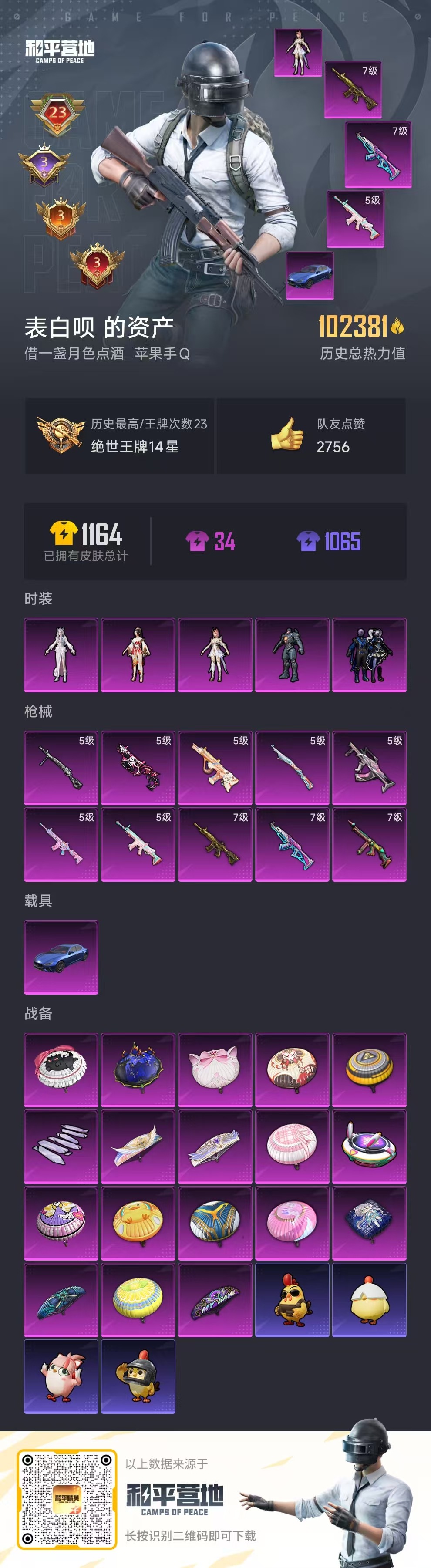 [14841490]5粉装 10特效呛 1载具 23印记 可二次 可修改实名 【热门装扮】:狂花道·不知火舞冷漠罗丽复仇流浪者暗夜玫瑰圣堂之誓激萌罗小黑仓鼠灰灰深海小丑鱼浪漫波比 【载具】:玛莎拉蒂ghibli蓝 【稀有呛皮】:aug-暖羊咩咩kar98k-巳巳如意groz