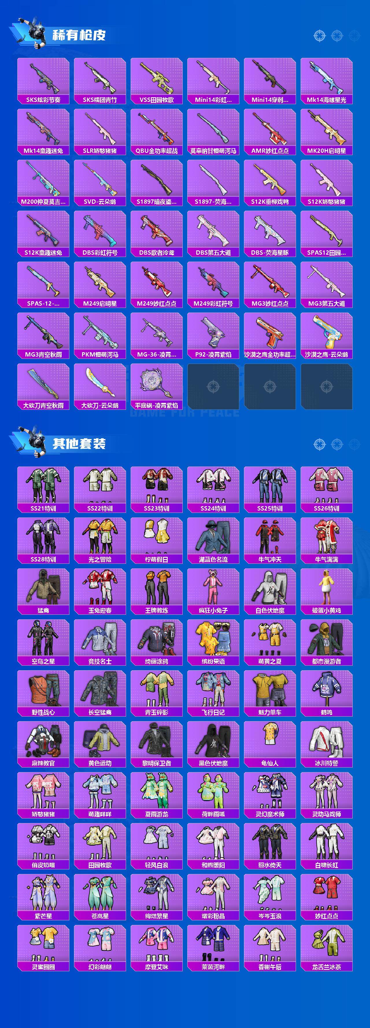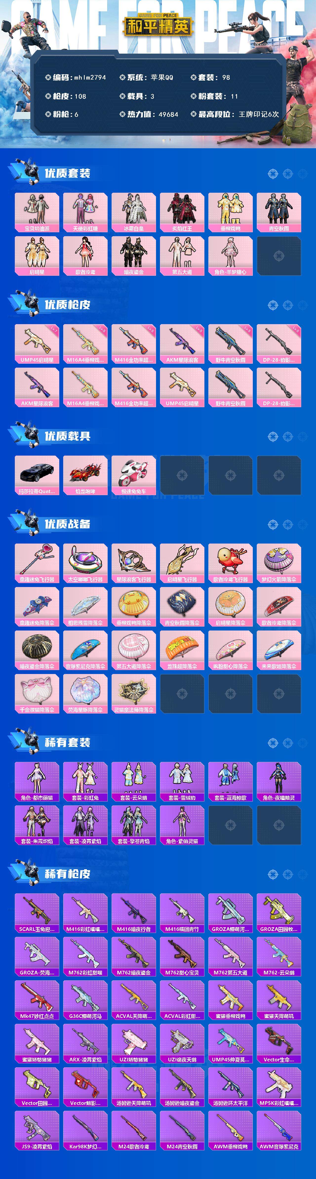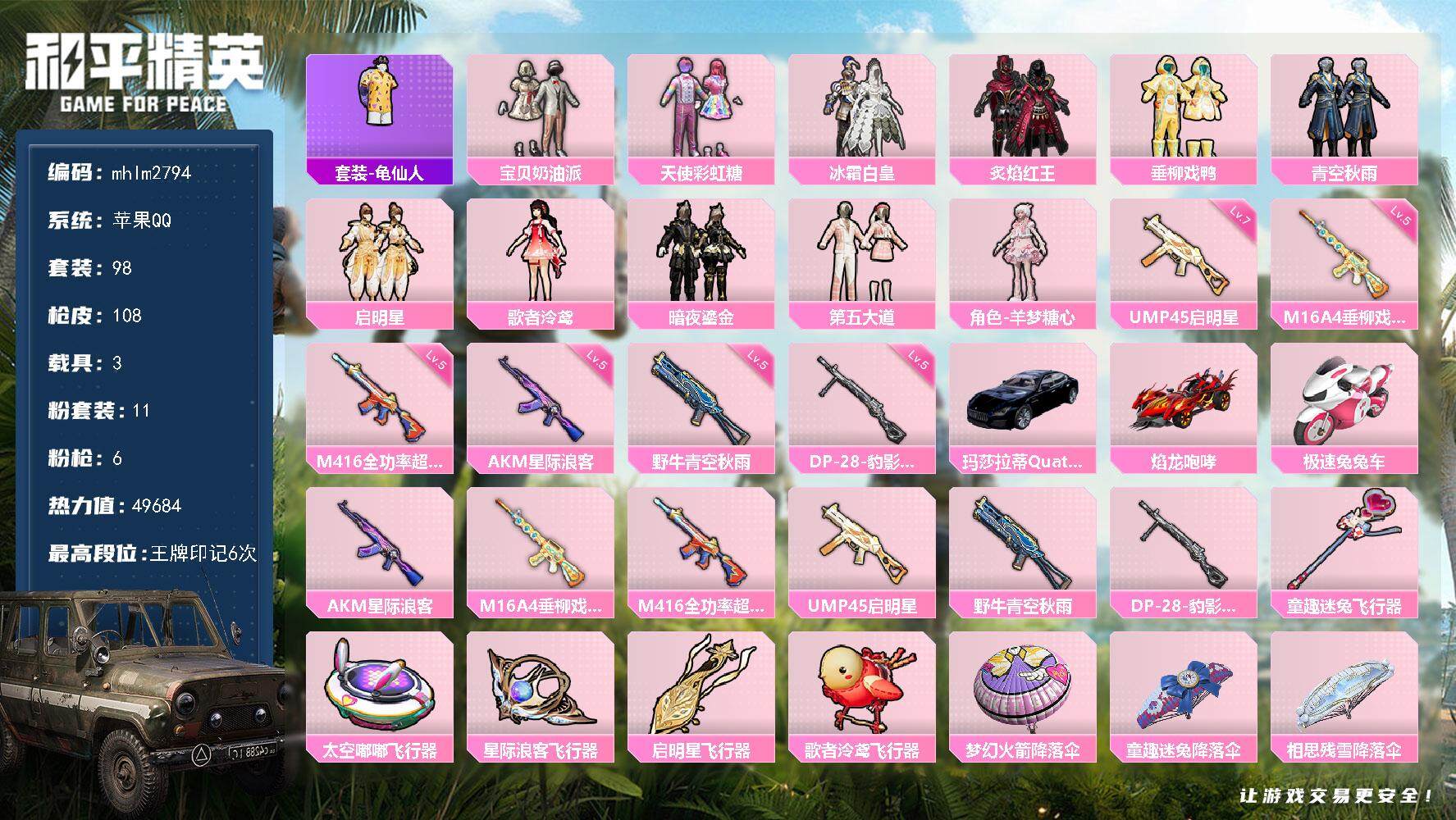 [14851851]【mhlm2794】苹果 手q-11粉装-6特效呛-3载具-5粉色飞行器-49684热力值-6王牌印记-98套装-108呛皮 【热门品类】:套装-龟仙人 【粉色套装】:粉装-宝贝奶油派,粉装-天使彩虹糖,粉装-冰霜白皇,粉装-炙焰红王,粉装-垂柳戏鸭,粉装-青空秋雨,粉装-启明星,角色-歌者泠鸢,粉装-暗夜鎏金,粉装-第五大道,角色-羊梦糖心 【粉色呛皮等级】:akm-星际浪客五级,m16a4-垂柳戏鸭五级,m416-全功率超战五级,ump45-启明星七级,野牛-青空秋雨五级,dp-28-豹影疾电五级 【粉色载具】:玛莎拉蒂quattropte(夜幕蓝),焰龙咆哮,极速兔兔车 【粉色呛皮】:akm-星际浪客,m16a4-垂柳戏鸭,m416-全功率超战,ump45-启明星,野牛-青空秋雨,dp-28-豹影疾电 【粉色飞行器】:童趣迷兔飞行器,太空嘟嘟飞行器,星际浪客飞行器,启明星飞行器,歌者泠鸢飞行器 【粉色降落伞】:梦幻火箭降落伞,童趣迷兔降落伞,相思残雪降落伞,垂柳戏鸭降落伞,青空秋雨降落伞,启明星降落伞,歌者泠鸢降落伞,暗夜鎏金降落伞,音爆索尼克降落伞,第五大道降落伞,龙珠超降落伞,飒粉甜心降落伞,未来歌姬降落伞,千金淑猫降落伞,荧海星豚降落伞,灵猫魔法师降落伞 【稀有套装】:套装-龟仙人,角色-都市丽猫,套装-彩虹兔,套装-云朵鹅,套装-雪绒豹,套装-蓝海鲸歌,角色-夜瞳黯灵,套装-朱霞炽焰,套装-凌霄紫焰,套装-擎苍青焰,角色-紫俏灵猫 【稀有呛皮】:scar-l-玉兔迎春,m416-彩虹嘻嘻猴,m416-暗夜行者,m416-糯团青竹,groza-懵萌河马,groza-田园牧歌,groza-荧海星豚,m762-彩虹甜喵,m762-暗夜鎏金,m762-甜心宝贝,m762-第五大道,m762-云朵鹅,mk47-妙红点点,g36c-懵萌河马,ac-val-天降萌叽,ac-val-彩虹甜喵,蜜獾-垂柳戏鸭,蜜獾-天降萌叽,蜜獾-娇憨猪猪,arx-凌霄紫焰,uzi-娇憨猪猪,uzi-诡夜天鹅,ump45-仲夏莫吉托,vect-生命誓言,vect-田园牧歌,vect-魅影蝠王,汤姆逊-天降萌叽,汤姆逊-暗夜鎏金,汤姆逊-环太平洋,mp5k-彩虹嘻嘻猴,js9-凌霄紫焰,kar98k-梦幻火箭,m24-歌者泠鸢,m24-青空秋雨,