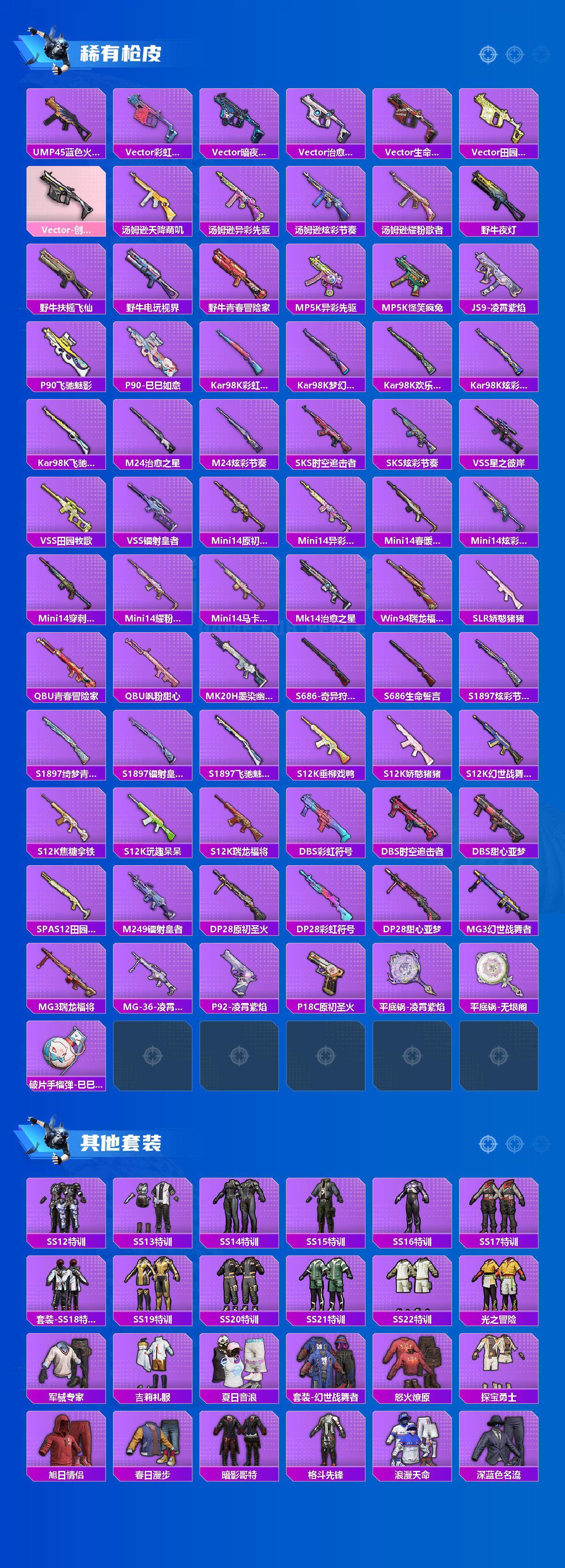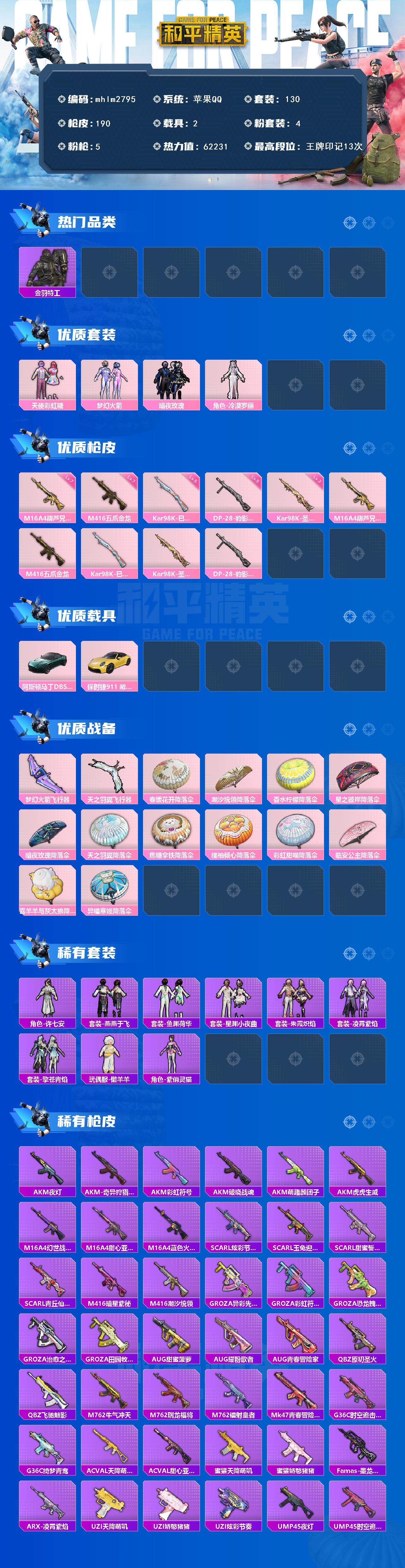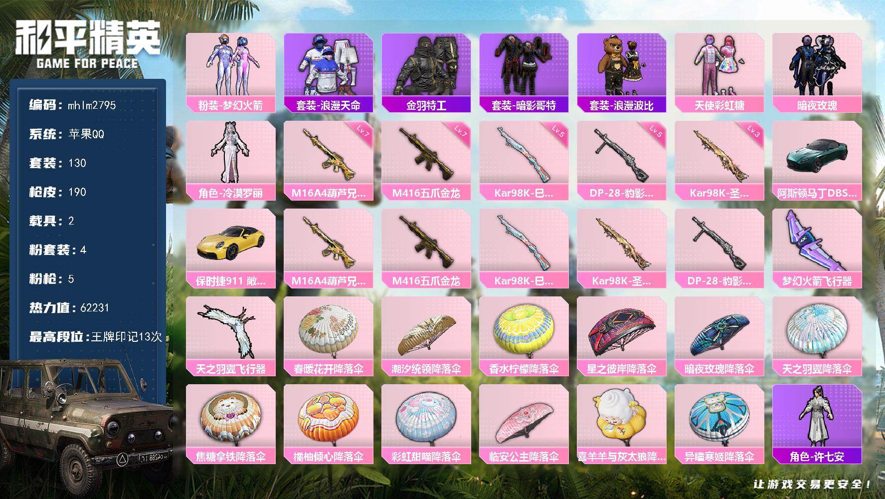 [14851896]【mhlm2795】苹果 手q-4粉装-5特效呛-2载具-3粉色飞行器-62231热力值-13王牌印记-130套装-190呛皮 【热门品类】:粉装-梦幻火箭,套装-浪漫天命,套装-金羽特工,套装-暗影哥特,套装-浪漫波比 【粉色套装】:粉装-天使彩虹糖,粉装-梦幻火箭,粉装-暗夜玫瑰,角色-冷漠罗丽 【粉色呛皮等级】:m16a4-葫芦兄弟七级,m416-五爪金龙七级,kar98k-巳巳如意五级,kar98k-圣域龙灵三级,dp-28-豹影疾电五级 【粉色载具】:阿斯顿马丁dbs(绿),保时捷911 敞篷版(极速黄) 【粉色呛皮】:m16a4-葫芦兄弟,m416-五爪金龙,kar98k-巳巳如意,kar98k-圣域龙灵,dp-28-豹影疾电 【粉色飞行器】:梦幻火箭飞行器,天之羽翼飞行器 【粉色降落伞】:春暖花开降落伞,潮汐统领降落伞,香水柠檬降落伞,星之彼岸降落伞,暗夜玫瑰降落伞,天之羽翼降落伞,焦糖拿铁降落伞,橘柚倾心降落伞,彩虹甜喵降落伞,临安公主降落伞,喜羊羊与灰太狼降落伞,异瞳寒姬降落伞 【稀有套装】:套装-雪国风尚,角色-许七安,套装-燕燕于飞,套装-鱼渊荷华,套装-星渊小夜曲,套装-朱霞炽焰,套装-凌霄紫焰,套装-擎苍青焰,玩偶服-懒羊羊,角色-紫俏灵猫 【稀有呛皮】:akm-夜灯,akm-奇异狩猎者,akm-彩虹符号,akm-破晓战魂,akm-萌趣颜团子,akm-虎虎生威,m16a4-幻世战舞者,m16a4-甜心亚梦,m16a4-蓝色火焰,scar-l-炫彩节奏,scar-l-玉兔迎春,scar-l-甜蜜誓约,scar-l-青丘仙客,m416-暗星紫秘,m416-潮汐统领,groza-异彩先驱,groza-彩虹符号,groza-恐龙拽拽,groza-治愈之星,groza-田园牧歌,aug-甜蜜菠萝,aug-耀粉歌者,aug-青春冒险家,q-原初圣火,q-飞驰魅影,m762-牛气冲天,m762-瑞龙福将,m762-镭射皇者,mk47-青春冒险家,g36c-时空追击者,g36c-绮梦青鸾,ac-val-天降萌叽,ac-val-甜心亚梦,蜜獾-天降萌叽,蜜獾-娇憨猪猪,famas-墨龙九天,arx-凌霄紫焰,uzi-天降萌叽,uzi-娇憨猪猪,uzi-炫彩节奏,ump45-夜灯,ump45-时空追击者,ump45-蓝色火焰,ve