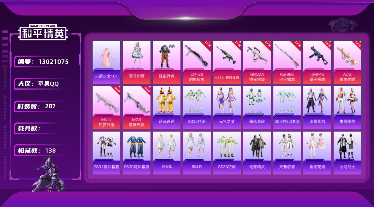 2261291-无二次 苹果q-3稀有2粉装8特效呛3热门71套装138呛皮 稀有战神老1素材号 ss28无敌战神框 老101 m4火箭少女 怪诞 7满级呛 35009热力值 8印记 历史无敌战神 【3稀有】 火箭少女101 m416-101火箭少女 awm-黄金龙骨 【2粉装】 雪月幻音 怪诞乔克 【8特效呛】 kar98k-巳巳如意 5级 m762-青锋波束 5级 dp-28-豹