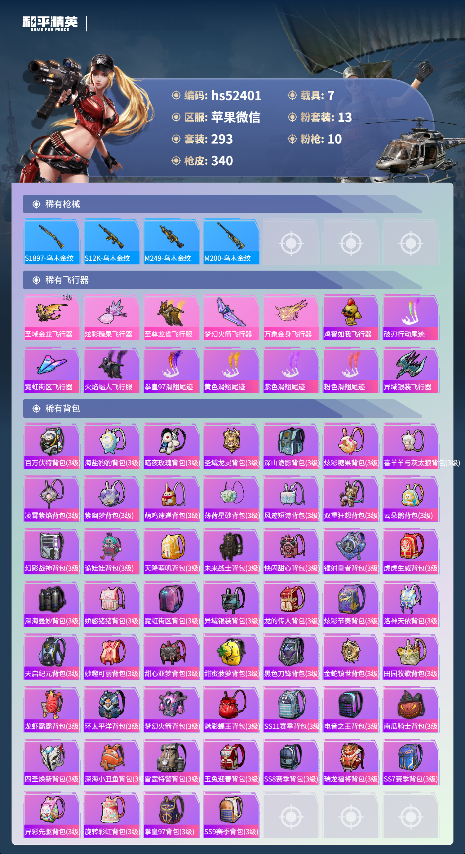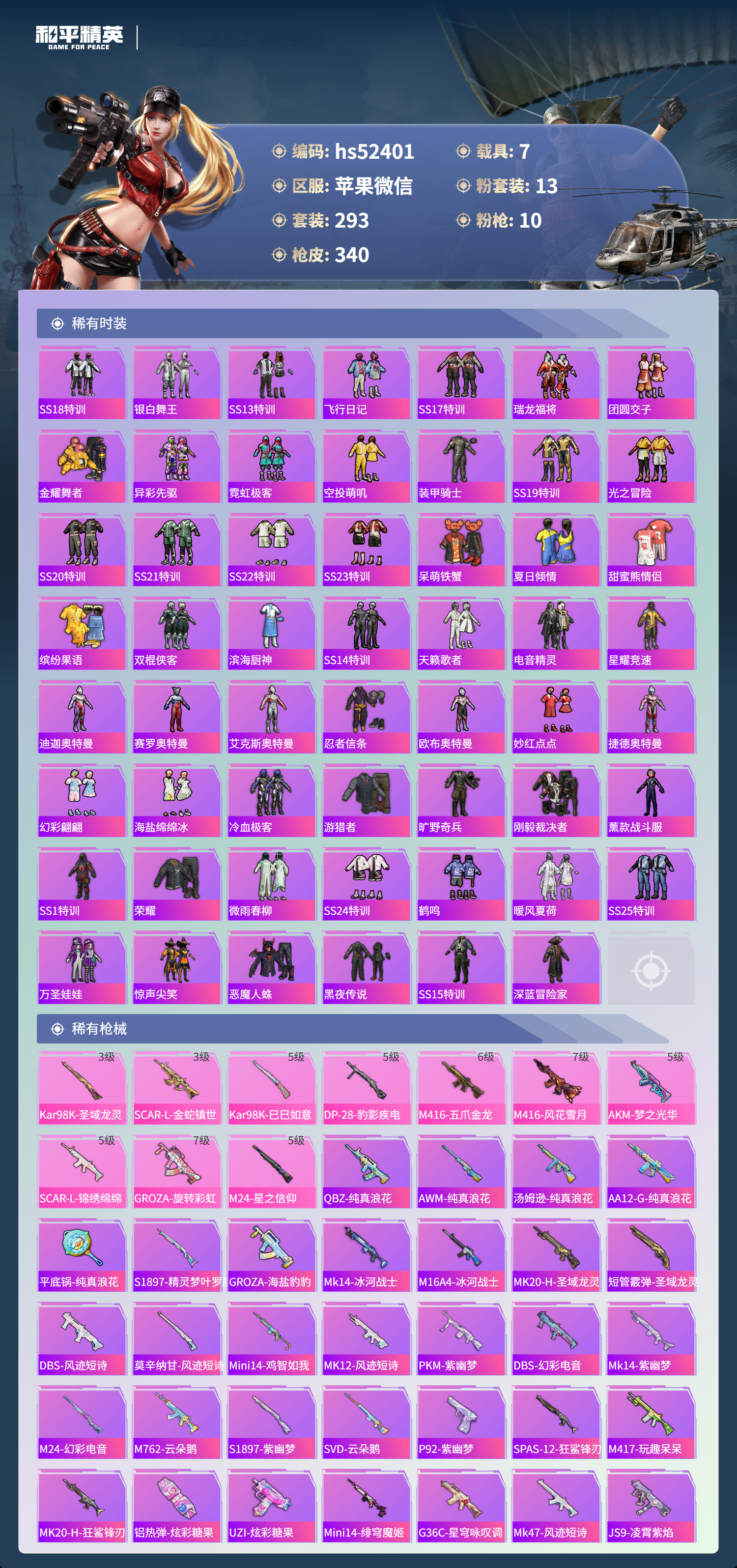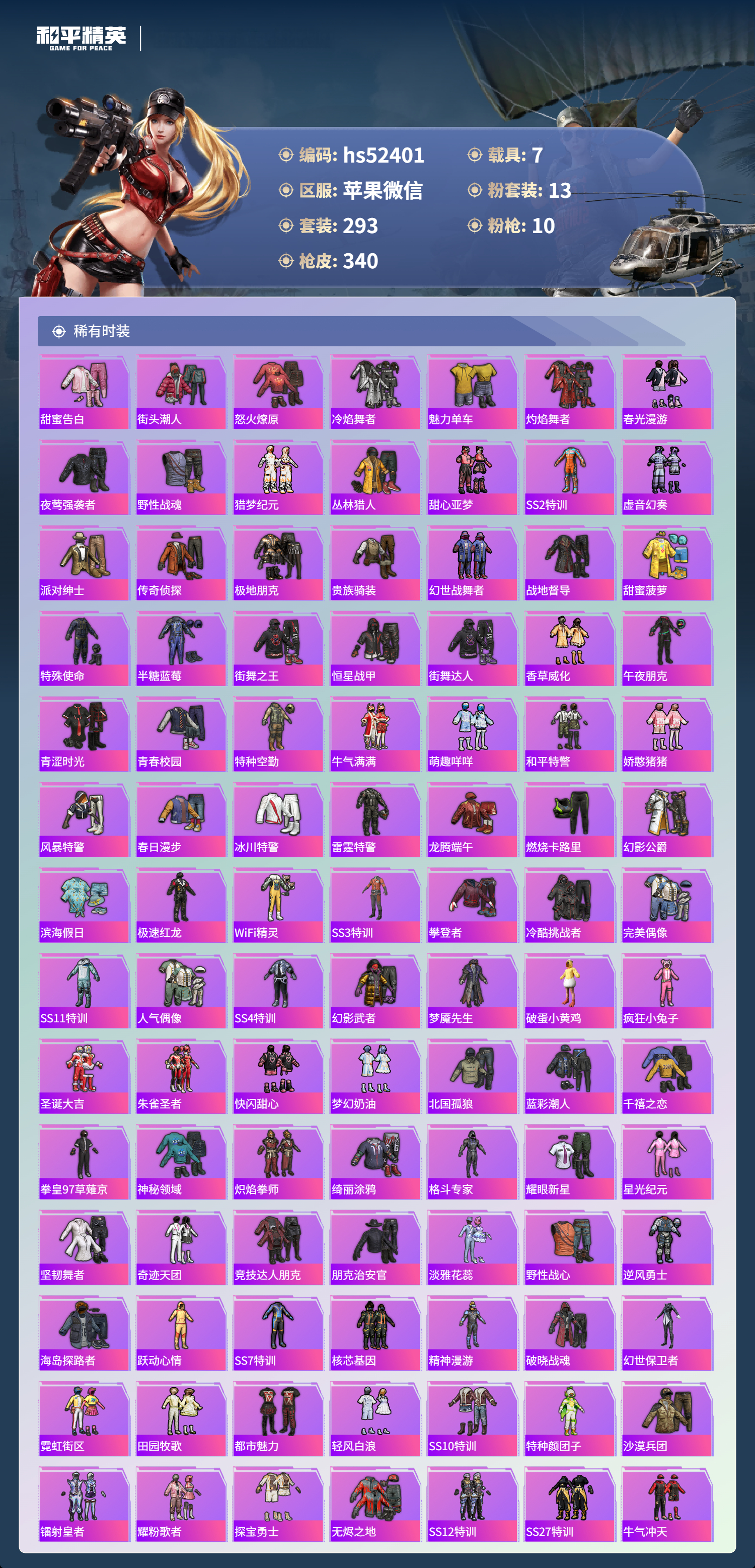hs52401 苹果微信-32王牌印记-有战神框-1红装-13粉装-10特效呛-7载具-热力值-293套装-340呛皮-10卓越印记-7传奇印记【1红装】圣域龙灵-瑞拉/3级【13粉装】套装-南瓜骑士套装-莲影清波套装-吟月归客套装-金曜白虎套装-幻彩电音角色-初号机款机体服角色-狂魅哈莉套装-恐龙拽拽套装-虎啸骄阳套装-幻影战神套装-梦幻火箭套装-飓风飞鹰