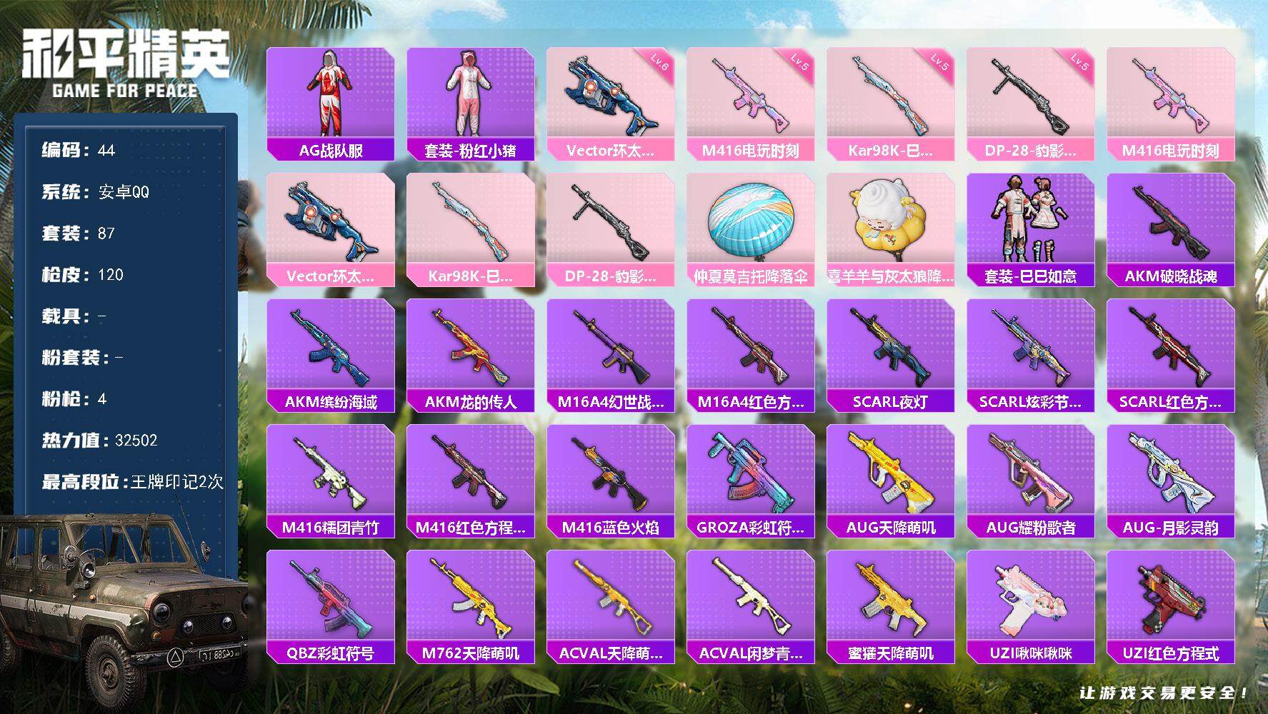 [14858699]【编号96716 可秒换绑】【精品升级呛号!适合新手玩家!】 安卓 手q-0粉装-4特效呛-0载具-1粉色飞行器-32502热力值-2王牌印记-87套装-120呛皮 【热门品类】:套装-ag战队服,套装-粉红小猪 【粉色呛皮等级】:m416-电玩时刻五级,vect-环太平洋六级,kar98k-巳巳如意五级,dp-28-豹影疾电五级 【粉色呛皮】:m416-电玩时刻,vect-环太平洋,kar98k-巳巳如意,dp-28-豹影疾电 【粉色降落伞】:仲夏莫吉托降落伞,喜羊羊与灰太狼降落伞 【稀有套装】:套装-巳巳如意,套装-炫彩糖果 【稀有呛皮】:aug-冰晶雪宝,akm-破晓战魂,akm-缤纷海域,akm-龙的传人,m16a4-幻世战舞者,m16a4-红色方程式,scar-l-夜灯,scar-l-炫彩节奏,scar-l-红色方程式,m416-糯团青竹,m416-红色方程式,m416-蓝色火焰,groza-彩虹符号,aug-天降萌叽,aug-耀粉歌者,aug-月影灵韵,q-彩虹符号,m762-天降萌叽,ac-val-天降萌叽,ac-val-闲梦青缨,蜜獾-天降萌叽,uzi-啾咪啾咪,uzi-红色方程式,ump45-夜灯,ump45-蓝色火焰,ump45-诡娃娃,vect-彩虹符号,汤姆逊-天降萌叽,汤姆逊-炫彩节奏,汤姆逊-耀粉歌者,野牛-夜灯,p90-巳巳如意,kar98k-炫彩节奏,kar98k-王子的夏天,kar98k-红色方程式,m24-炫彩节奏,m24-幻彩电音,sks-炫彩节奏,sks-糯团青竹,vss-彩虹符号,mini14-耀粉歌者,slr-彩虹符号,qbu-烈焰拳霸,m417-惊鸿侠骨,m200-惊鸿侠骨,s686-生命誓言,s686-红色方程式,s686-巳巳如意,s1897-炫彩节奏,s12k-玩趣呆呆,s12k-破晓战魂,s12k-夜灯,s12k-幻世战舞者,m249-彩虹符号,m249-破晓战魂,mg3-幻世战舞者,mg3-惊鸿侠骨,爆炸猎弓-惊鸿侠骨,破片手留单-巳巳如意 【其他套装】:套装-ss9特训,套装-ss13特训,套装-ss14特训,套装-ss16特训,套装-ss17特训,套装-ss19特训,套装-ss20特训,套装-ss21特训,套装-ss24特训,套装-ss25特训,套装-ss26特训,套装-