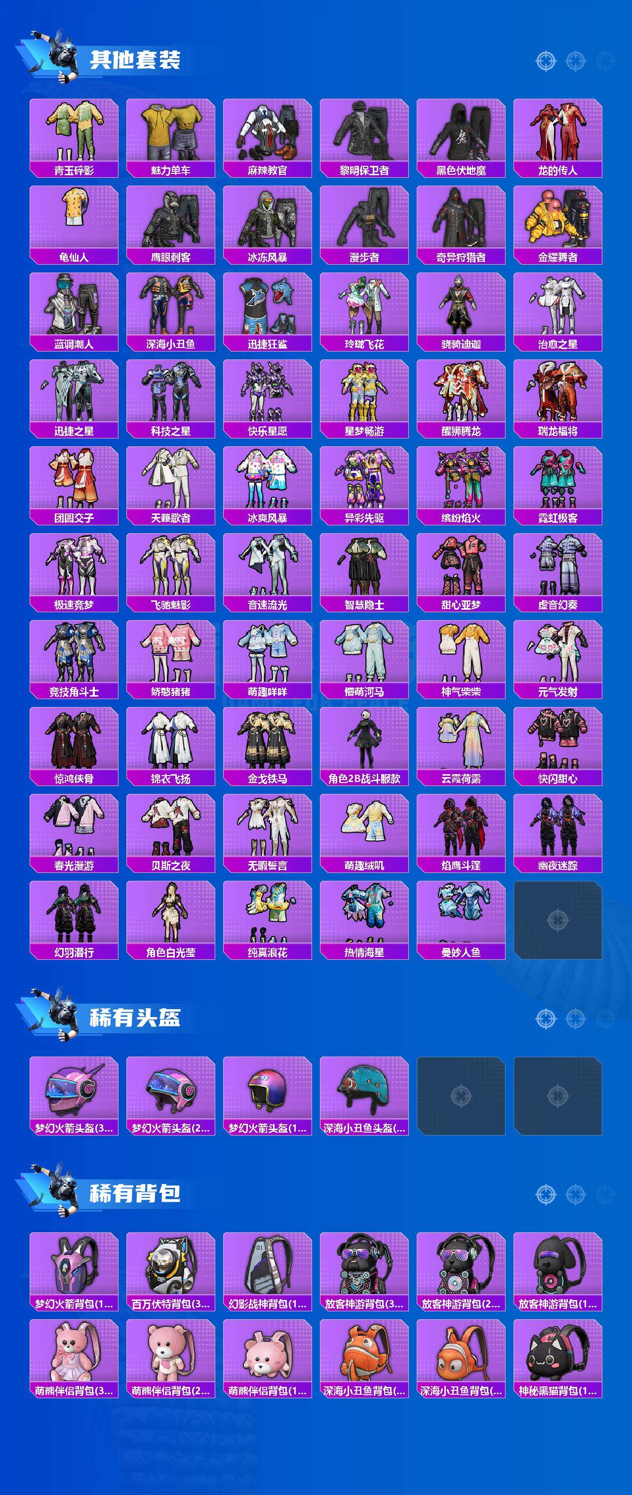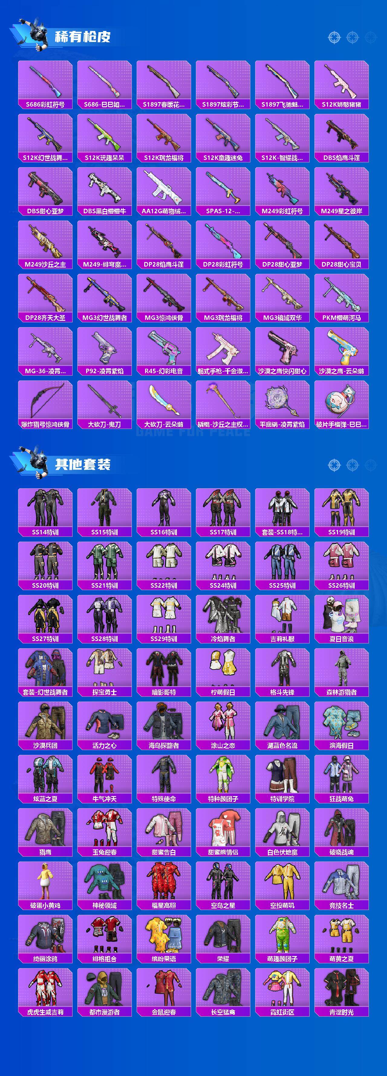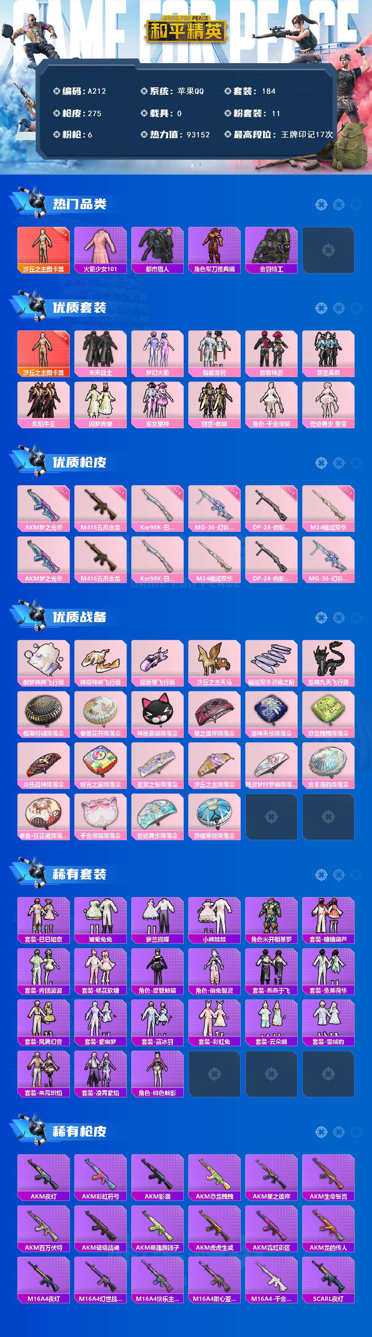 [14834248]苹果 【神装号 沙丘之主-图卡盟四级/火箭少女101/都市猎人/akm-梦之光华七级】手q-1神装-11粉装-6特效呛-0载具-7粉色飞行器-93152热力值-17王牌印记-184套装-275呛皮 【红色神装等级】:沙丘之主-图卡盟四级 【红色角色神装】:沙丘之主-图卡盟 【热门品类】:粉装-梦幻火箭,套装-火箭少女101,套装-都市猎人,套装-深海小丑鱼,套装-奇异狩猎者,角色-军刀雅典娜,套装-金羽特工,角色-2b战斗服款,套装-龟仙人,套装-暗影哥特 【粉色套装】:粉装-未来战士,粉装-梦幻火箭,粉装-智能音符,粉装-放客神游,粉装-显圣真君,粉装-炙焰牛王,粉装-闲梦青缨,粉装-室女星神,套装-创世·救赎,角色-千金淑猫,角色-奇迹舞步 美雪 【粉色呛皮等级】:akm-梦之光华七级,m416-五爪金龙七级,kar98k-巳巳如意五级,m24-镜域双华三级,dp-28-豹影疾电五级,mg-36-幻彩电音五级 【粉色呛皮】:akm-梦之光华,m416-五爪金龙,kar98k-巳巳如意,m24-镜域双华,dp-28-豹影疾电,mg-36-幻彩电音 【粉色飞行器】:酣梦熊熊飞行器,拂晓神骑飞行器,超新星飞行器,沙丘之主天马,镜域双华-灵镜之阶,龙翔九天飞行器 【粉色降落伞】:极限特训降落伞,春暖花开降落伞,神秘黑猫降落伞,星之彼岸降落伞,洛神天依降落伞,恐龙拽拽降落伞,炎氏战神降落伞,炫光之旅降落伞,圣堂之誓降落伞,沙丘之主降落伞,精灵梦叶罗丽降落伞,金丰海韵降落伞,拳皇·狂花道降落伞,千金淑猫降落伞,奇迹舞步降落伞,异瞳寒姬降落伞 【稀有套装】:套装-龟仙人,套装-巳巳如意,套装-雏菊兔兔,套装-萝兰蝴蝶,套装-小熊娃娃,角色-米开朗基罗,套装-糖糖葫芦,套装-青团波波,套装-棉花软糖,角色-摩登魅猫,角色-俏兔智灵,套装-燕燕于飞,套装-鱼渊荷华,套装-风舞幻音,套装-紫幽梦,套装-蓝冰羽,套装-彩虹兔,套装-云朵鹅,套装-雪绒豹,套装-朱霞炽焰,套装-凌霄紫焰,角色-绯色魅影 【稀有呛皮】:akm-夜灯,akm-彩虹符号,akm-影袭,akm-恐龙拽拽,akm-星之彼岸,akm-生命誓言,akm-百万伏特,akm-破晓战魂,akm-萌趣颜团子,akm-虎虎生威,akm-霓虹街区,akm-龙的传人,m16a4-夜灯,m16a
