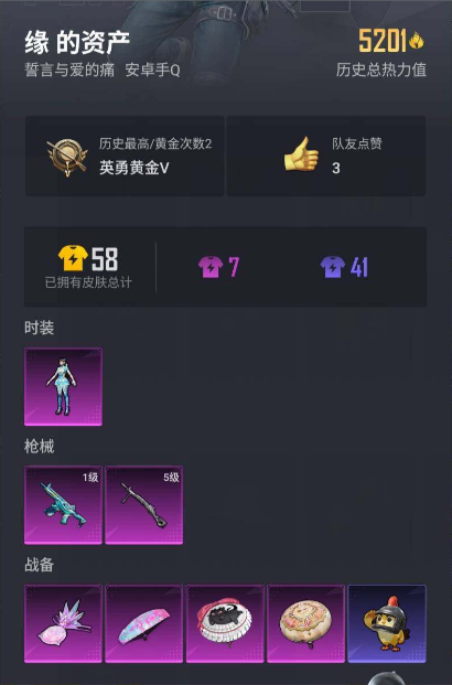 [14489113]安卓【小号/公主号/角色-异瞳寒姬】 手q-1粉装-2特效呛-0载具-1粉色飞行器-5201热力值-0王牌印记-8套装-21呛皮 【粉色套装】:角色-异瞳寒姬 【粉色呛皮等级】:蜜獾-异瞳寒姬一级,dp-28-豹影疾电五级 【粉色呛皮】:蜜獾-异瞳寒姬,dp-28-豹影疾电 【粉色降落伞】:星穹咏叹调降落伞,绯穹魔姬降落伞 【稀有套装】:套装-炫彩糖果 【稀有呛皮】:aug-冰晶雪宝,groza-影袭,aug-耀粉歌者,汤姆逊-天降萌叽,m24-幻彩电音,mg3-幻世战舞者 【其他套装】:套装-魅力单车,套装-漫步者,套装-贵族骑装 【营地id】:1014228747
