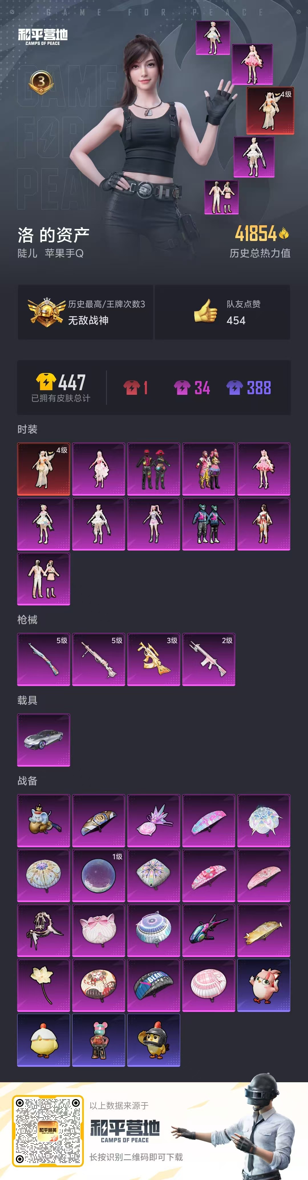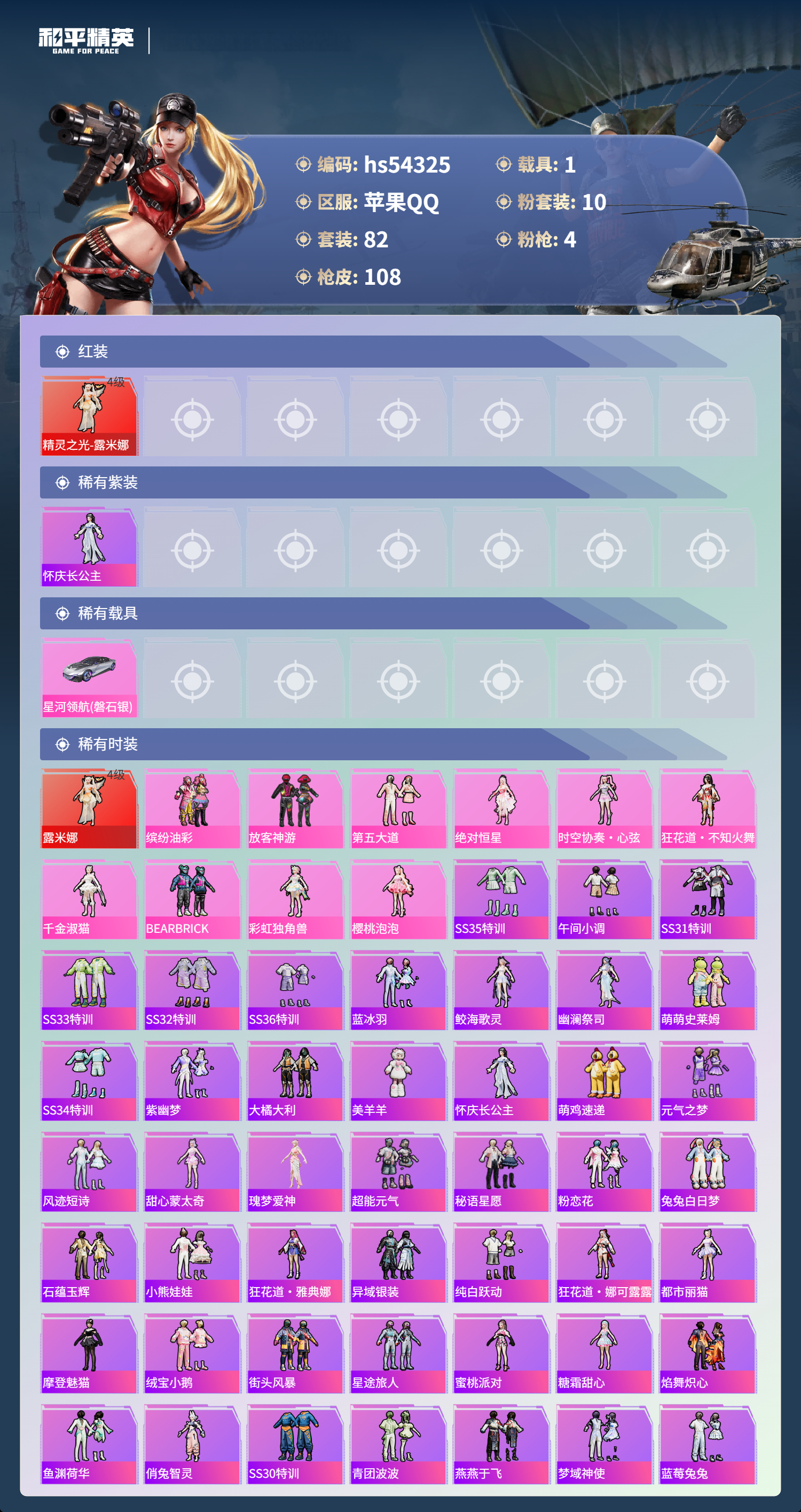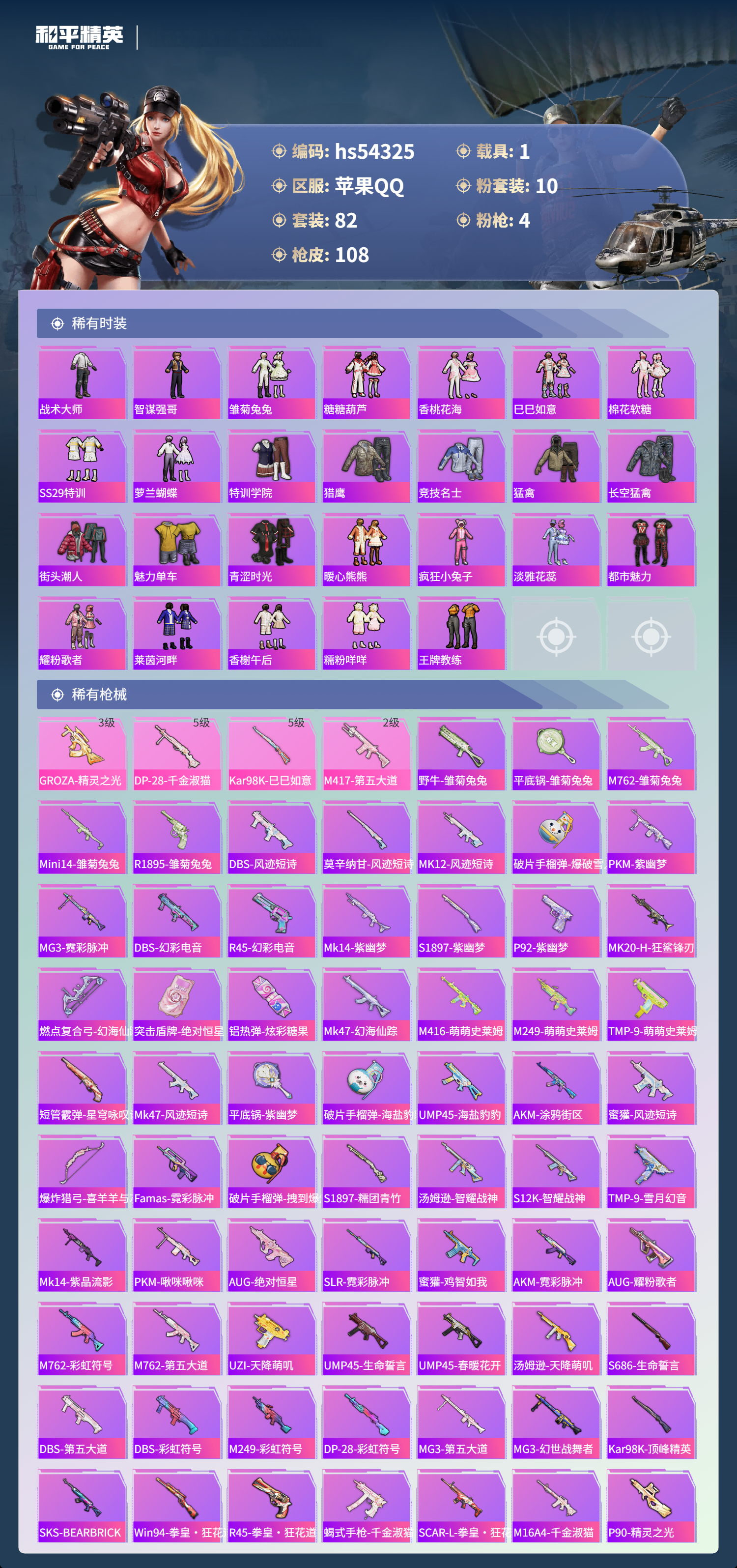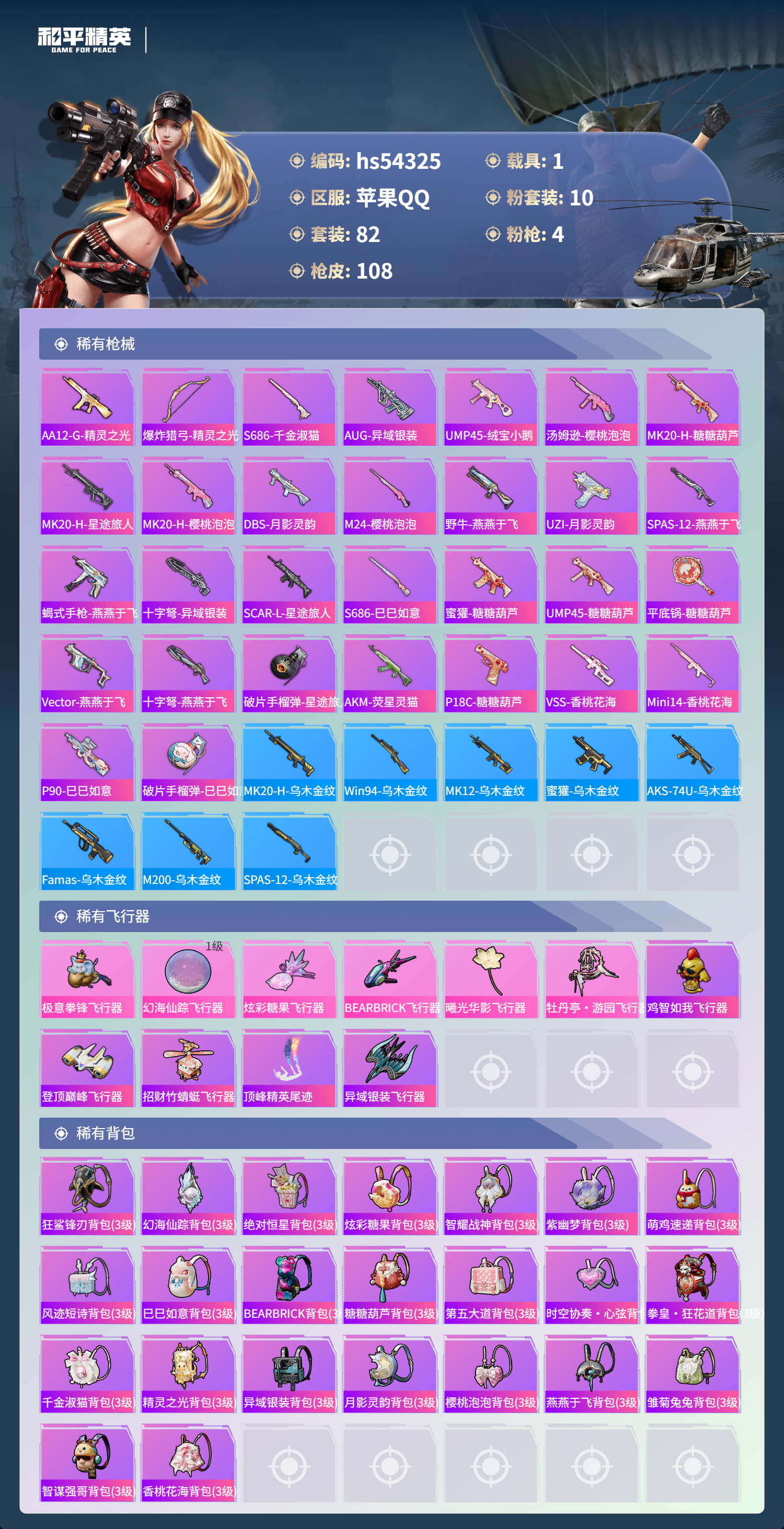 hs54325 苹果手q-3王牌印记-有战神框-1红装-10粉装-4特效呛-1载具-41854热力值-82套装-108呛皮【1红装】精灵之光-露米娜/4级【10粉装】套装-第五大道时空协奏·心弦套装-放客神游角色-绝对恒星角色-狂花道·不知火舞角色-樱桃泡泡角色-彩虹独角兽套装-bearbrick角色-千金淑猫套装-缤纷油彩【4特效呛】kar98k-巳巳如意/5级groz