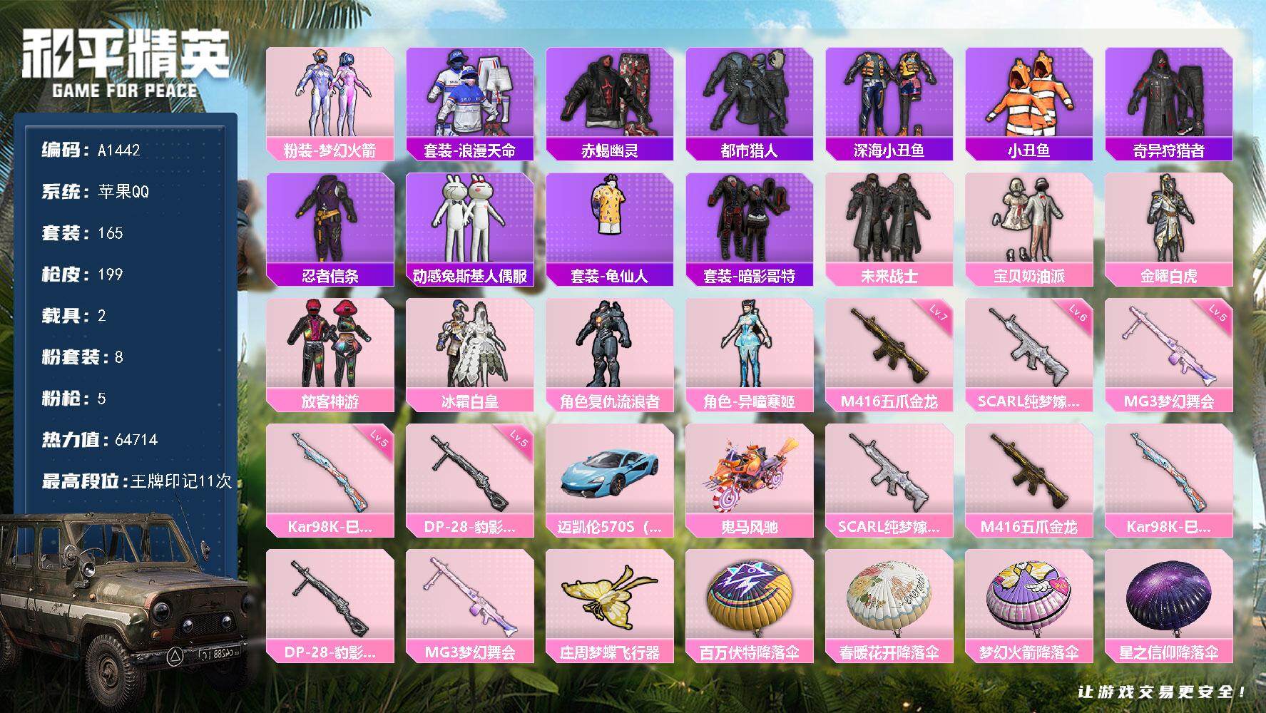 [14862711]苹果【男神号 梦幻火箭 异瞳寒姬 冰霜白皇 迈凯伦570s(天际蓝),鬼马风驰 scar-l-纯梦嫁纱六级,m416-五爪金龙七级,】 手q-8粉装-5特效呛-2载具-2粉色飞行器-64714热力值-11王牌印记-165套装-199呛皮 【热门品类】:粉装-梦幻火箭,套装-浪漫天命,套装-赤蝎幽灵,套装-都市猎人,套装-深海小丑鱼,套装-小丑鱼,套装-奇异狩猎者,套装-忍者信条,套装-动感兔斯基人偶服,套装-龟仙人,套装-暗影哥特 【粉色套装】:粉装-未来战士,粉装-宝贝奶油派,粉装-金曜白虎,粉装-梦幻火箭,粉装-放客神游,粉装-冰霜白皇,角色-复仇流浪者,角色-异瞳寒姬 【粉色呛皮等级】:scar-l-纯梦嫁纱六级,m416-五爪金龙七级,kar98k-巳巳如意五级,dp-28-豹影疾电五级,mg3-梦幻舞会五级 【粉色载具】:迈凯伦570s(天际蓝),鬼马风驰 【粉色呛皮】:scar-l-纯梦嫁纱,m416-五爪金龙,kar98k-巳巳如意,dp-28-豹影疾电,mg3-梦幻舞会 【粉色飞行器】:庄周梦蝶飞行器 【粉色降落伞】:百万伏特降落伞,春暖花开降落伞,梦幻火箭降落伞,星之信仰降落伞,橘柚倾心降落伞,甜梦小狐降落伞,垂柳戏鸭降落伞,未来歌姬降落伞,萌酷奶龙降落伞,精灵梦叶罗丽降落伞,异瞳寒姬降落伞 【稀有套装】:套装-龟仙人,套装-朱霞炽焰,套装-凌霄紫焰,套装-炫彩糖果 【稀有呛皮】:aug-冰晶雪宝,akm-2p战斗服款,akm-彩虹符号,akm-影袭,akm-玉龙,akm-王牌投手,akm-生命誓言,akm-百万伏特,akm-破晓战魂,akm-筑梦精灵,akm-虎虎生威,akm-霓虹街区,akm-龙的传人,m16a4-幻世战舞者,m16a4-甜心亚梦,scar-l-夜灯,scar-l-炫彩节奏,scar-l-玉兔迎春,scar-l-黄金龙骨,m416-糯团青竹,m416-蓝色火焰,groza-异彩先驱,groza-影袭,groza-懵萌河马,groza-春暖花开,groza-田园牧歌,groza-紫翼圣骑,aug-圣光天使,aug-天降萌叽,aug-幻影战神,q-彩虹符号,q-未来歌姬,q-飞驰魅影,m762-天降萌叽,m762-奇异狩猎者,m762-牛气冲天,m762-瑞龙福将,mk47-妙红点点,mk4