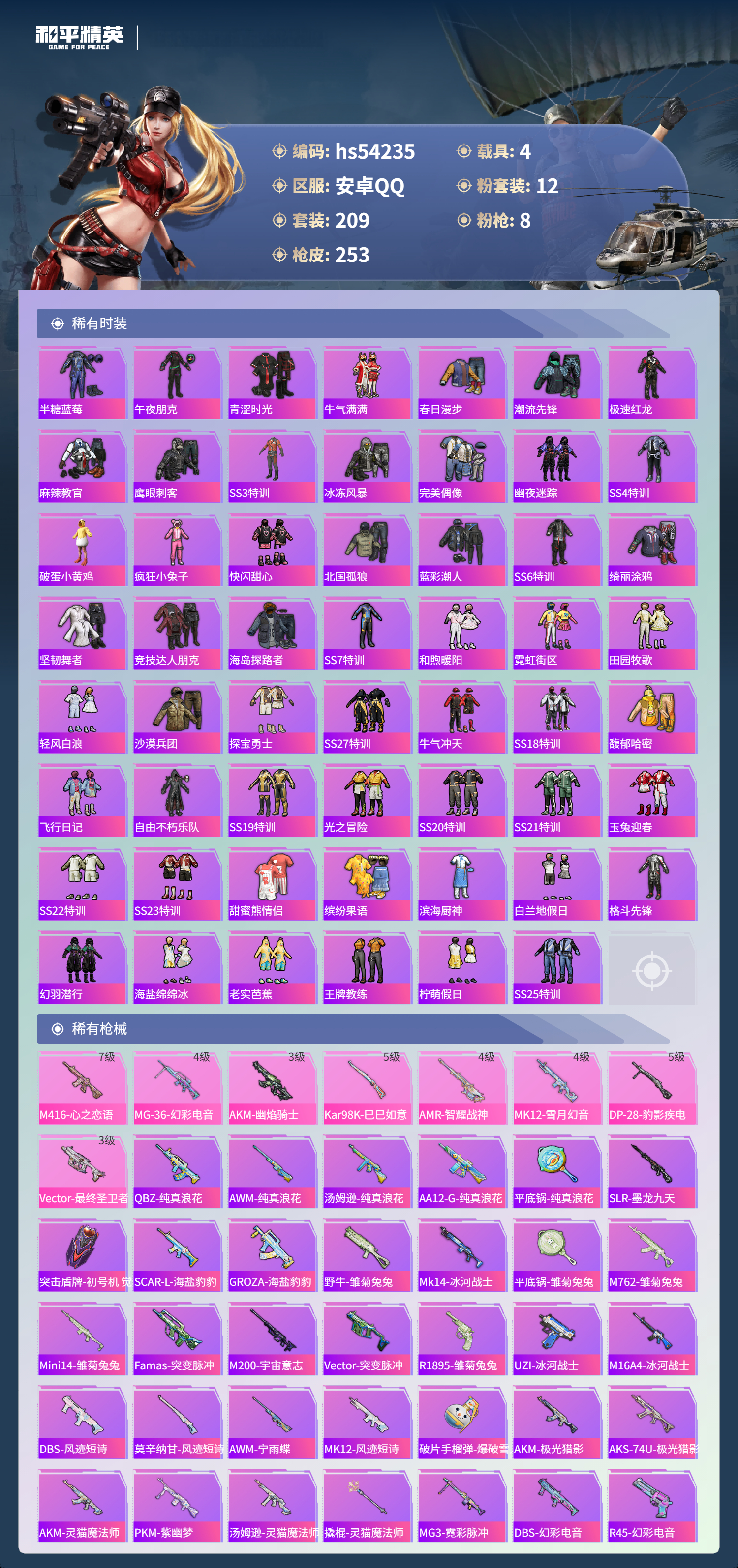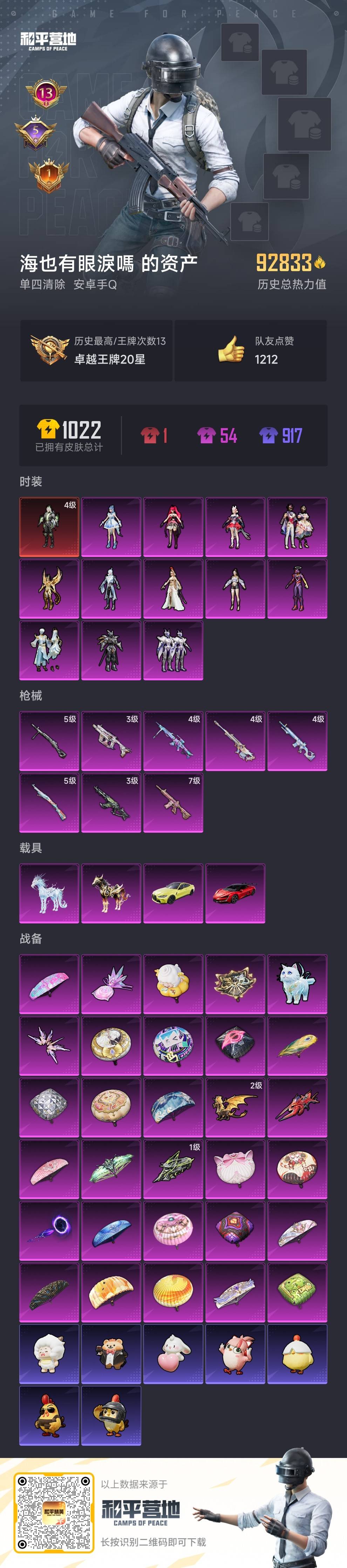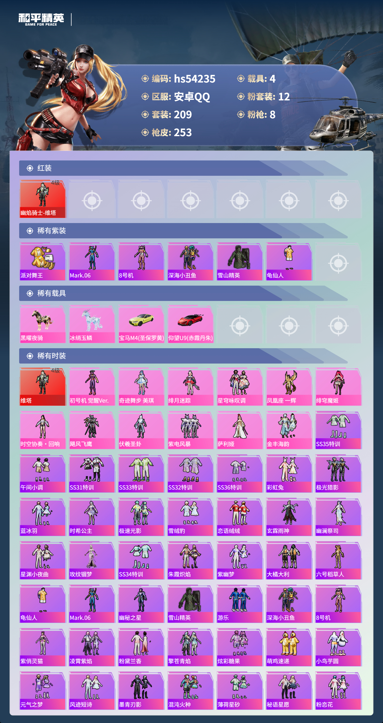 hs54235 安卓手q-13王牌印记-1红装-12粉装-8特效呛-4载具-92833热力值-209套装-253呛皮-5卓越印记-1传奇印记【1红装】幽焰骑士-维塔/4级【12粉装】角色-奇迹舞步 美琪套装-星穹咏叹调角色-初号机 觉醒ver.角色-萨利娅时空协奏·回响角色-凤凰座 一辉角色-伏羲圣卦套装-金丰海韵套装-紫电风暴角色-绯穹魔姬套装-飓风飞鹰角色-绯月迷踪