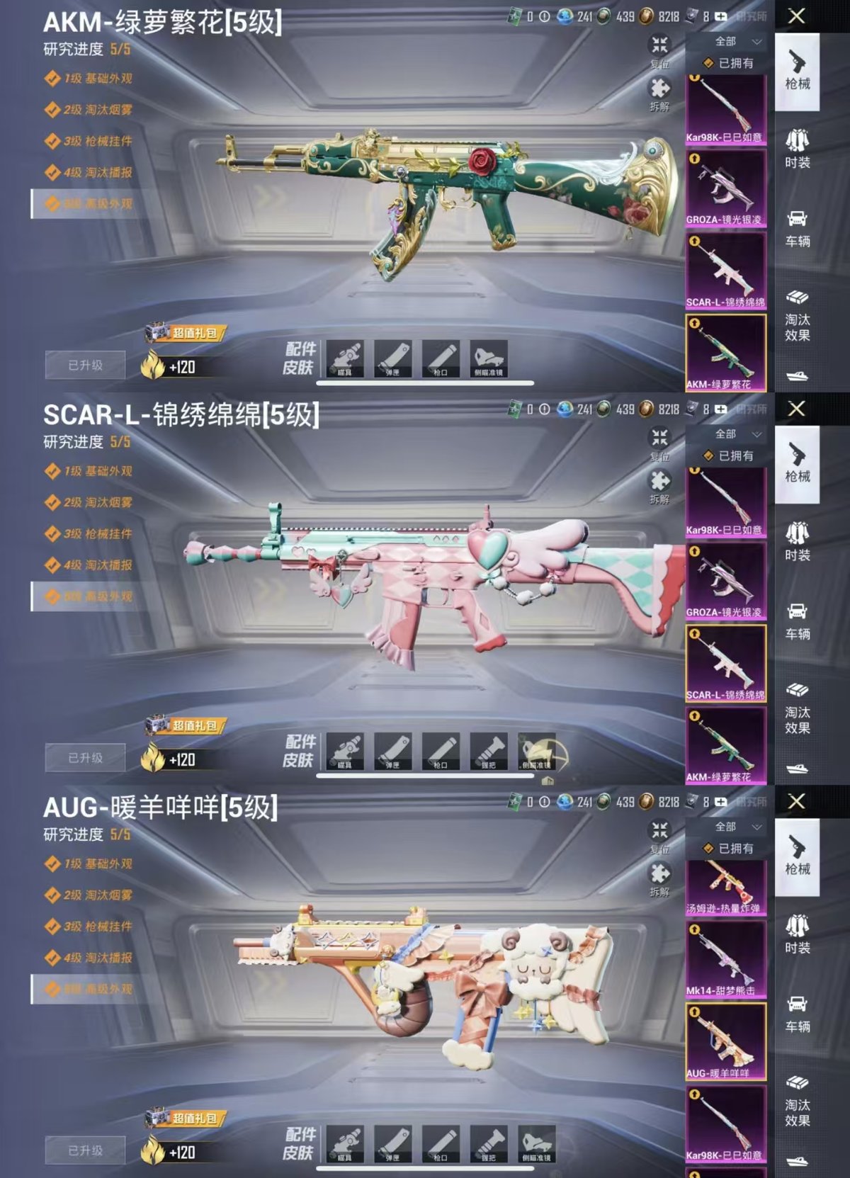 _2300723-实名:可修改时装数:669呛械数:240战备数:175热门装扮:呆萌铁蟹鹰眼刺客好奇恐龙复仇流浪者暗夜鎏金心之回忆挚爱序曲仲夏莫吉托瑰丽时代未来歌姬圣堂之誓幻影飞狐羊梦糖心稀有呛皮:akm绿萝繁花scar-l-锦绣绵绵groza-镜光银凌kar98k-巳巳如意aug-暖羊咩咩mk14-甜梦熊击汤姆逊-热量炸弹dp-28-豹影疾电mg-36-沧焰双生